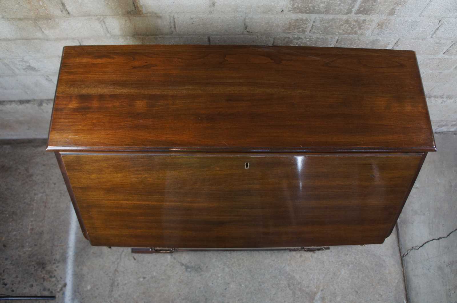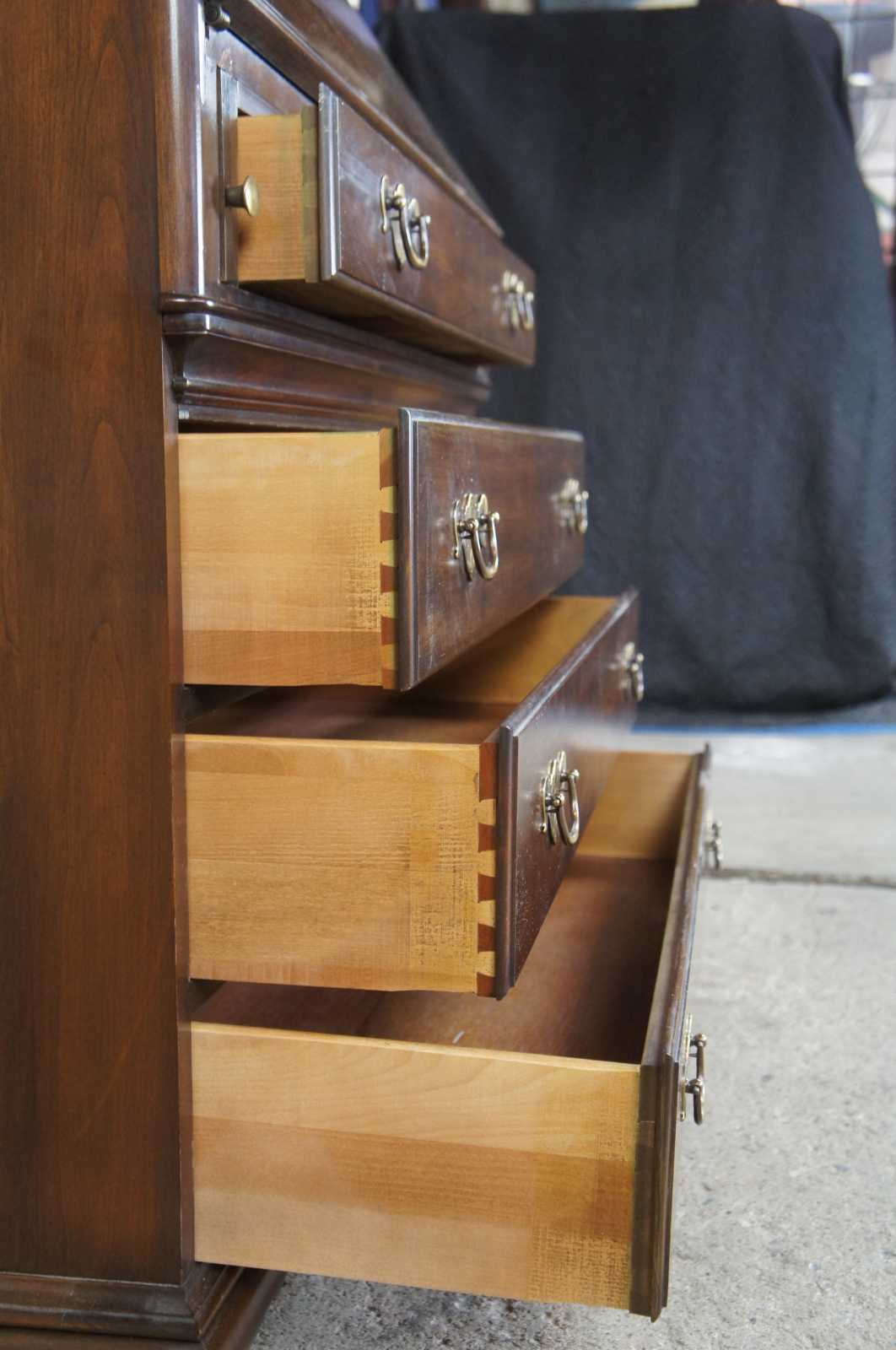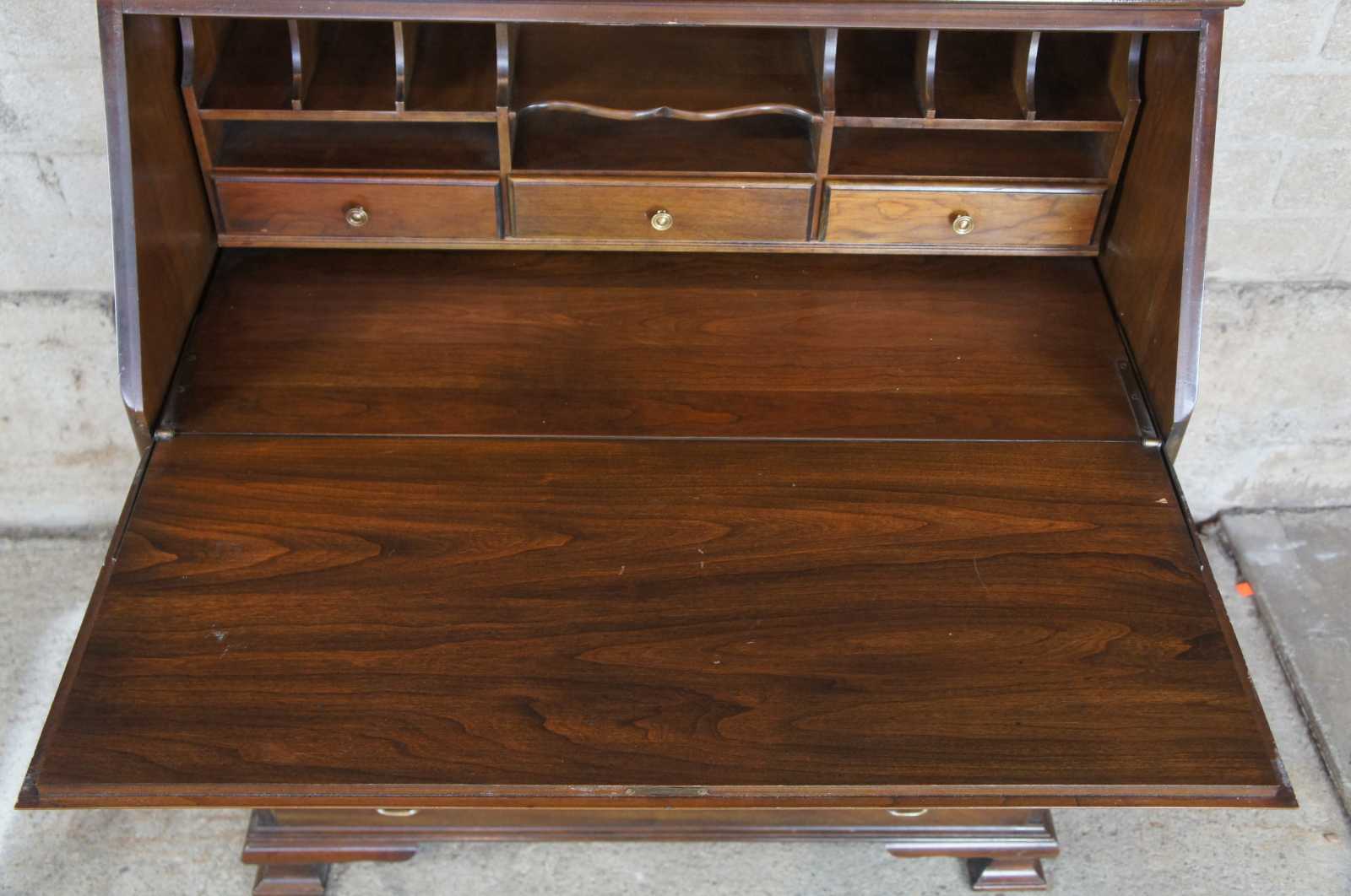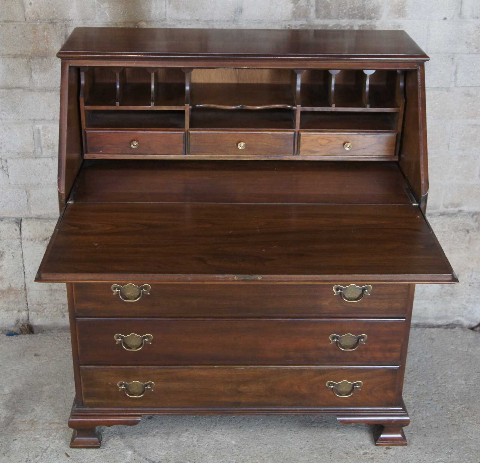 Vintage Pennsylvania House secretary desk. Features a slant front that opens to a writing surface and multiple cubbies / drawers, over four drawers and bracket feet and brass hardware.