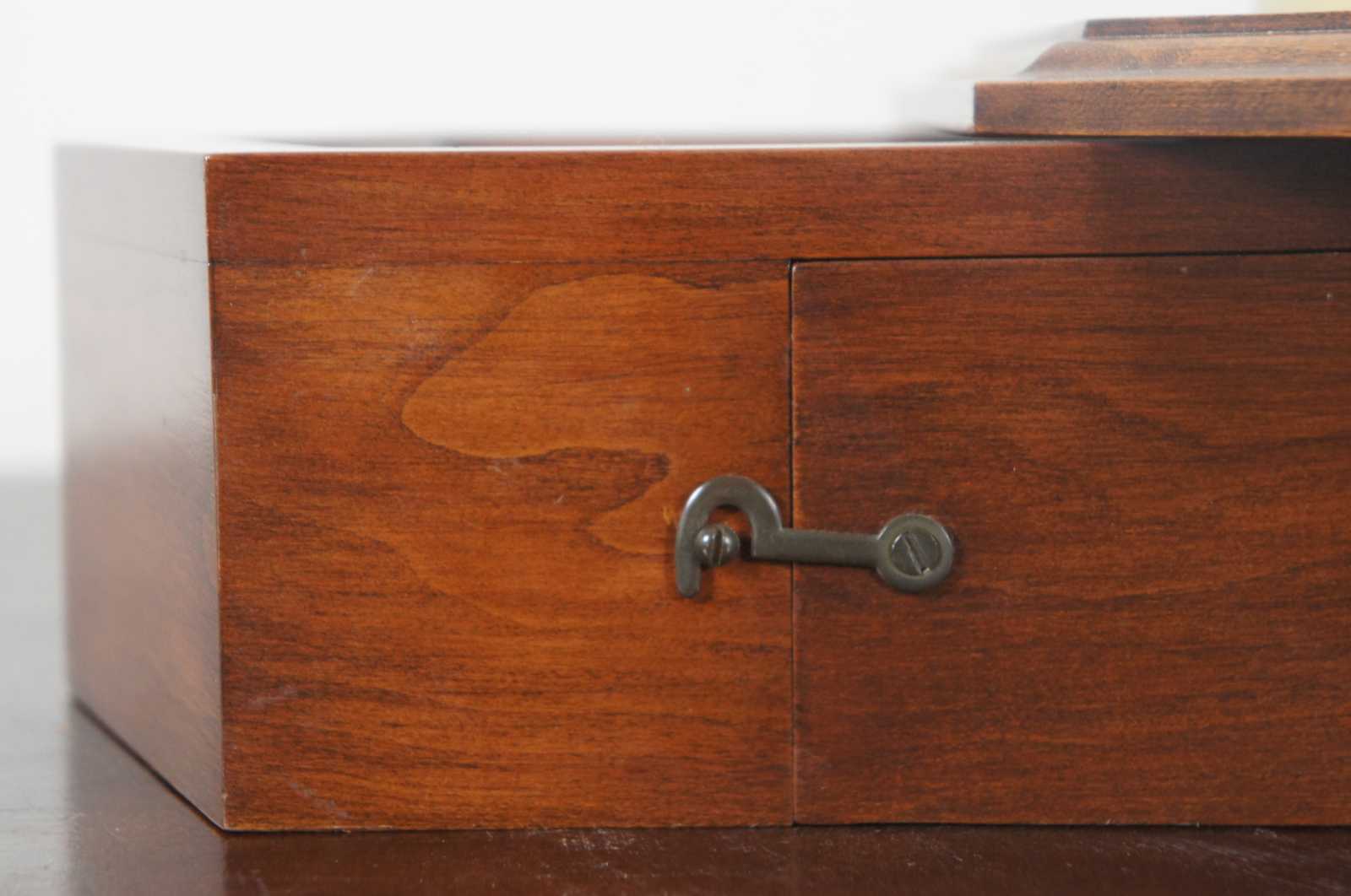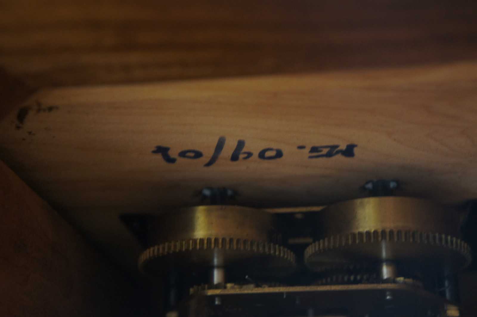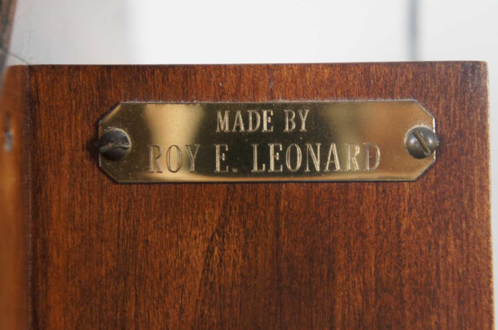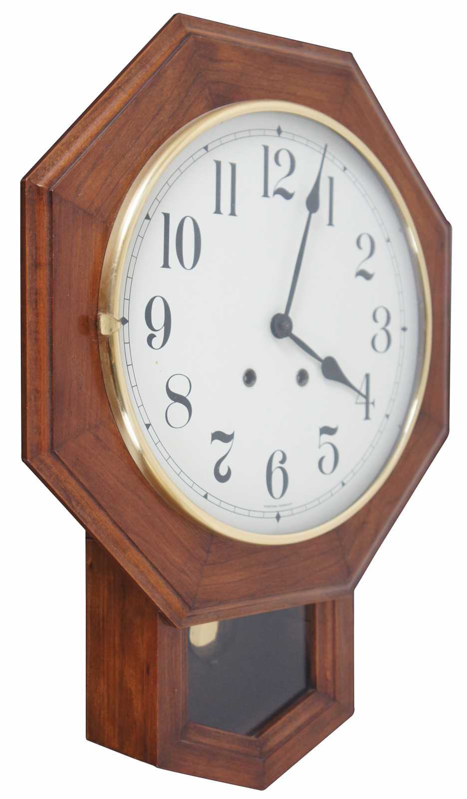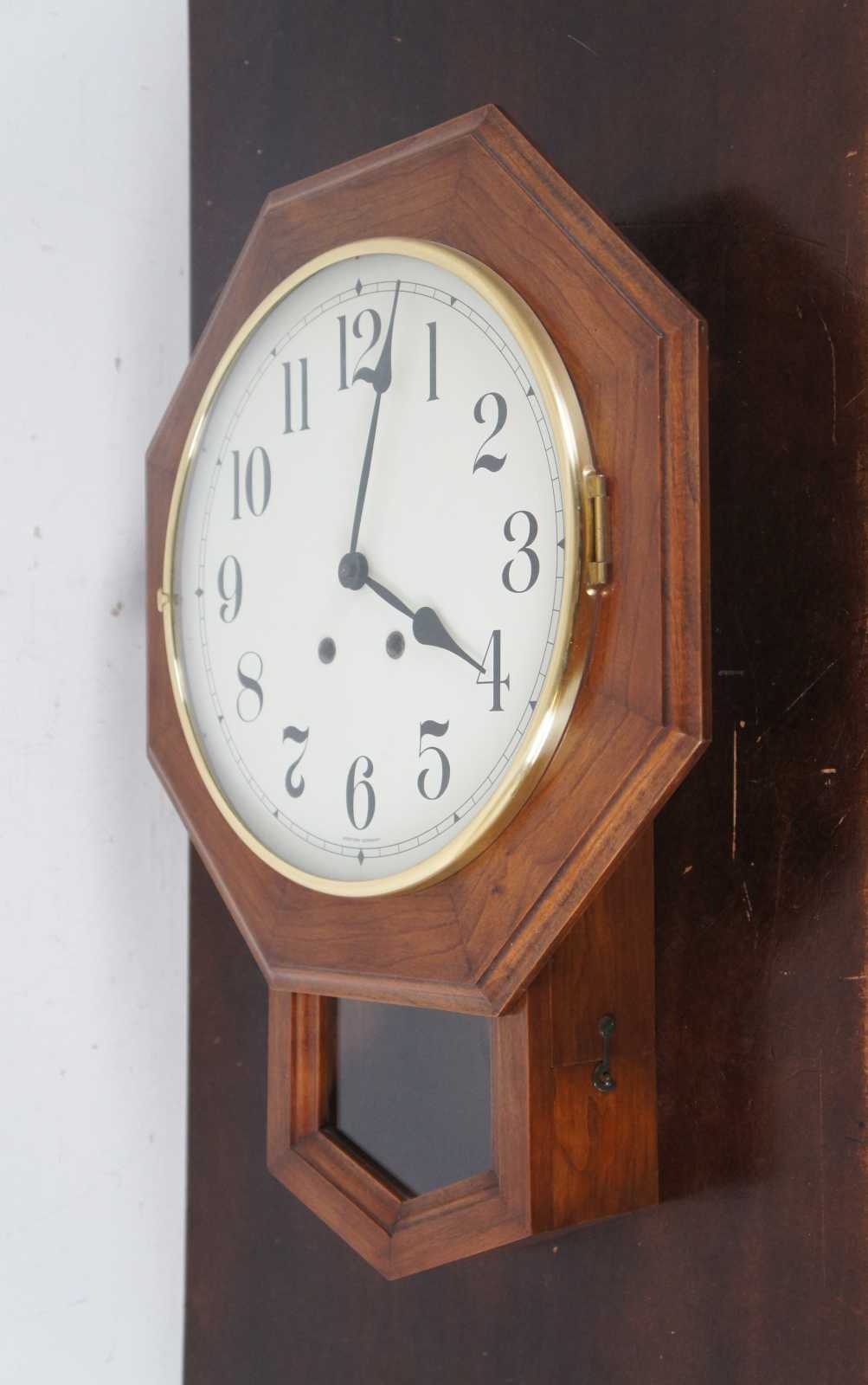 American cherry cased octagonal wall clock made with Western Germany works, key wound movements and short drop pendulum. Made by Roy E. Leonard