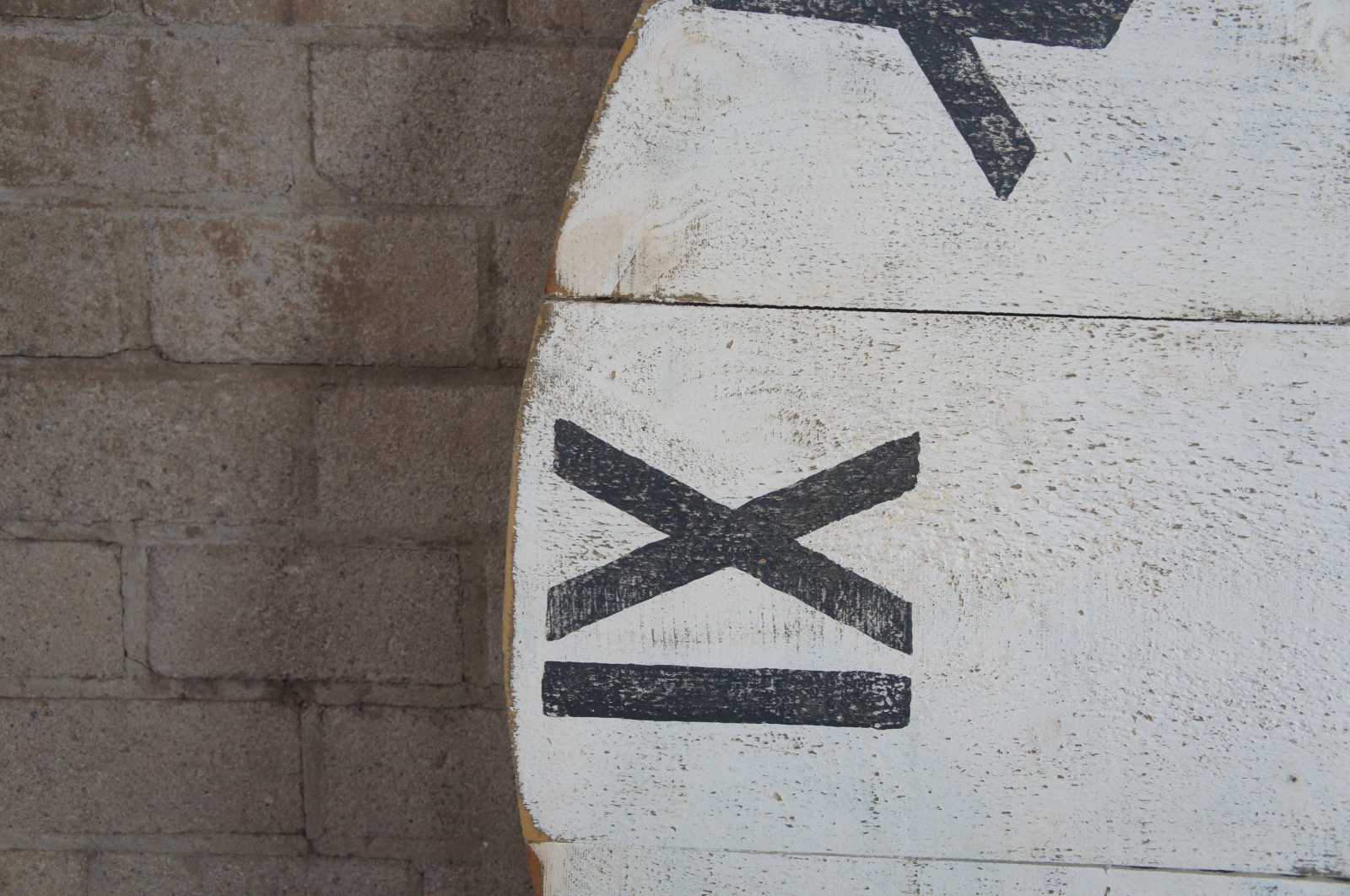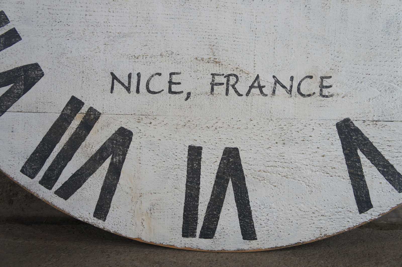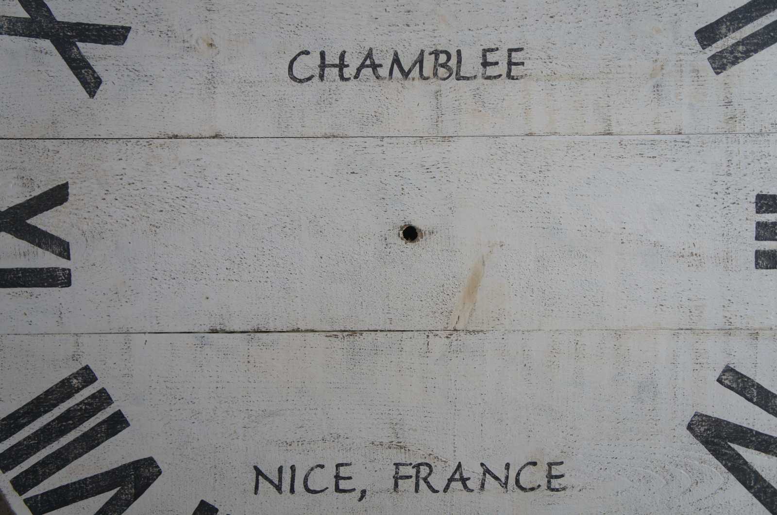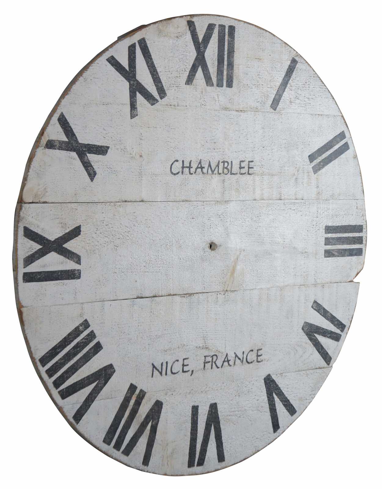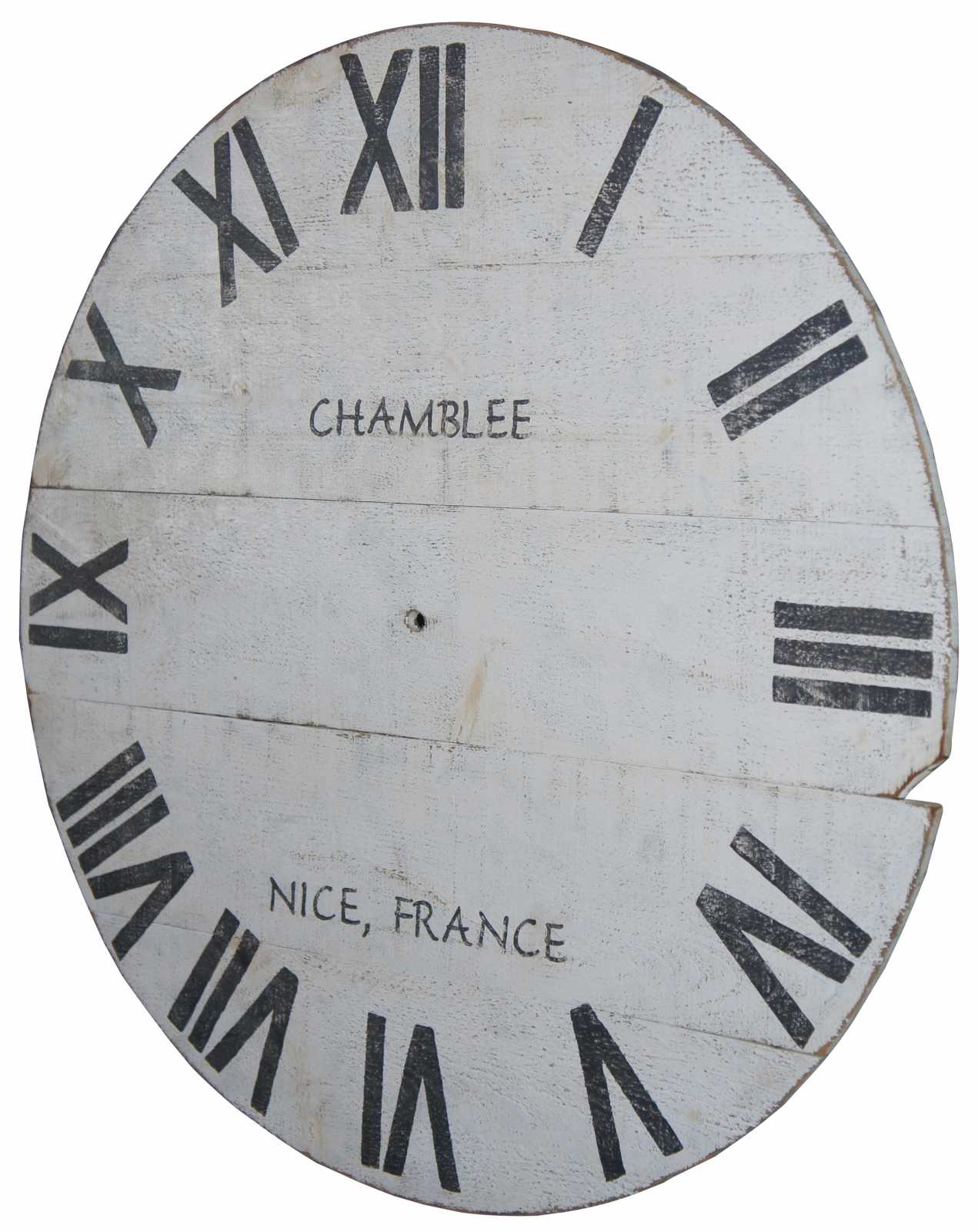Oversized pine wall clock face with roman numerals. Marked Chamlee & Nice, France. Great for display along a wall or over mantel.