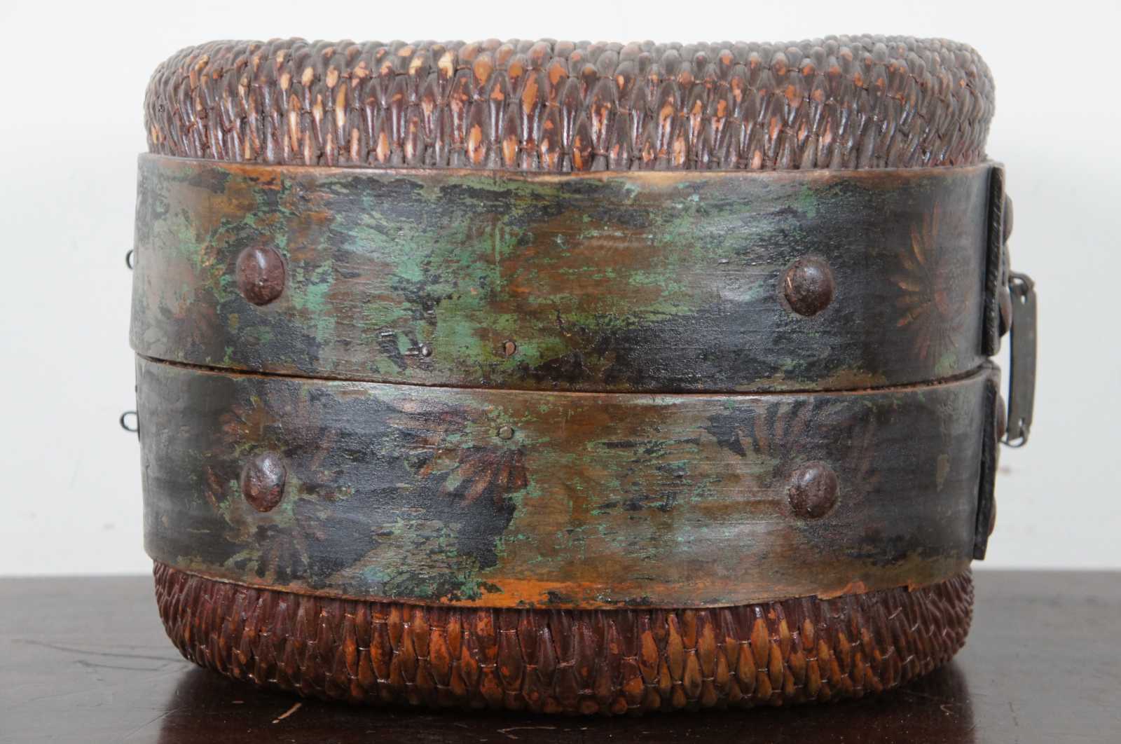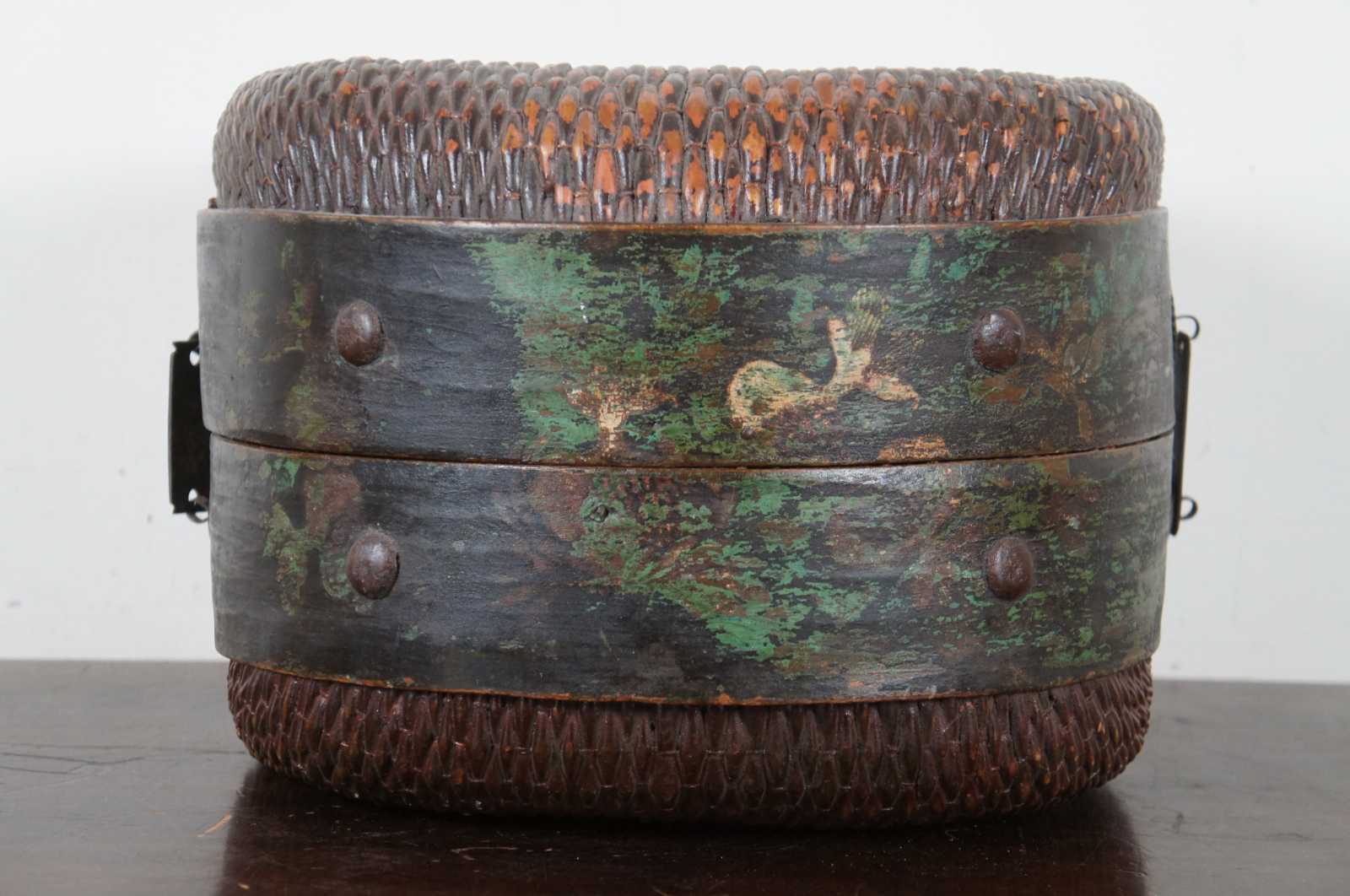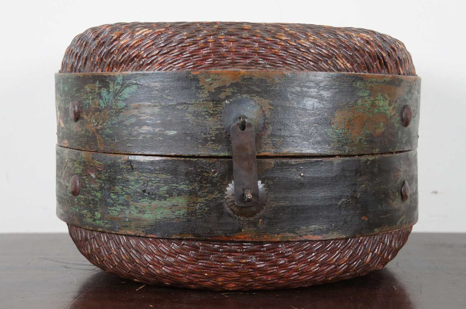 Antique Mongolian round woven willow basket with hinged lid, with hand painted band around the middle and a hasp latch. These primitive baskets were carried by horses and camels to carry grain, rice and other foods. Circa 1900s.