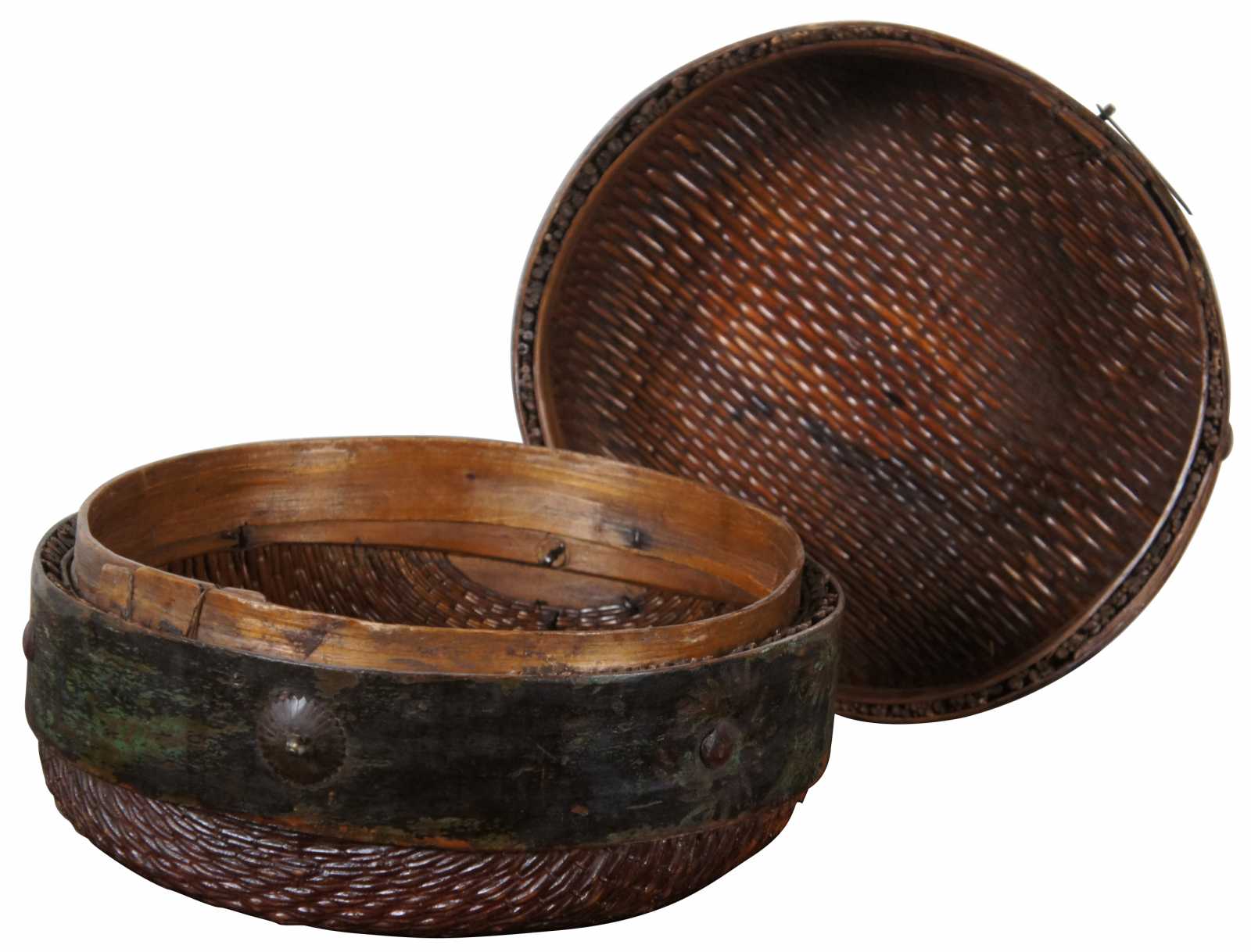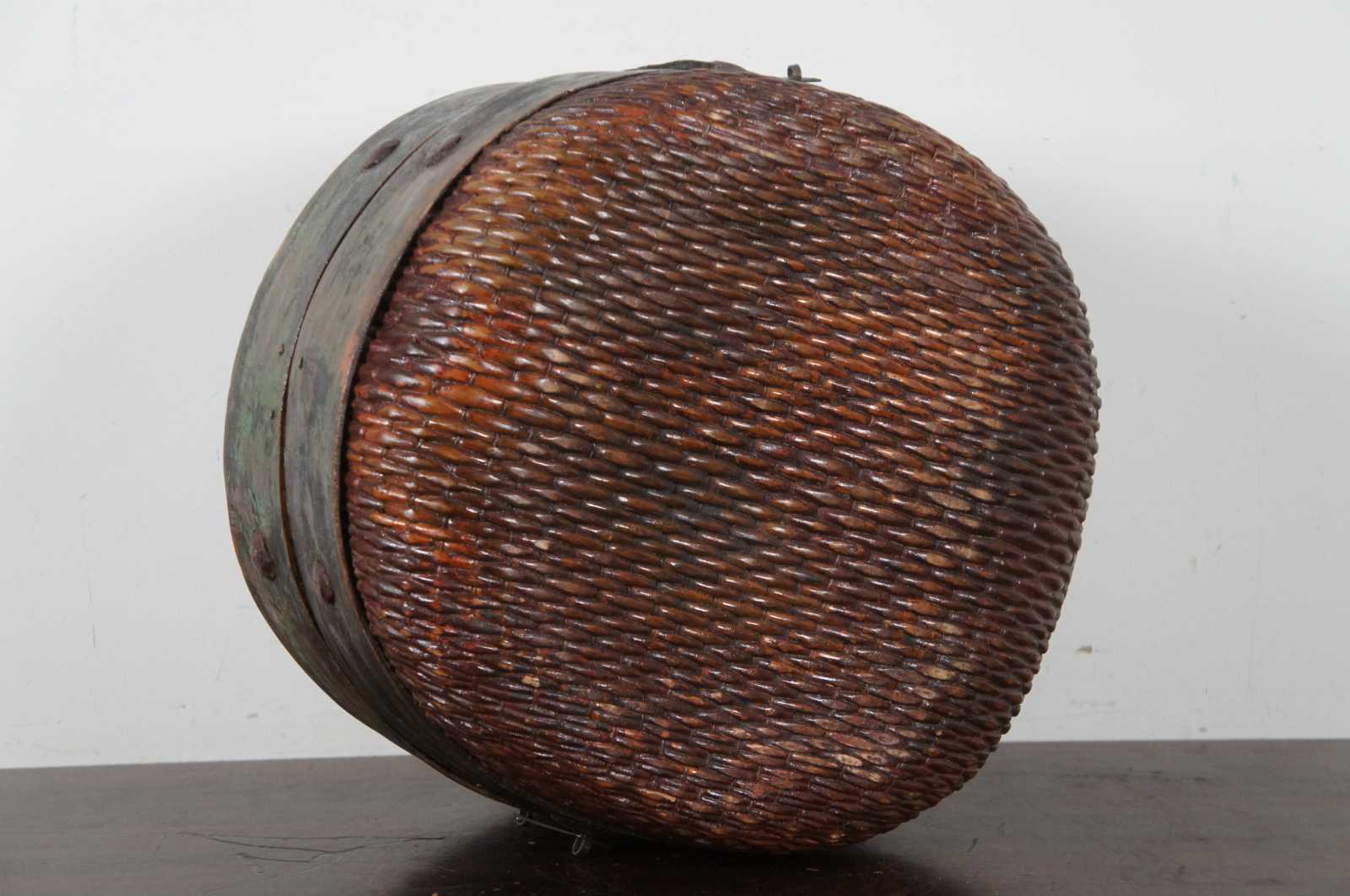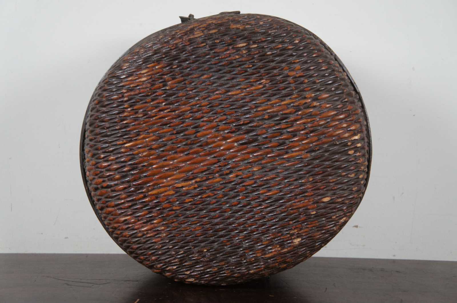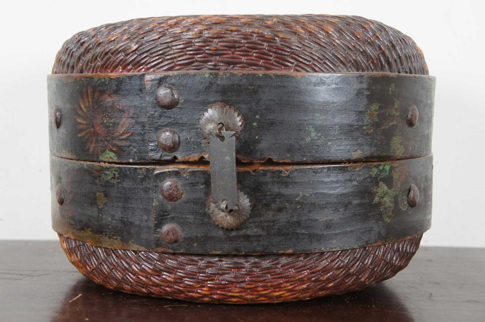 Antique Mongolian round woven willow basket with hinged lid, with hand painted band around the middle and a hasp latch. These primitive baskets were carried by horses and camels to carry grain, rice and other foods. Circa 1900s.