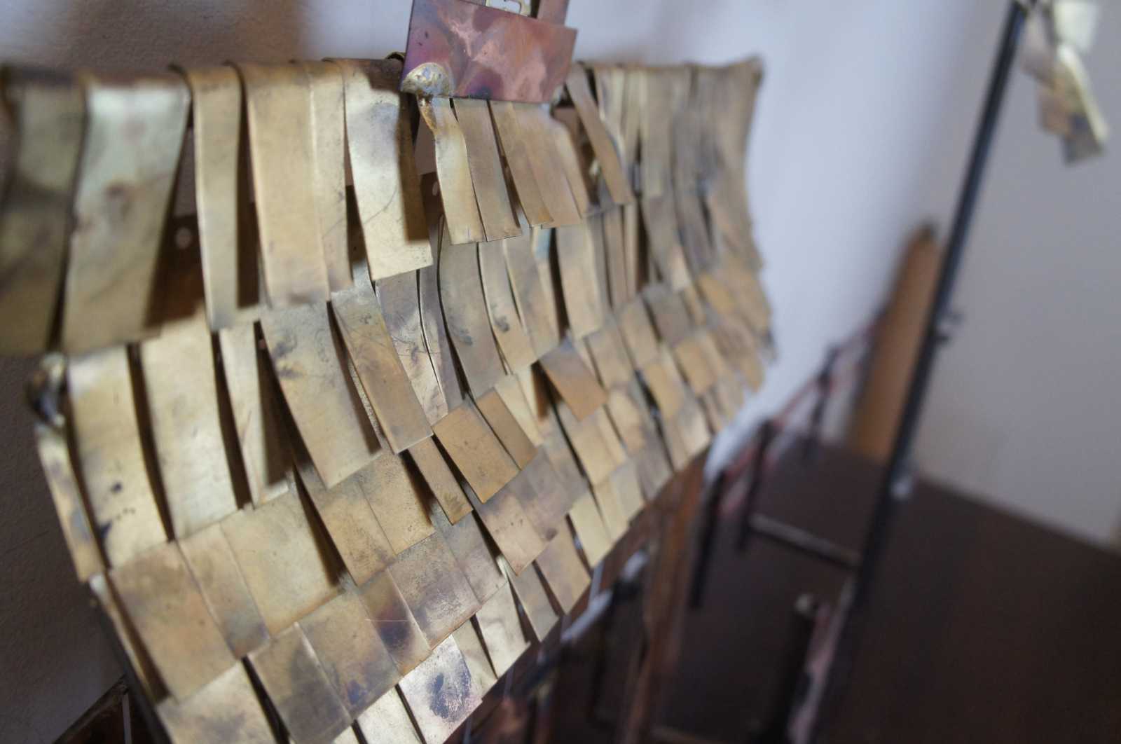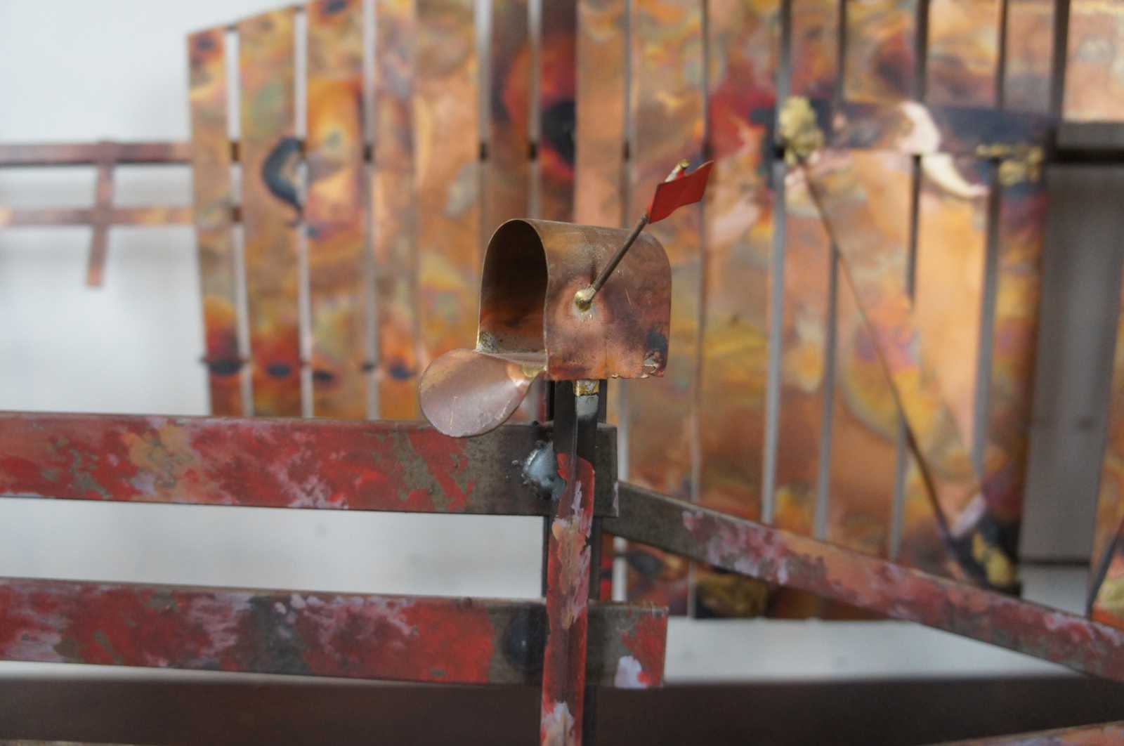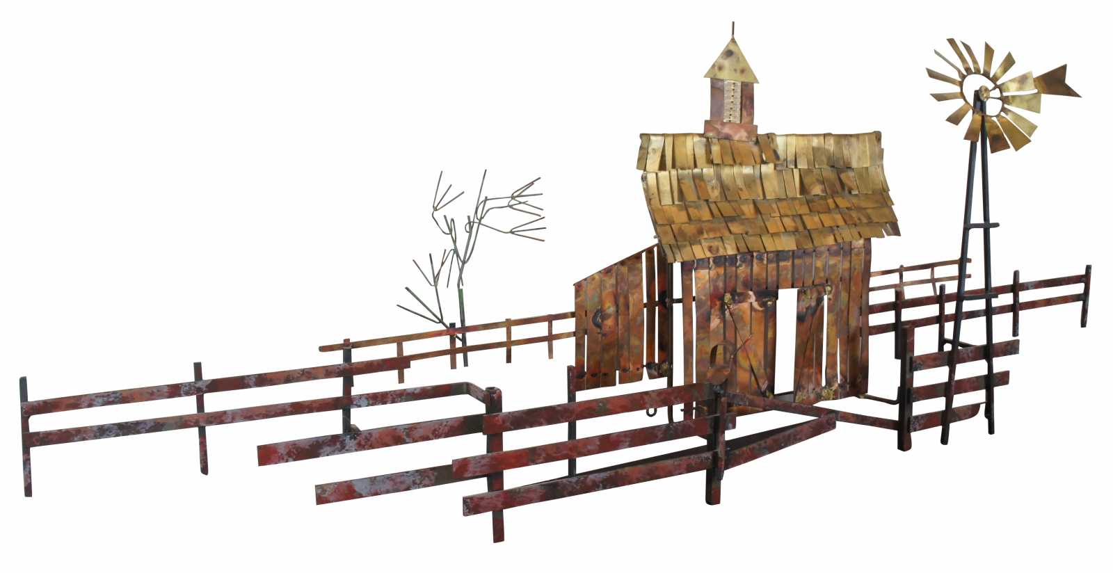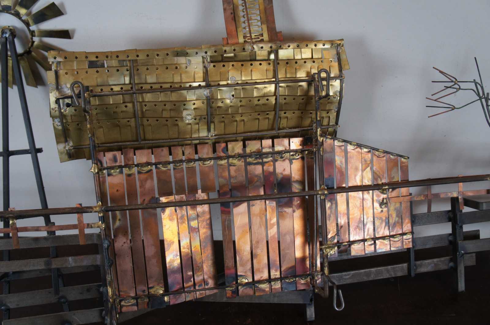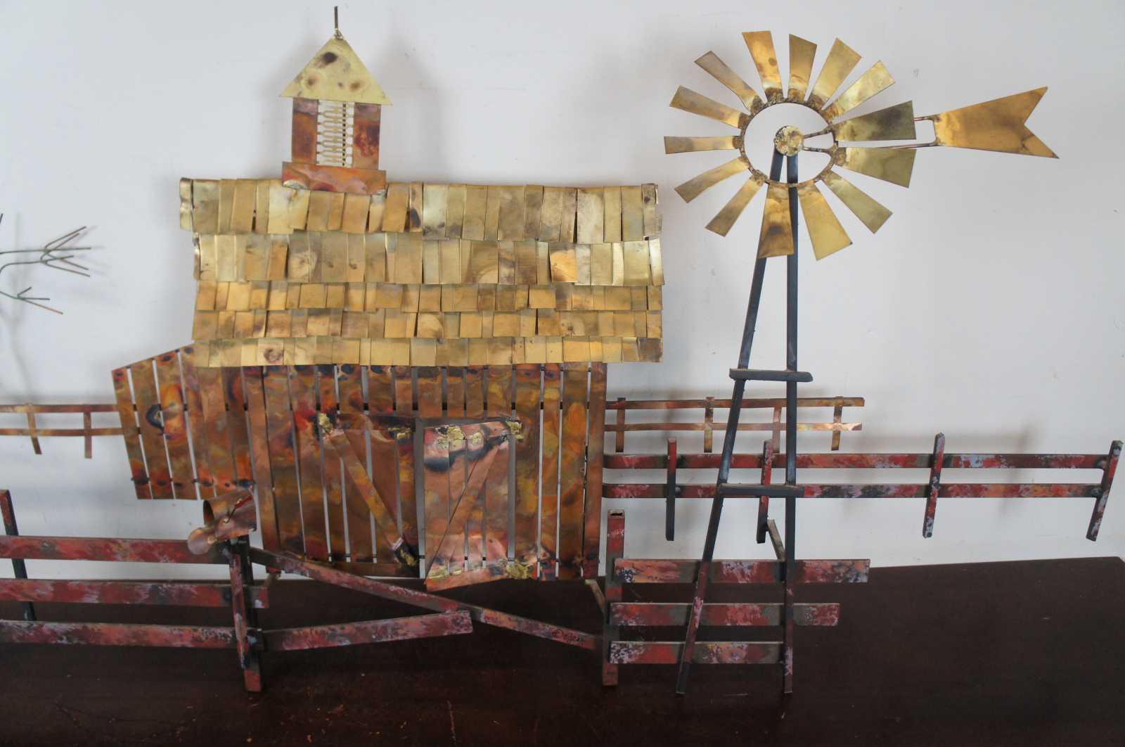 Vintage Curtis Jere cut metal and copper wall sculpture. Features a country or farmhouse scene with a barn, primitive fence, farm windmill / weather vane.