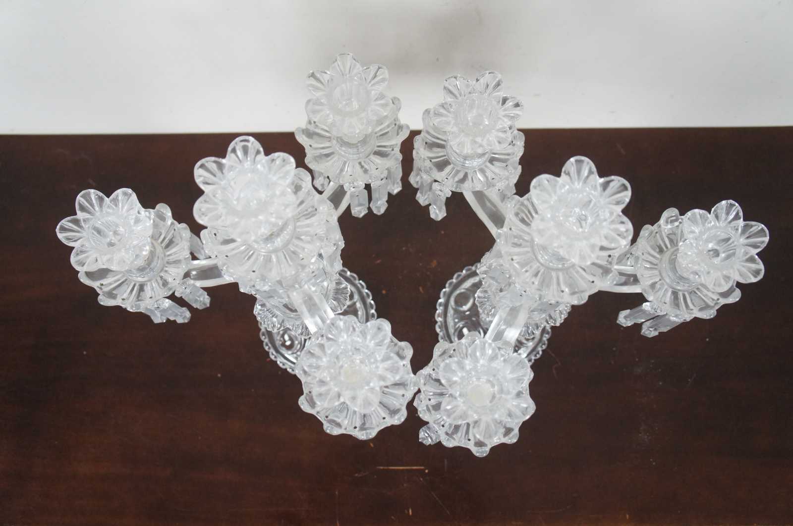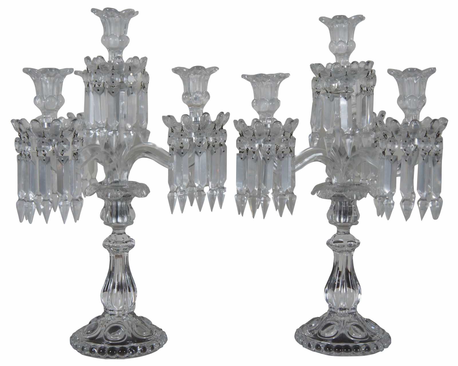 Pair of elegant Baccarat cut crystal candelabras with four flower shaped bobeches / candle holders surrounded by drop crystals / prisms. Marked on base. Made in France.