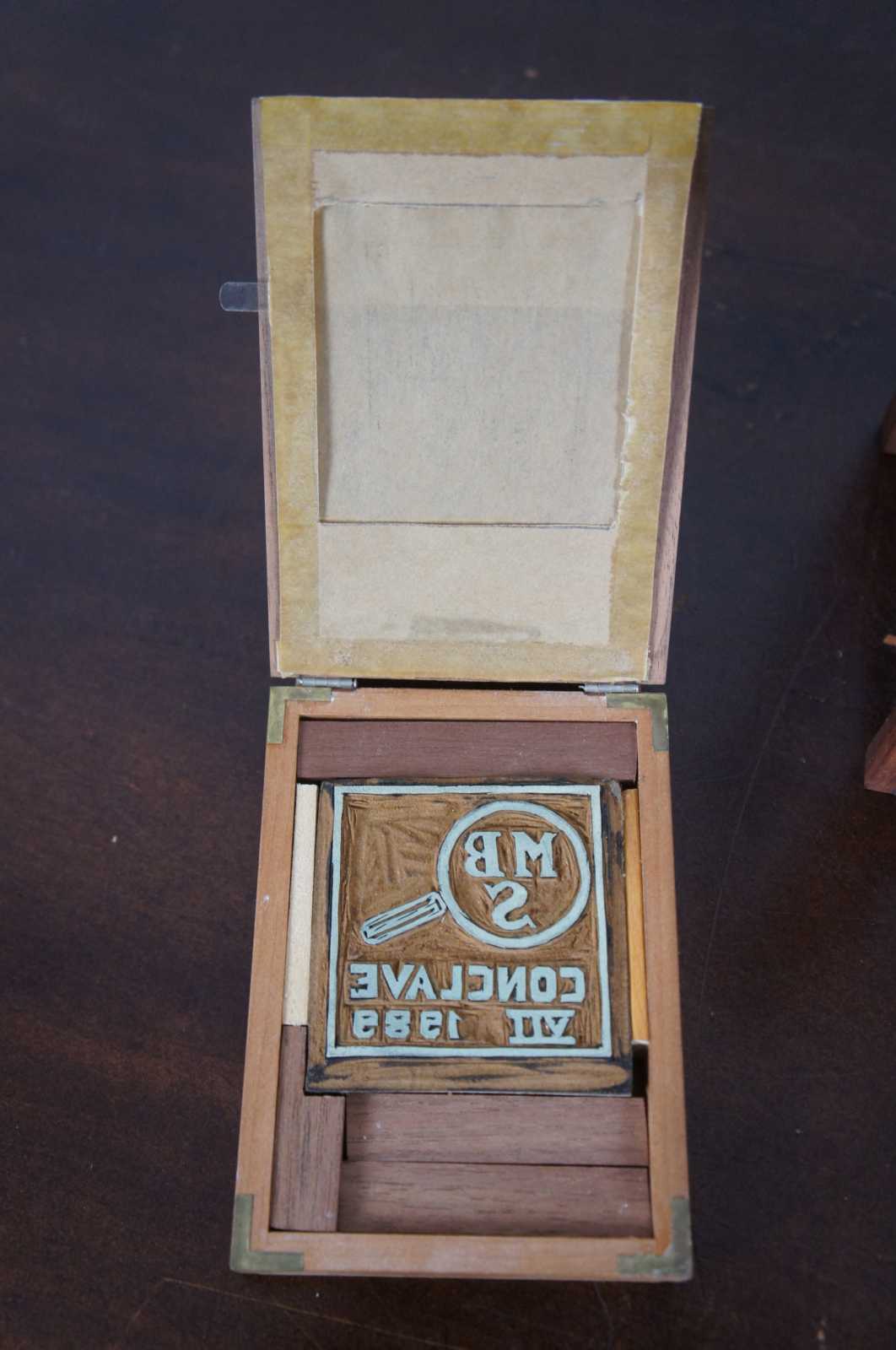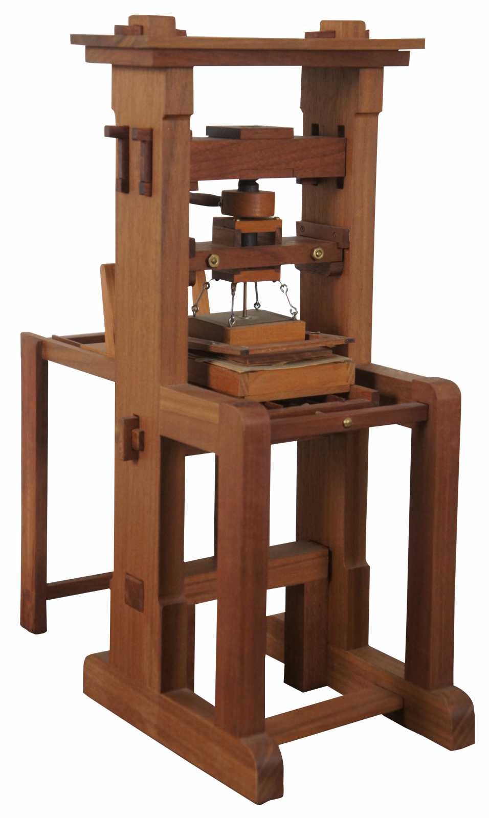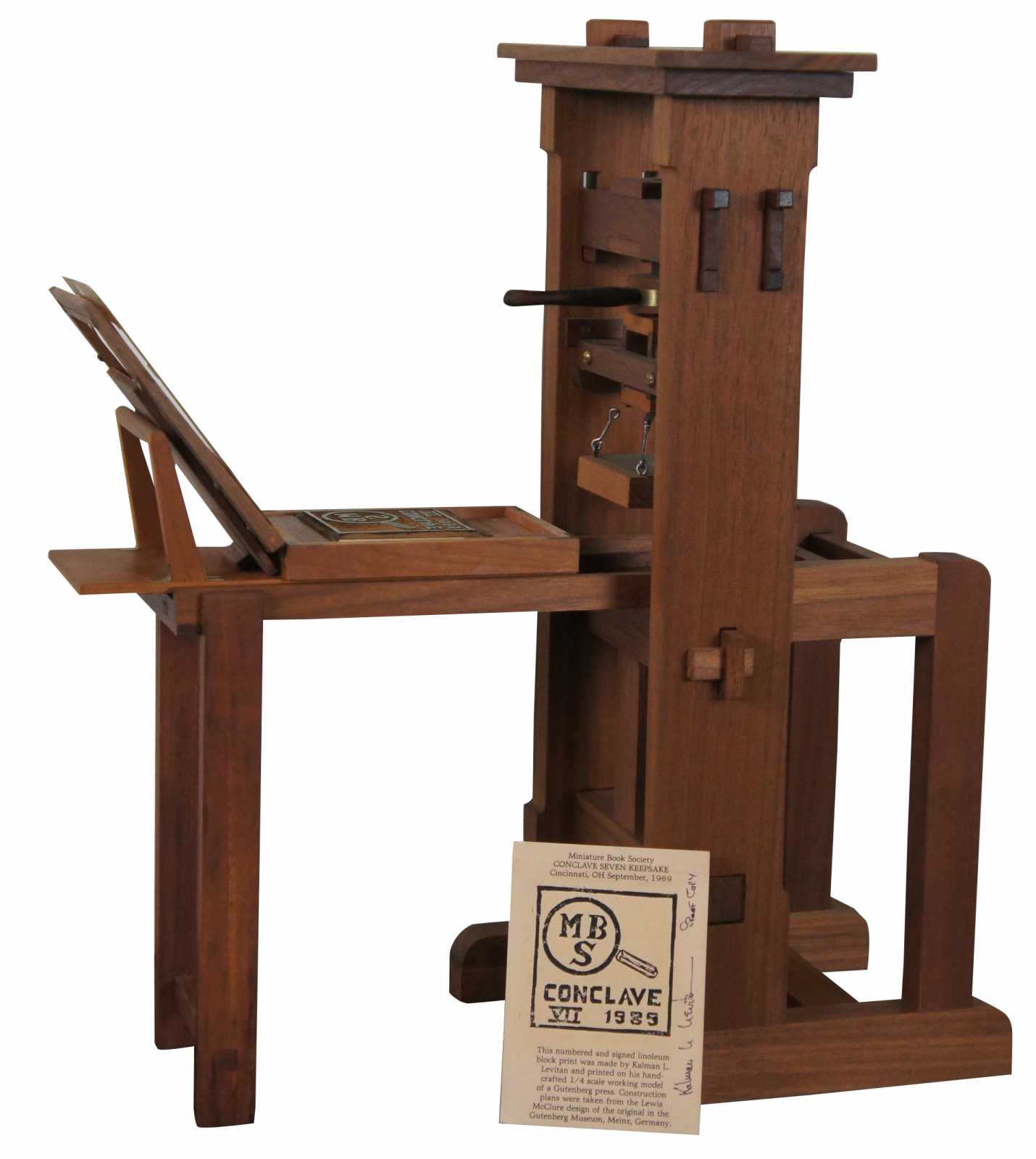 Vintage 1989 ¼ scale model Gutenberg printing press from the Miniature Book Society’s Conclave Seven Keepsake, including linoleum block print made by Kalman L. Levitan.