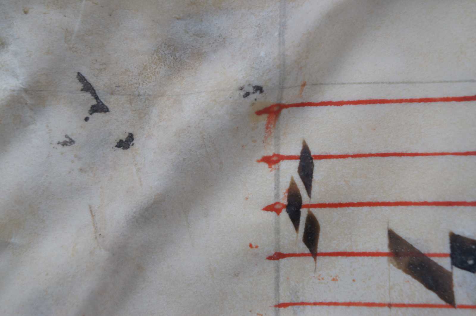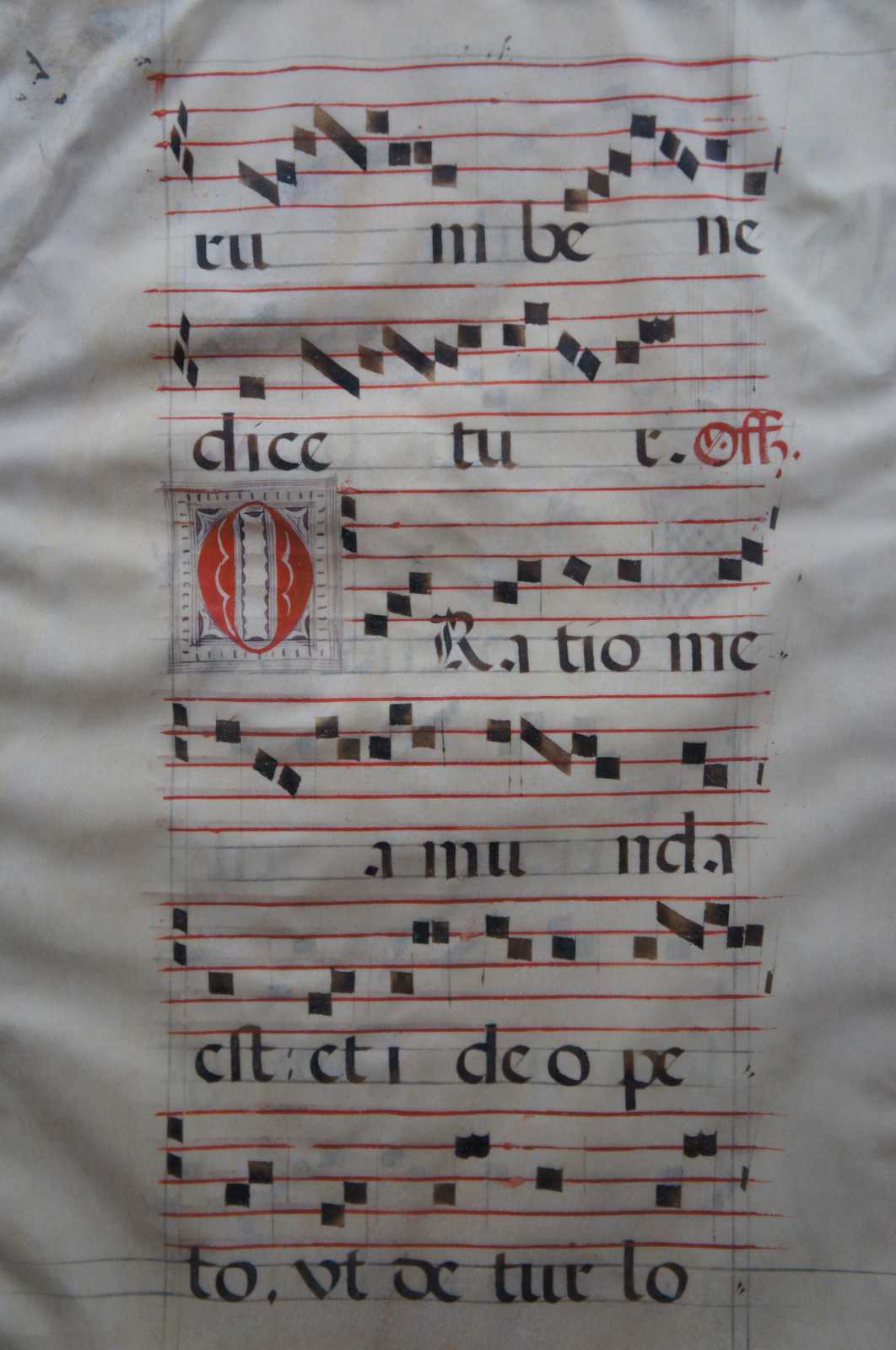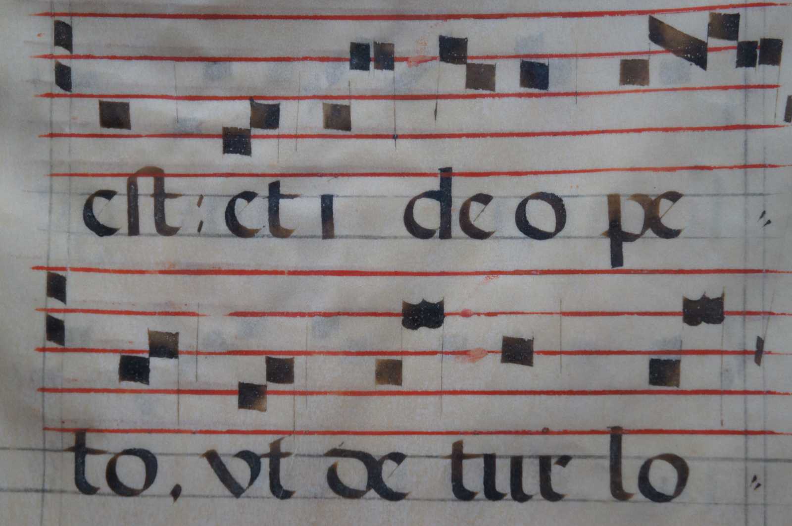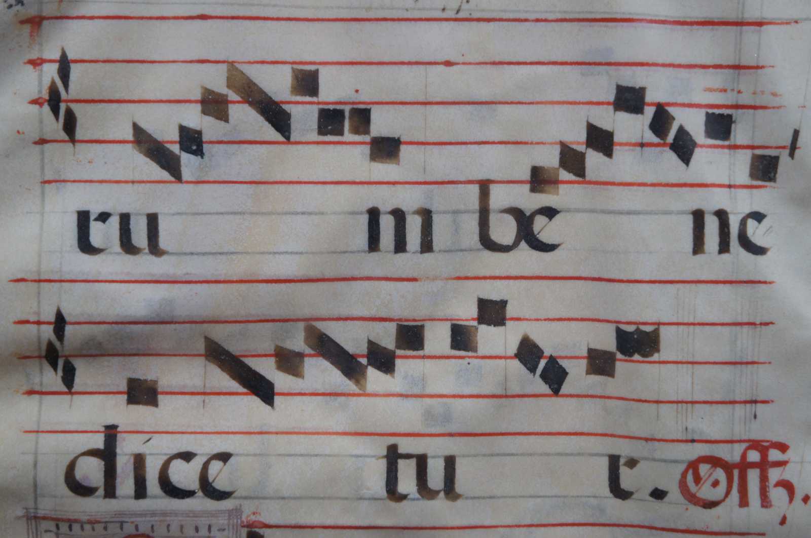 Framed 17th century Roman Catholic sheet music hand written in Latin on vellum in red and black ink.