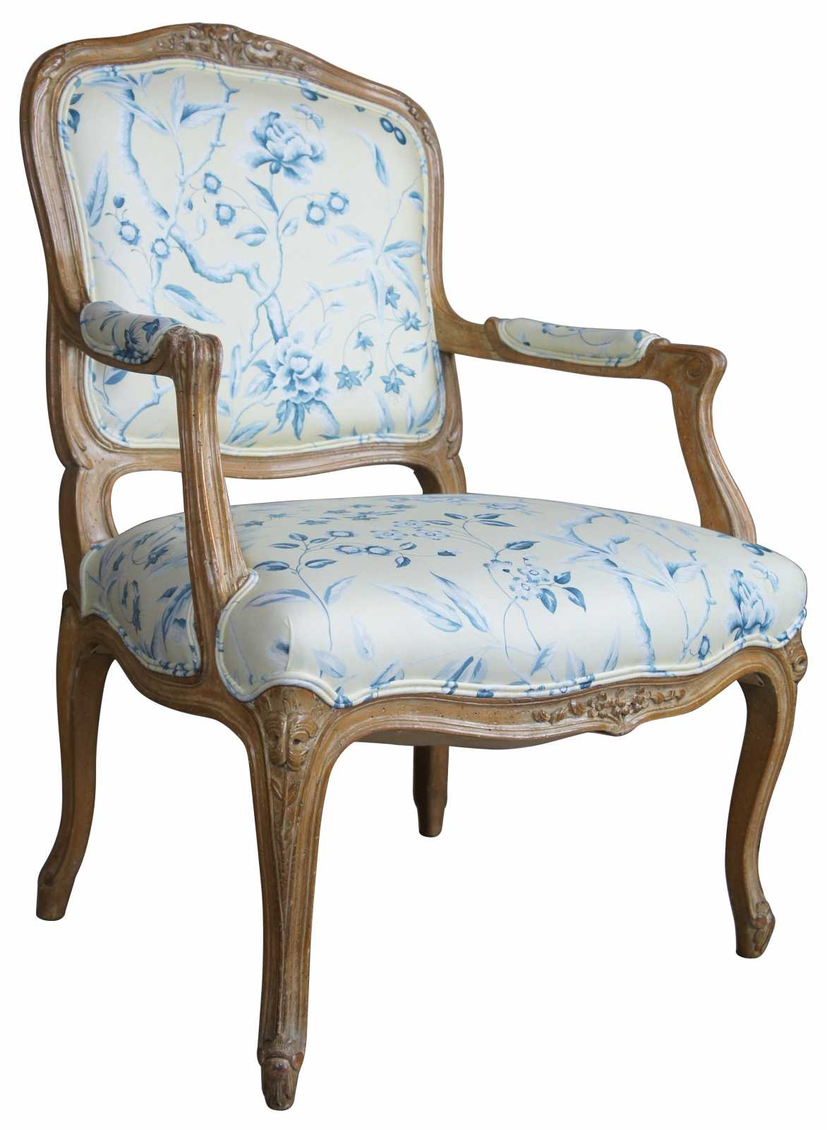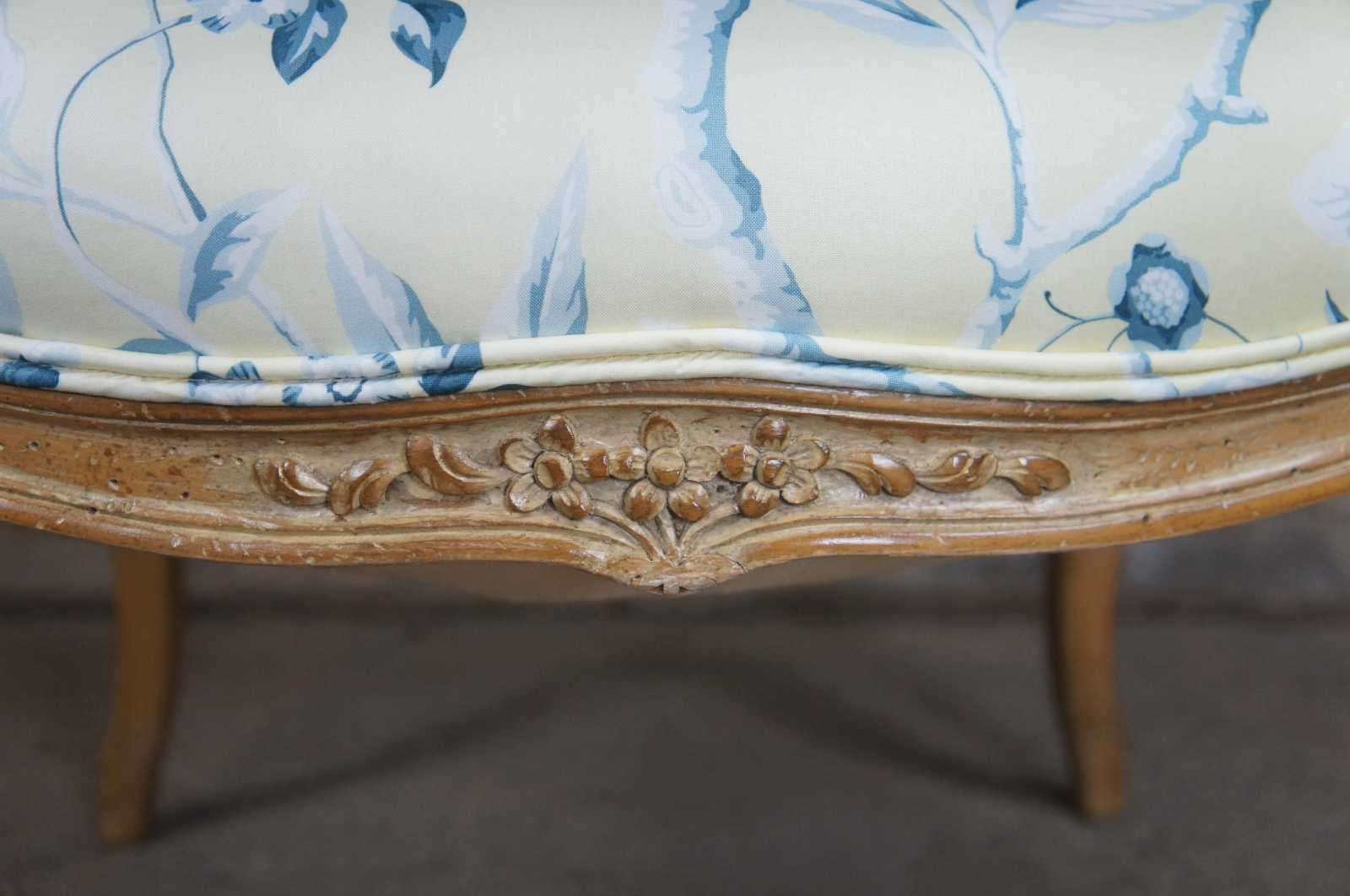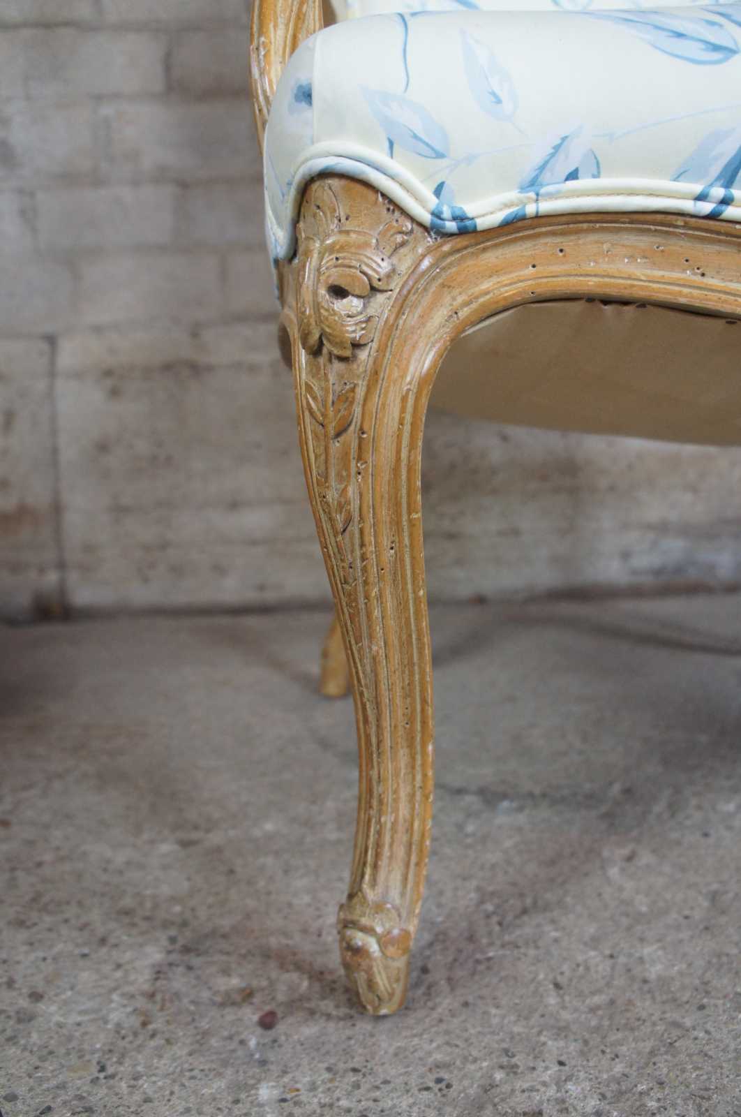 A beautiful pair of early 20th century Louis XV arm chairs. Elegantly carved with floral accents over a distressed white washed frame. Features an off yellow upholstery with a blue topical floral print and couble cording. Includes matching lumbar and throw pillows