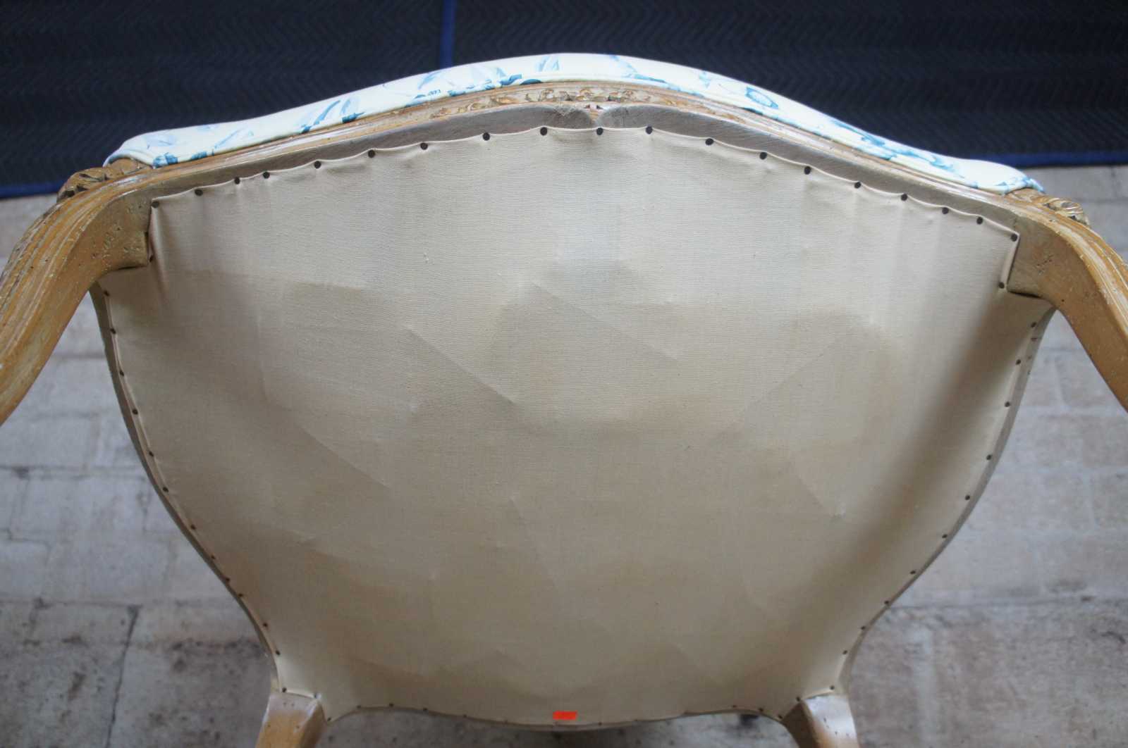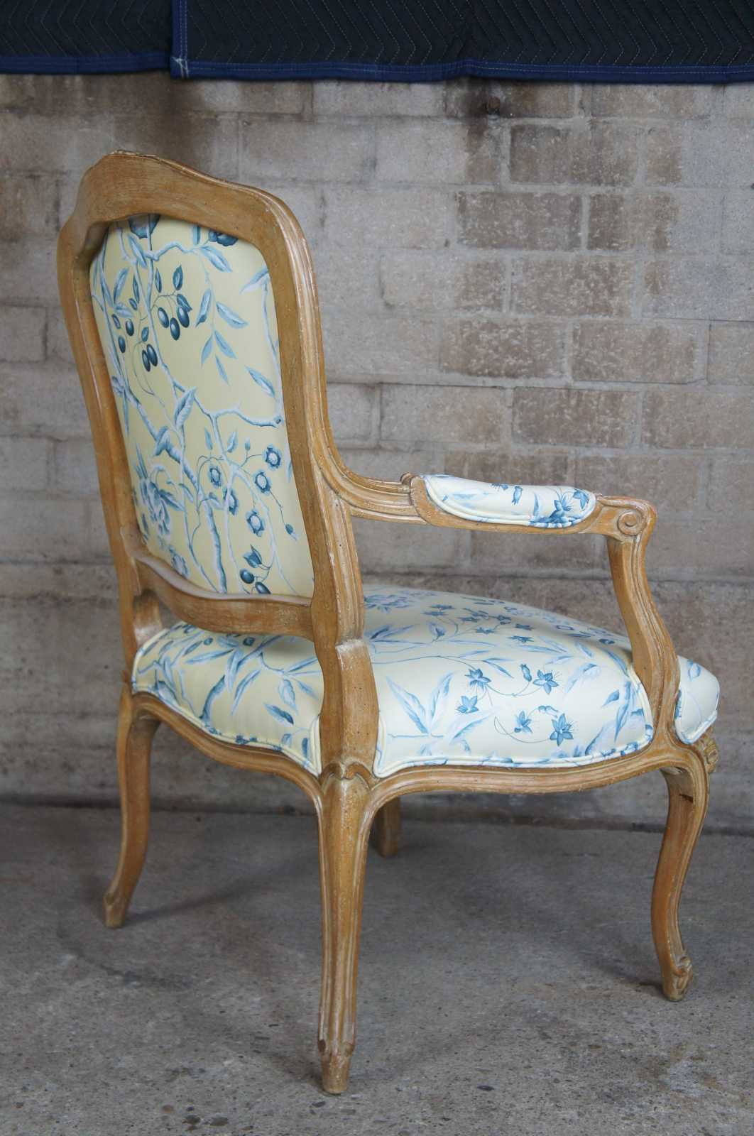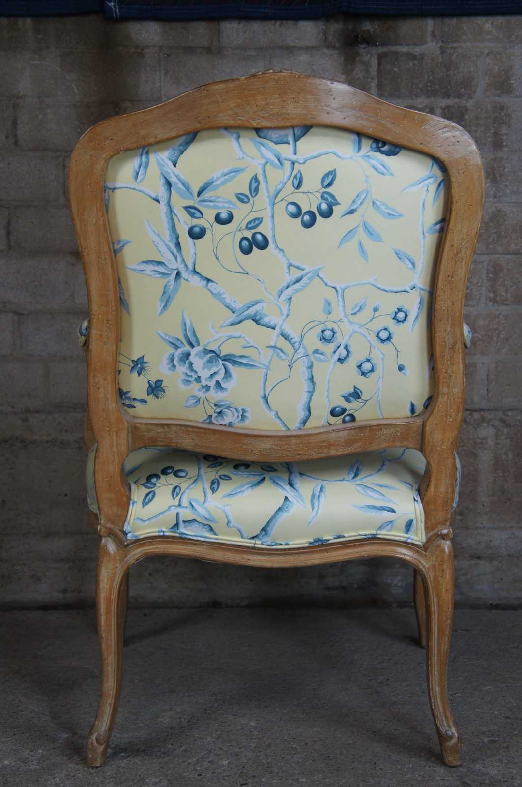 A beautiful pair of early 20th century Louis XV arm chairs. Elegantly carved with floral accents over a distressed white washed frame. Features an off yellow upholstery with a blue topical floral print and couble cording. Includes matching lumbar and throw pillows