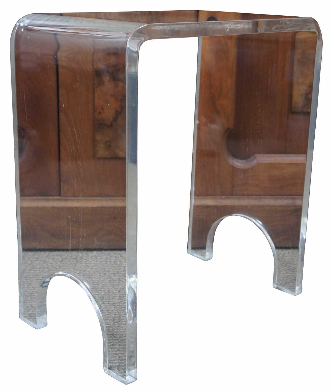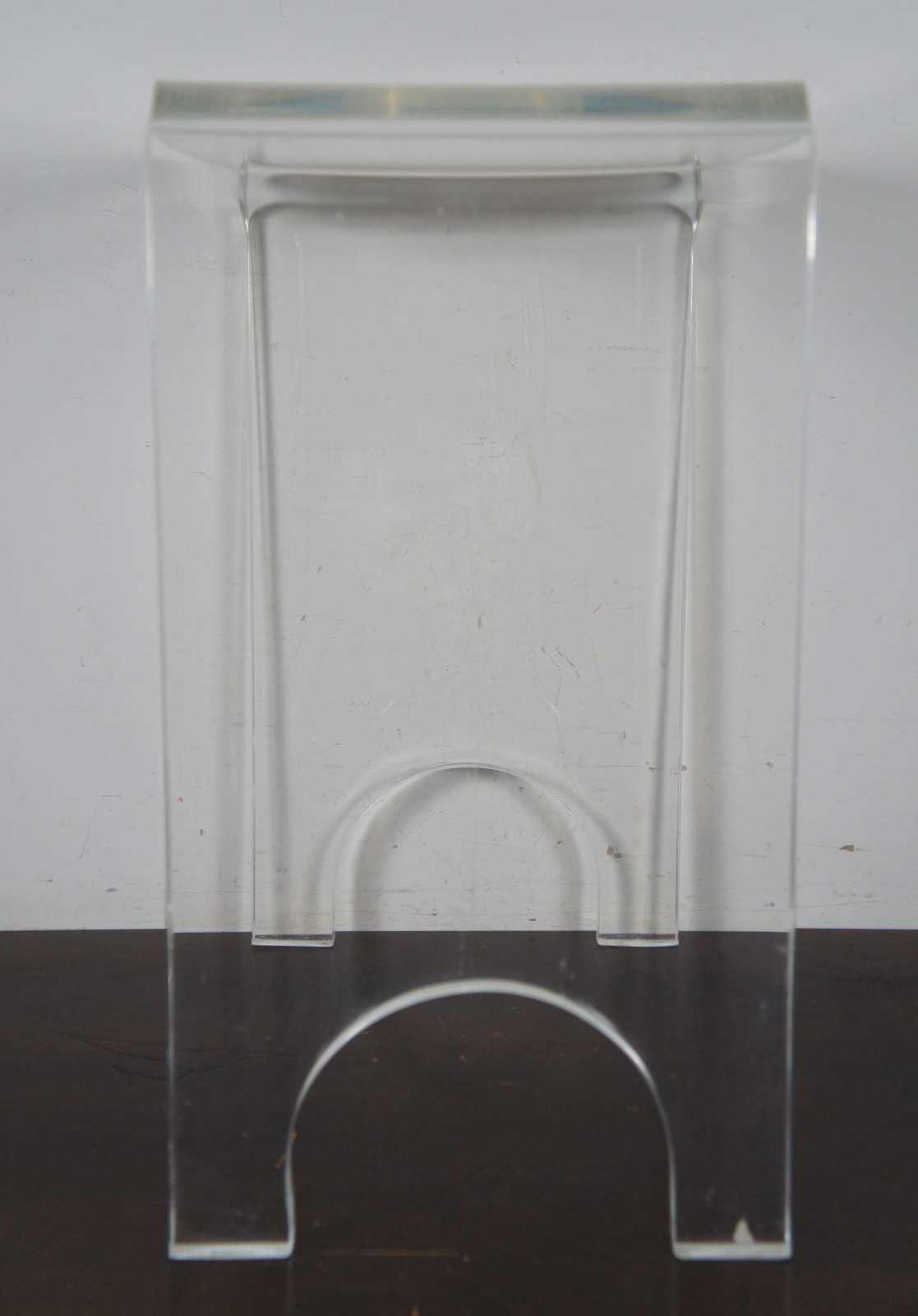 Small molded lucite side table or vanity stool with arched legs and rounded edges.