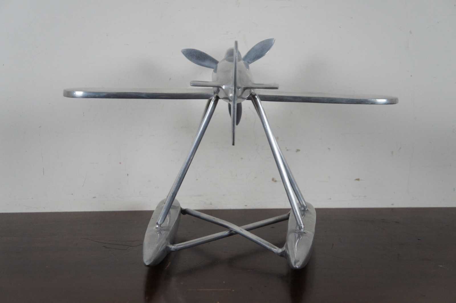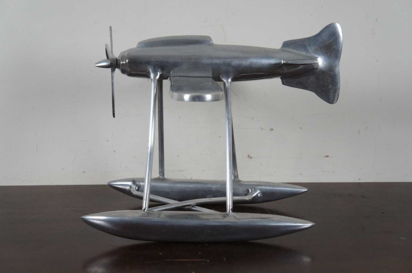 Vintage aluminum model propeller sea plane with pontoons for water landing.