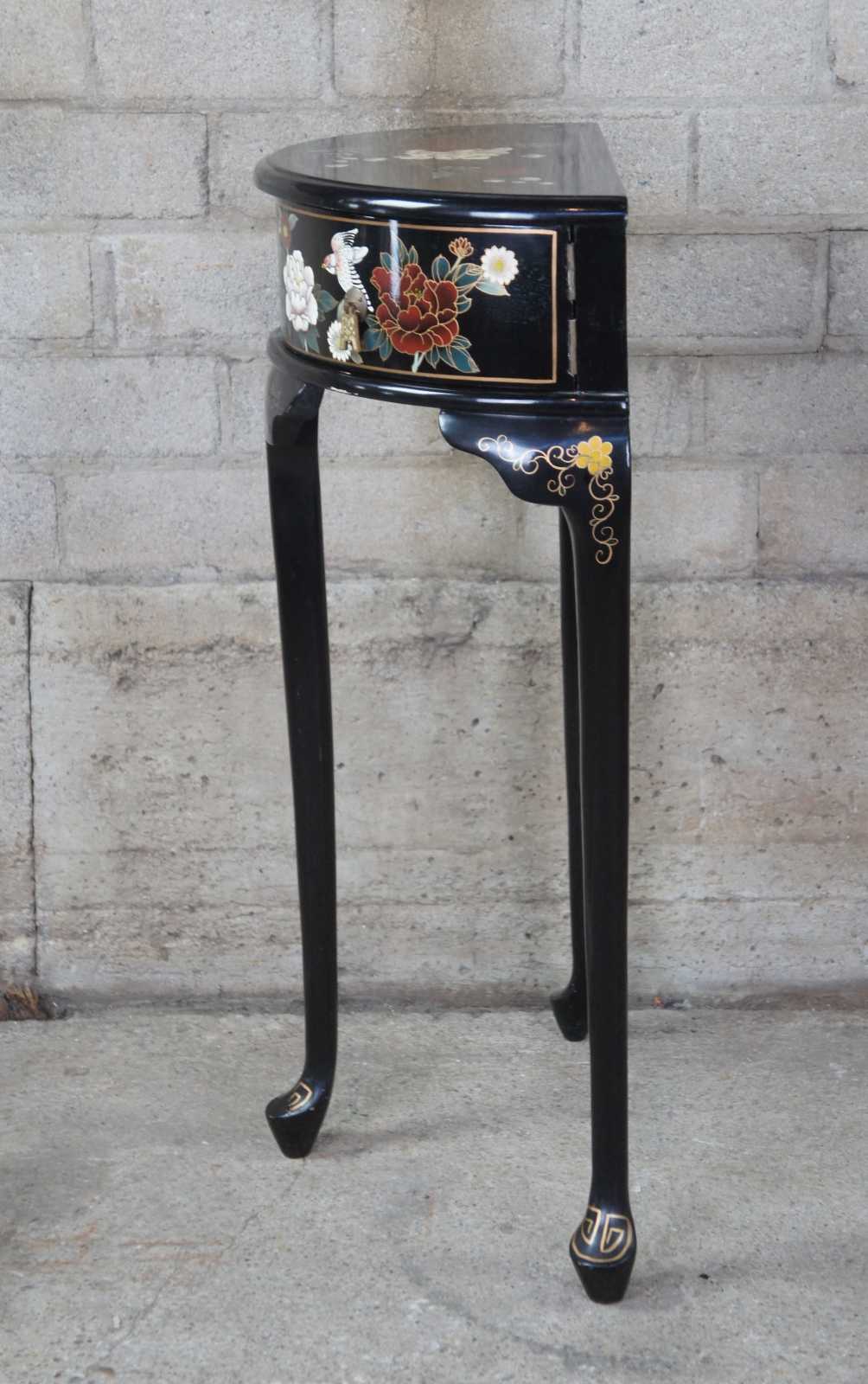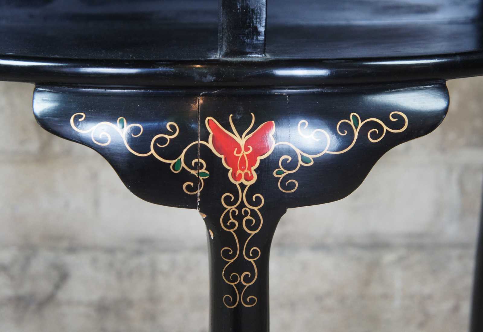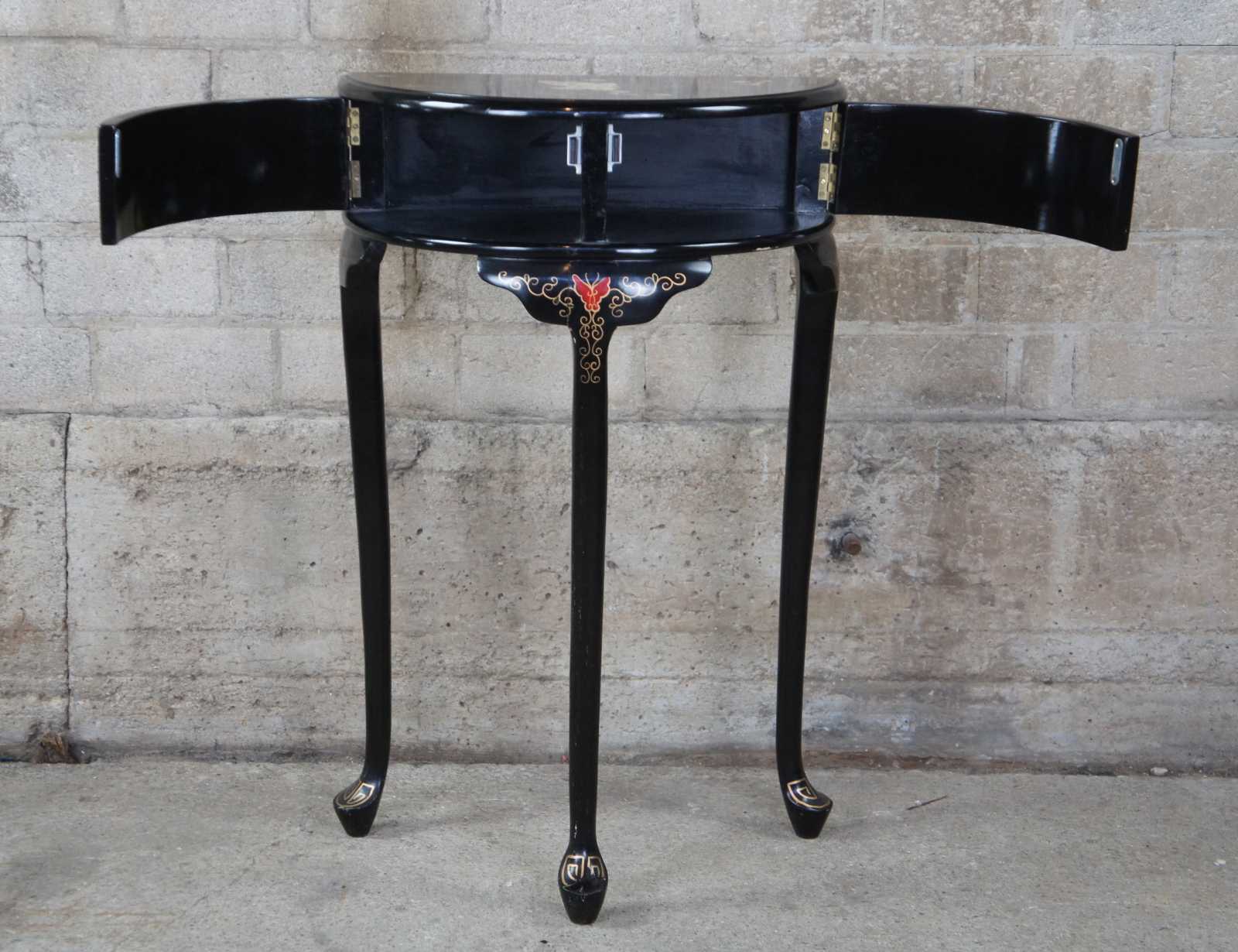 Late 20th Century crescent shaped/demilune hall console. Features a black finish with floral and butterfly motif. Trimmed in gold with two doors that open for storage. The table is supported by long cabriole legs leading to pad foot.