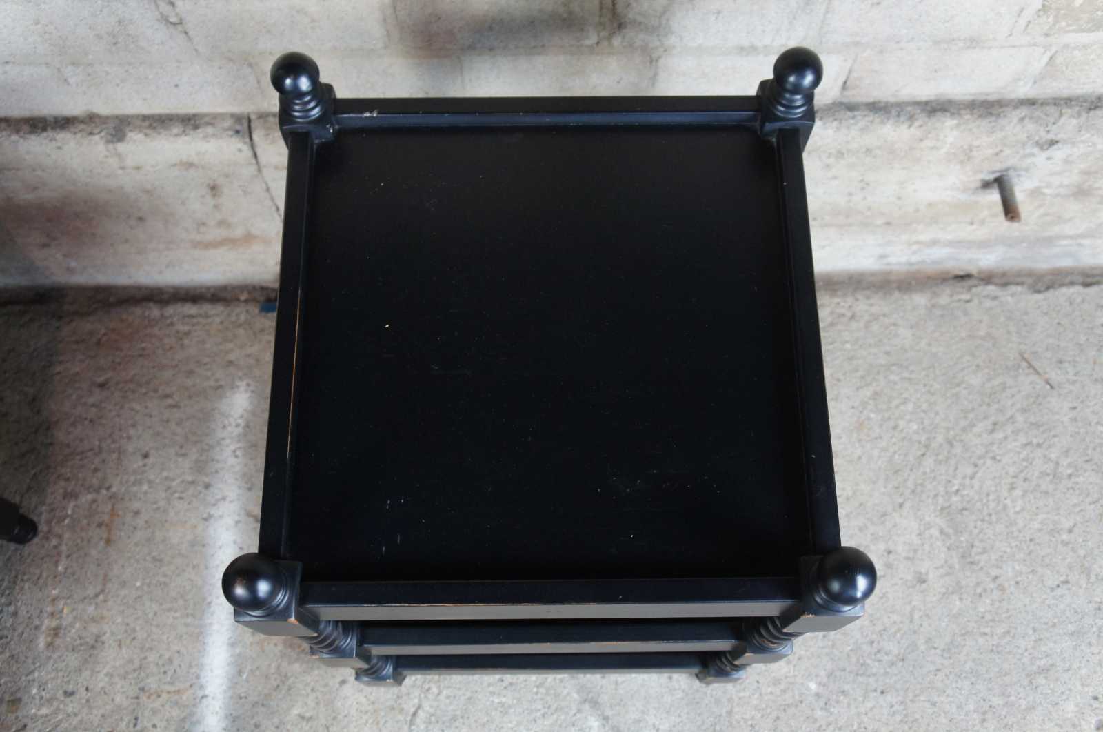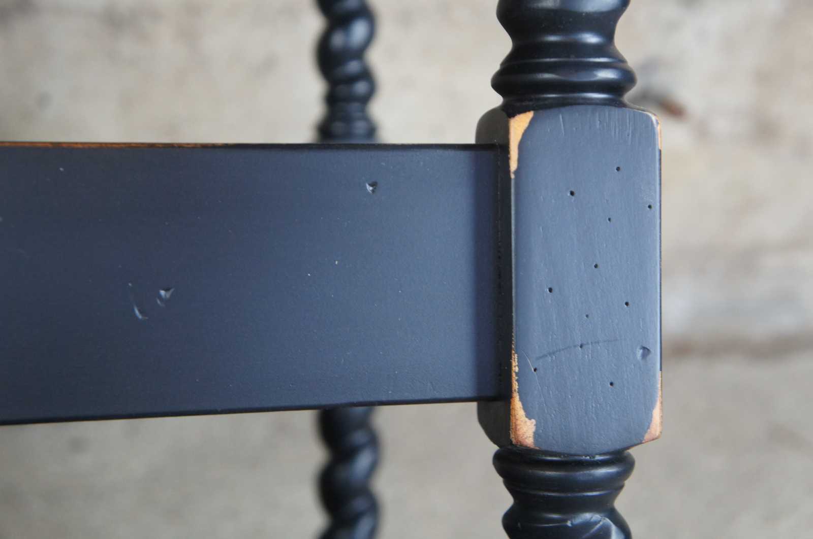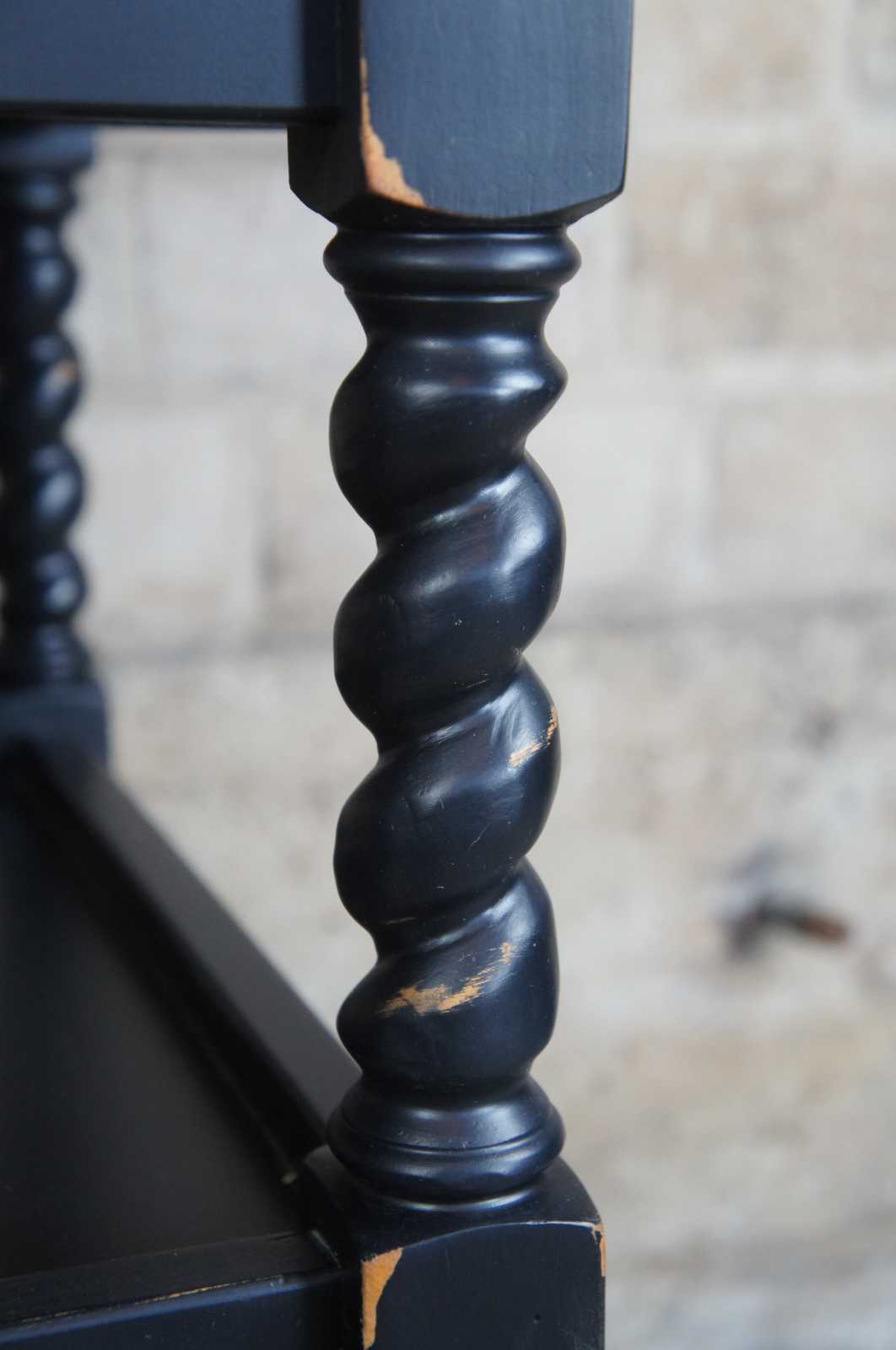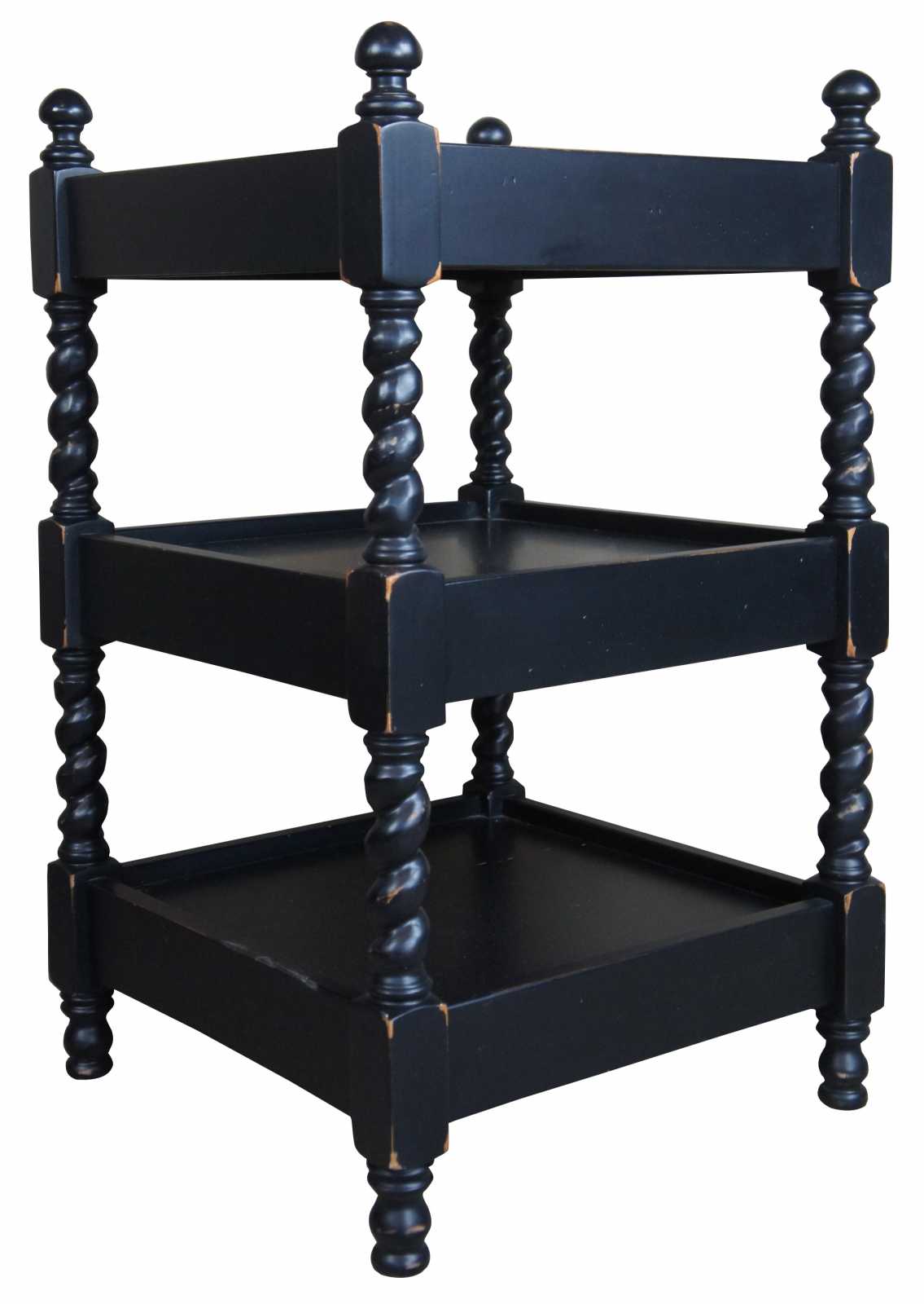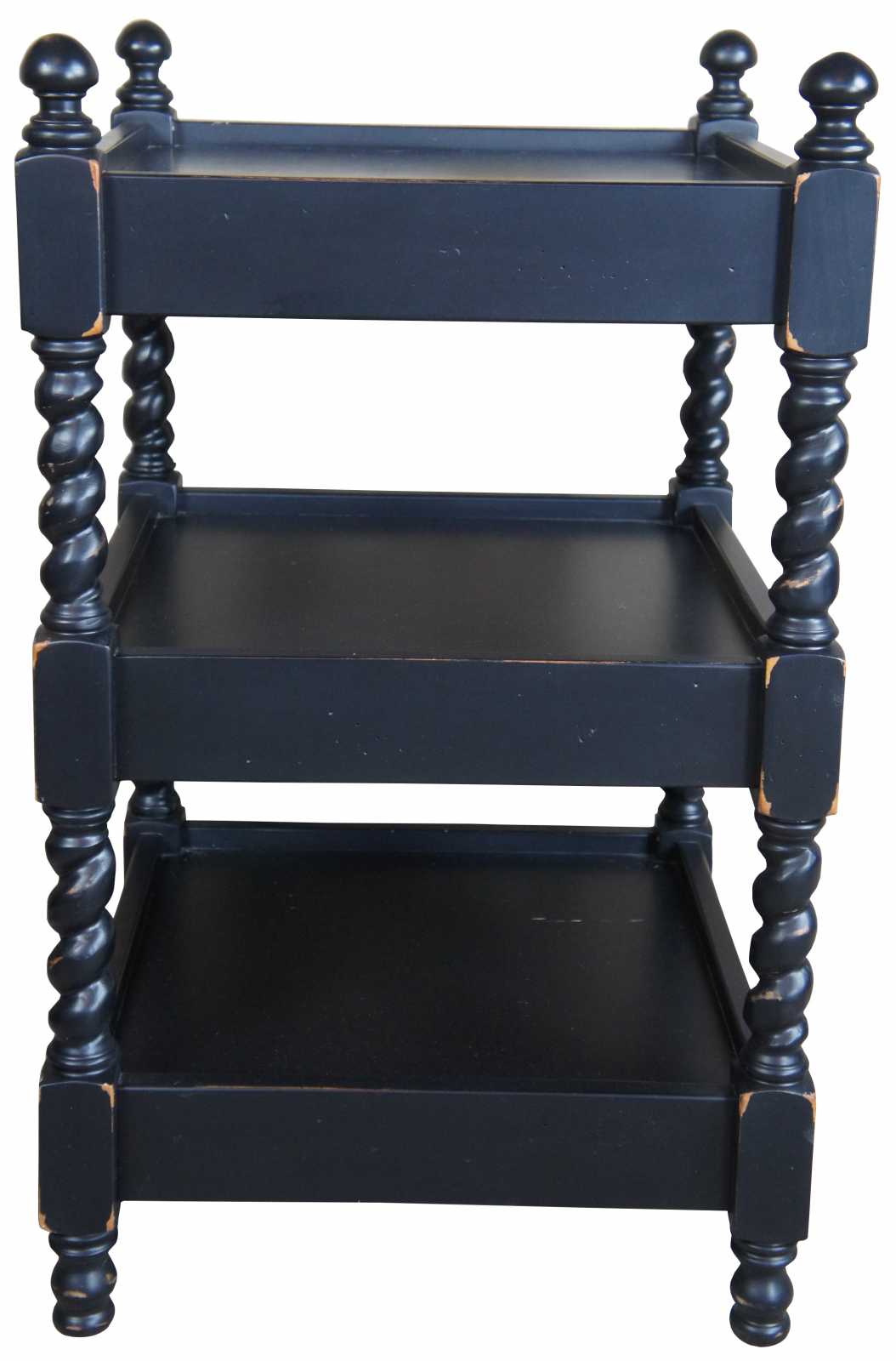 A quaint set of barley twist end tables. Features a 3 tier design with inset tops and a distressed finish. Drawing inspiration from Louis XIII and English styling