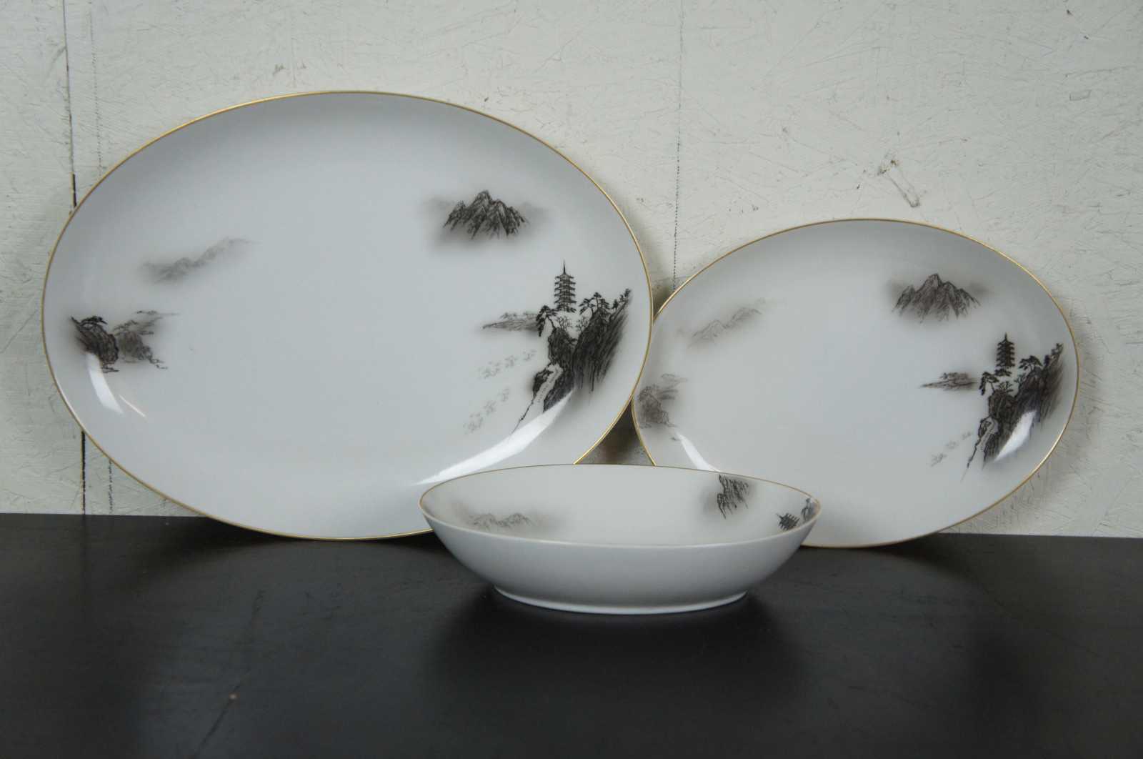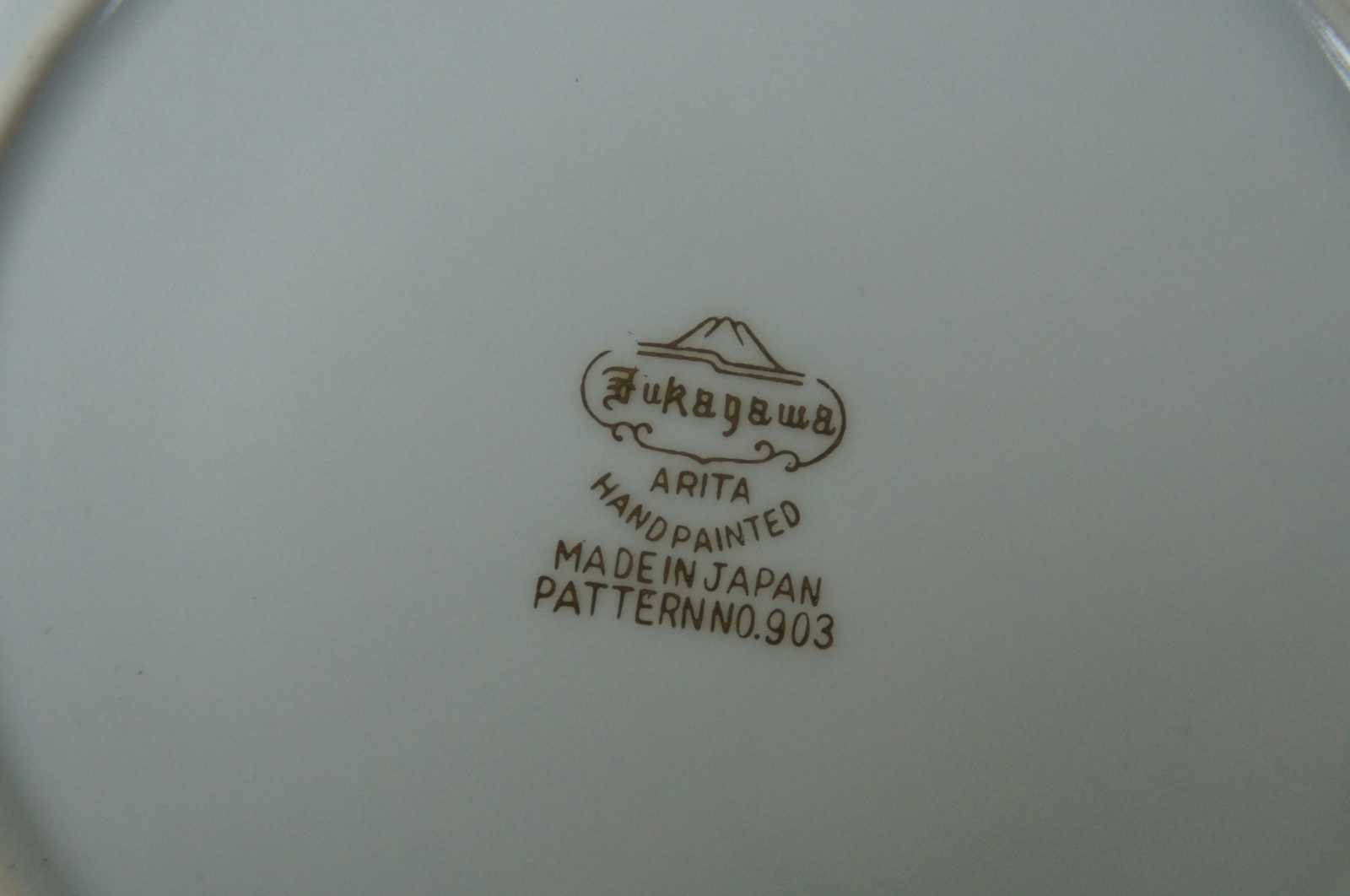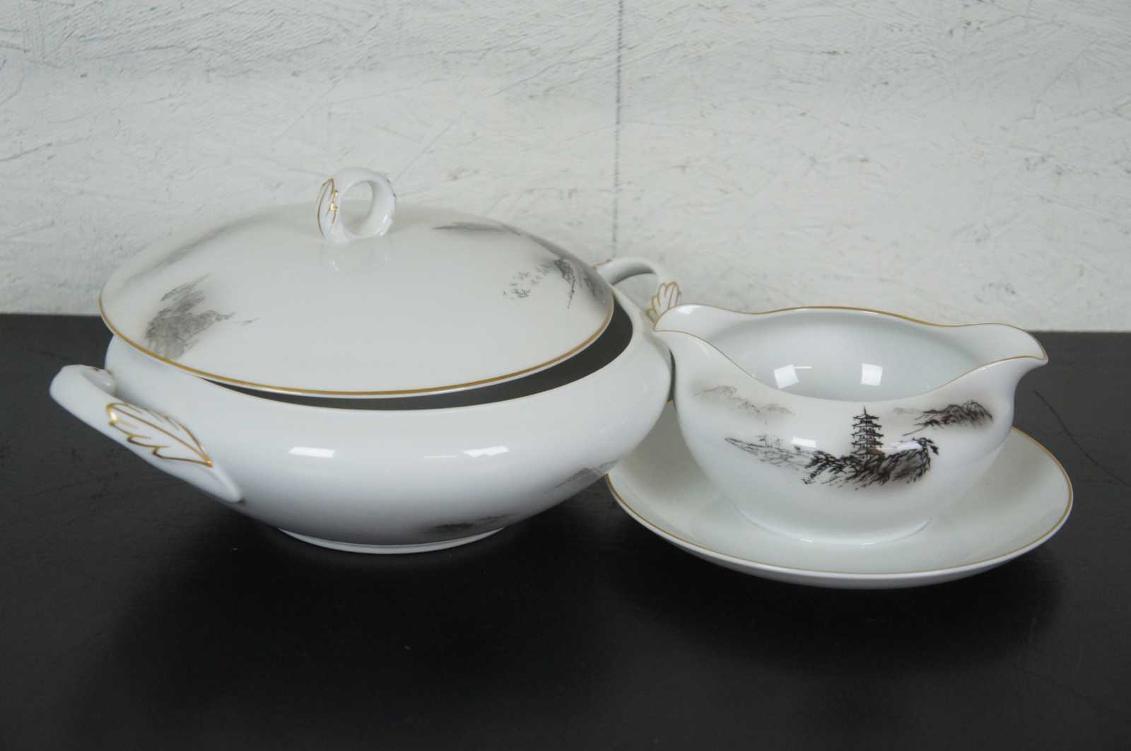 92 piece set of dinnerware by Fukagawa, pattern number 903, featuring a black and white pagoda tower on a rocky hillside or landscape with gilded edges.