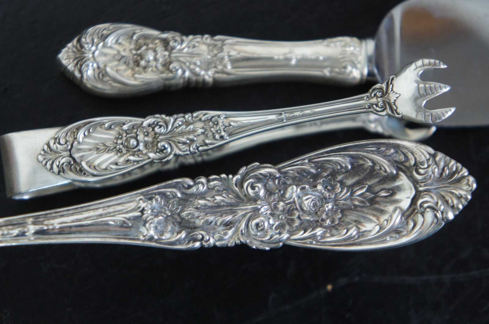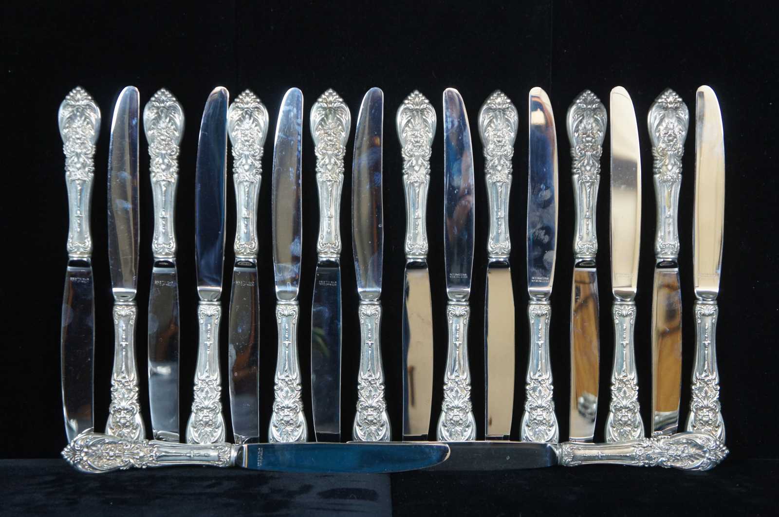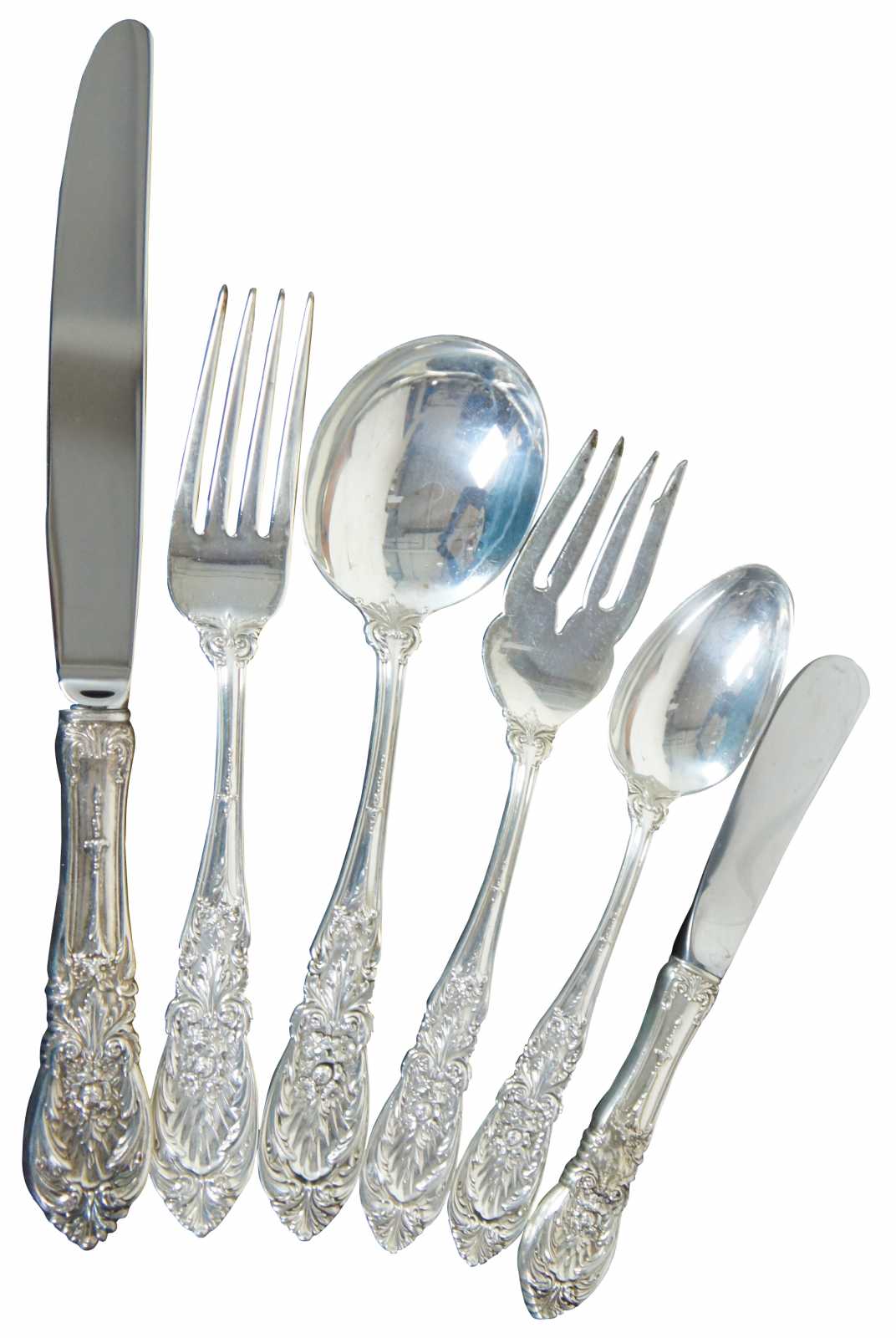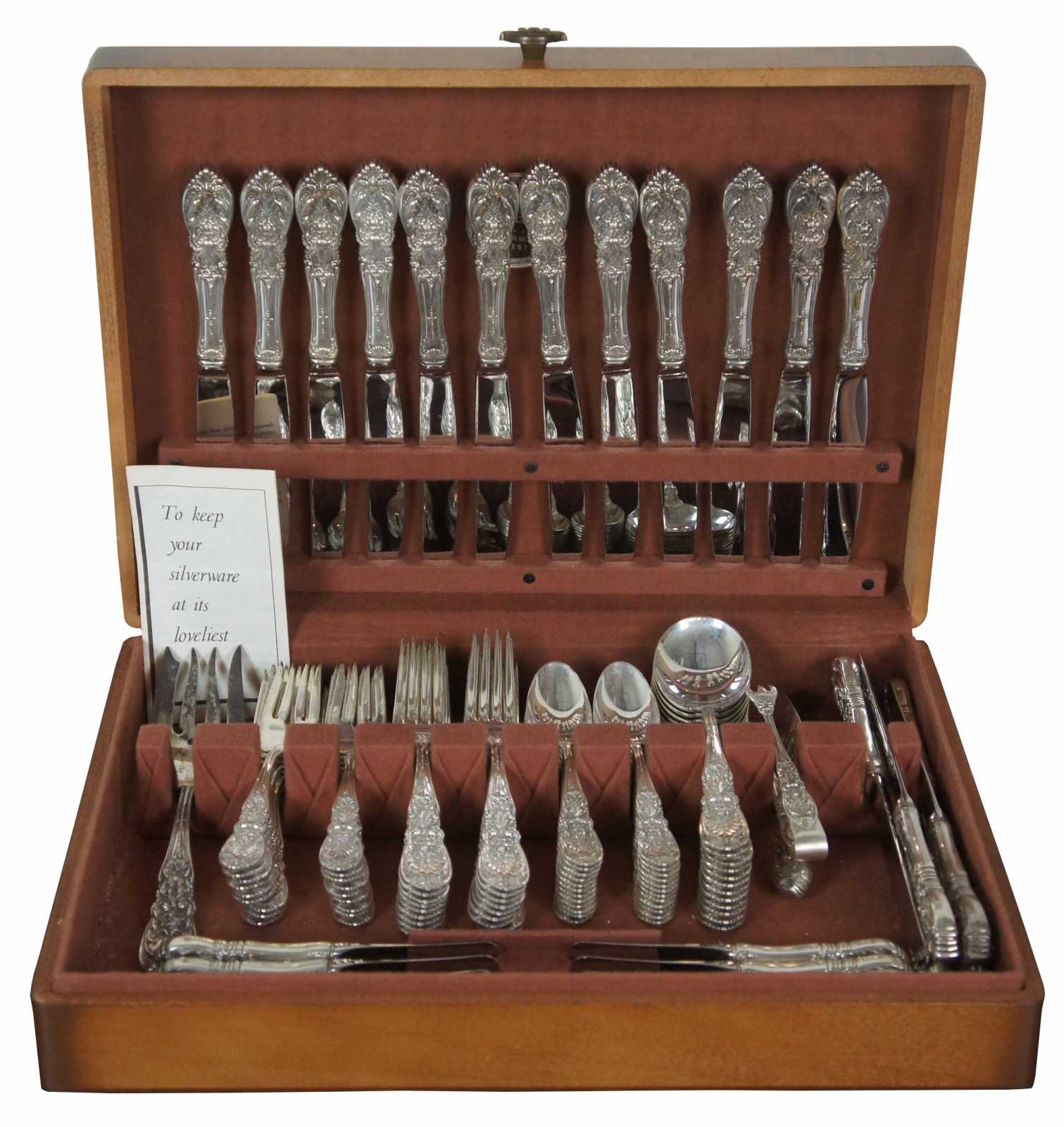 106 piece set of sterling silver flatware by International Silver Co in the Richelieu pattern (first produced in 1935) and wooden storage chest.