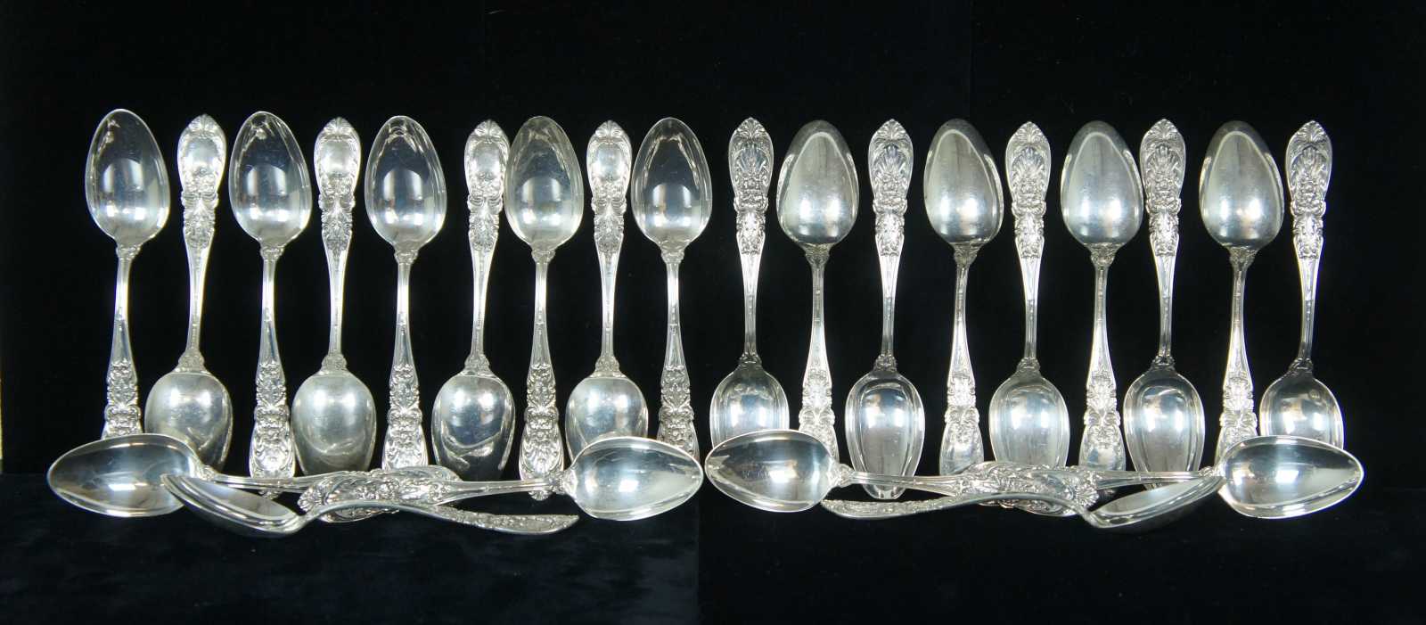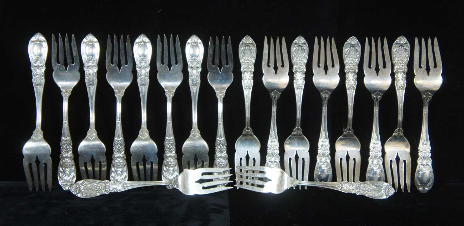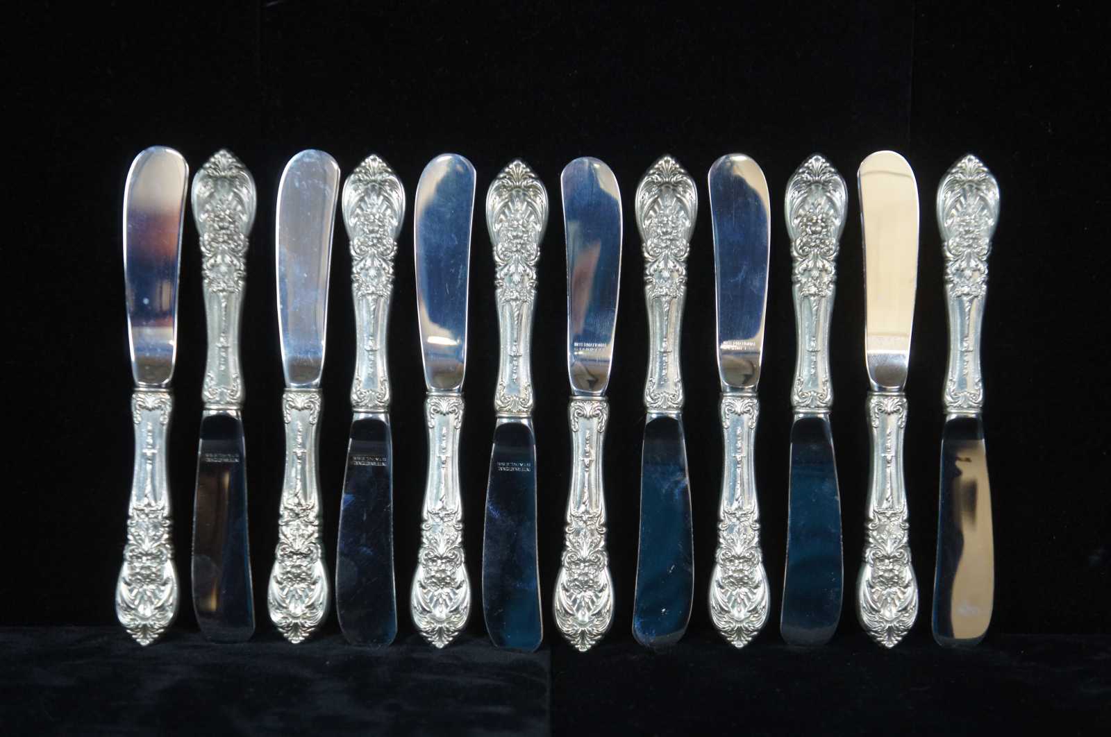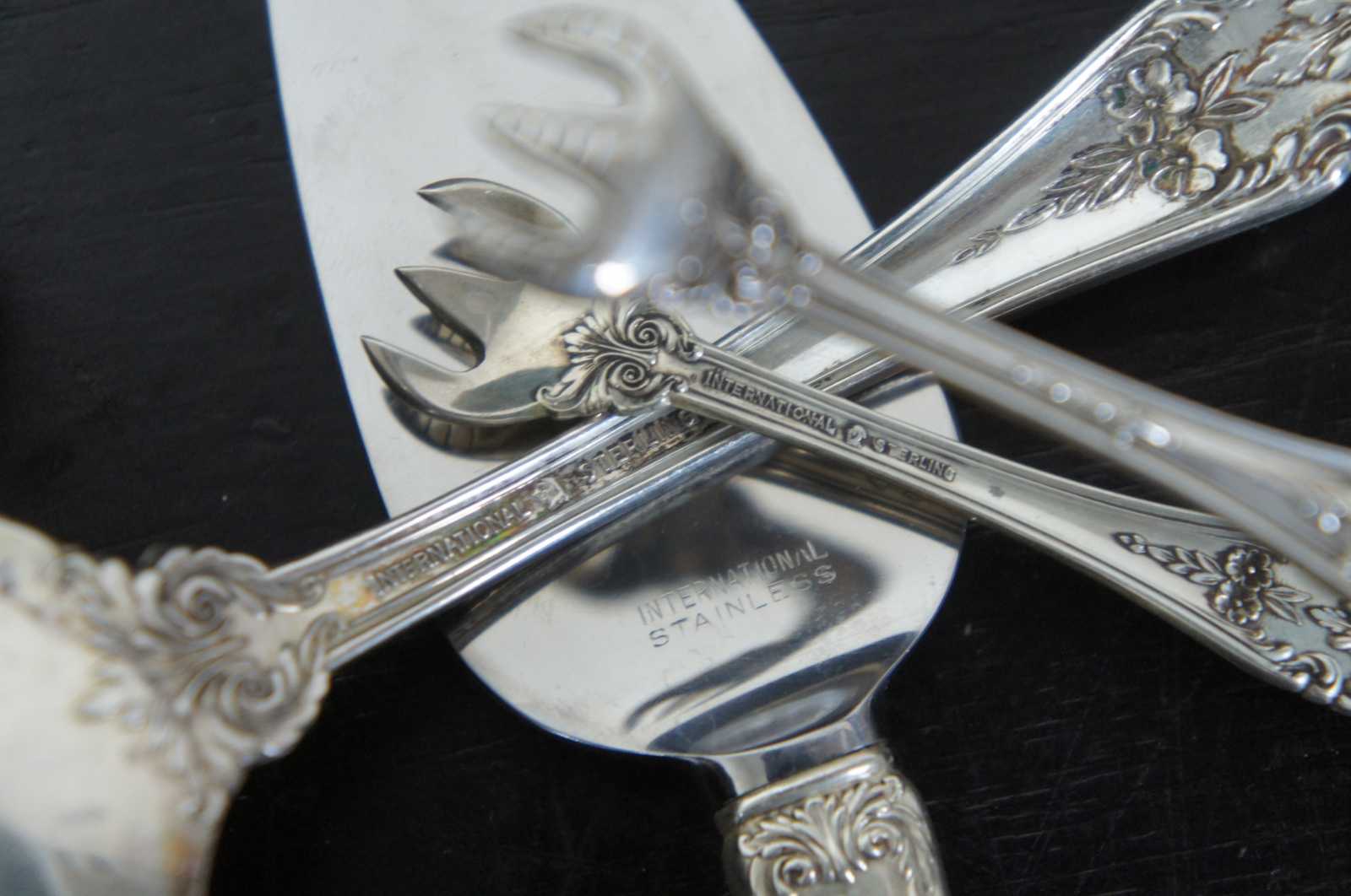 106 piece set of sterling silver flatware by International Silver Co in the Richelieu pattern (first produced in 1935) and wooden storage chest.