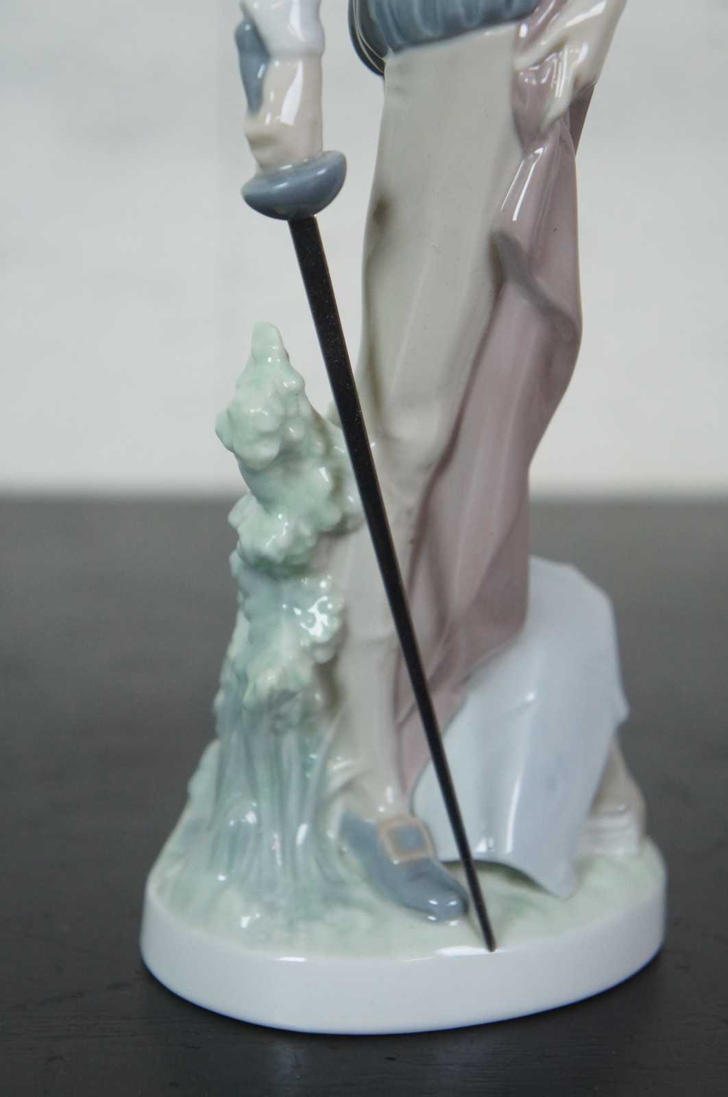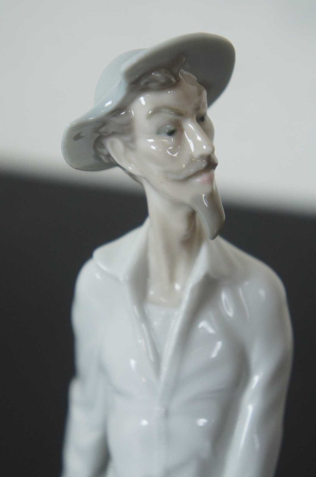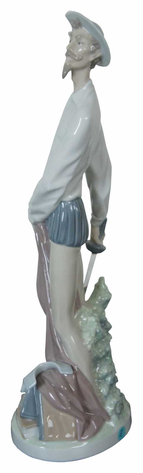 Retired Lladro Spain porcelain figurine of Miguel de Cervantes’ Don Quixote standing with a silver rapier, holding a red cape with chest plate and several books at his feet. #4854.