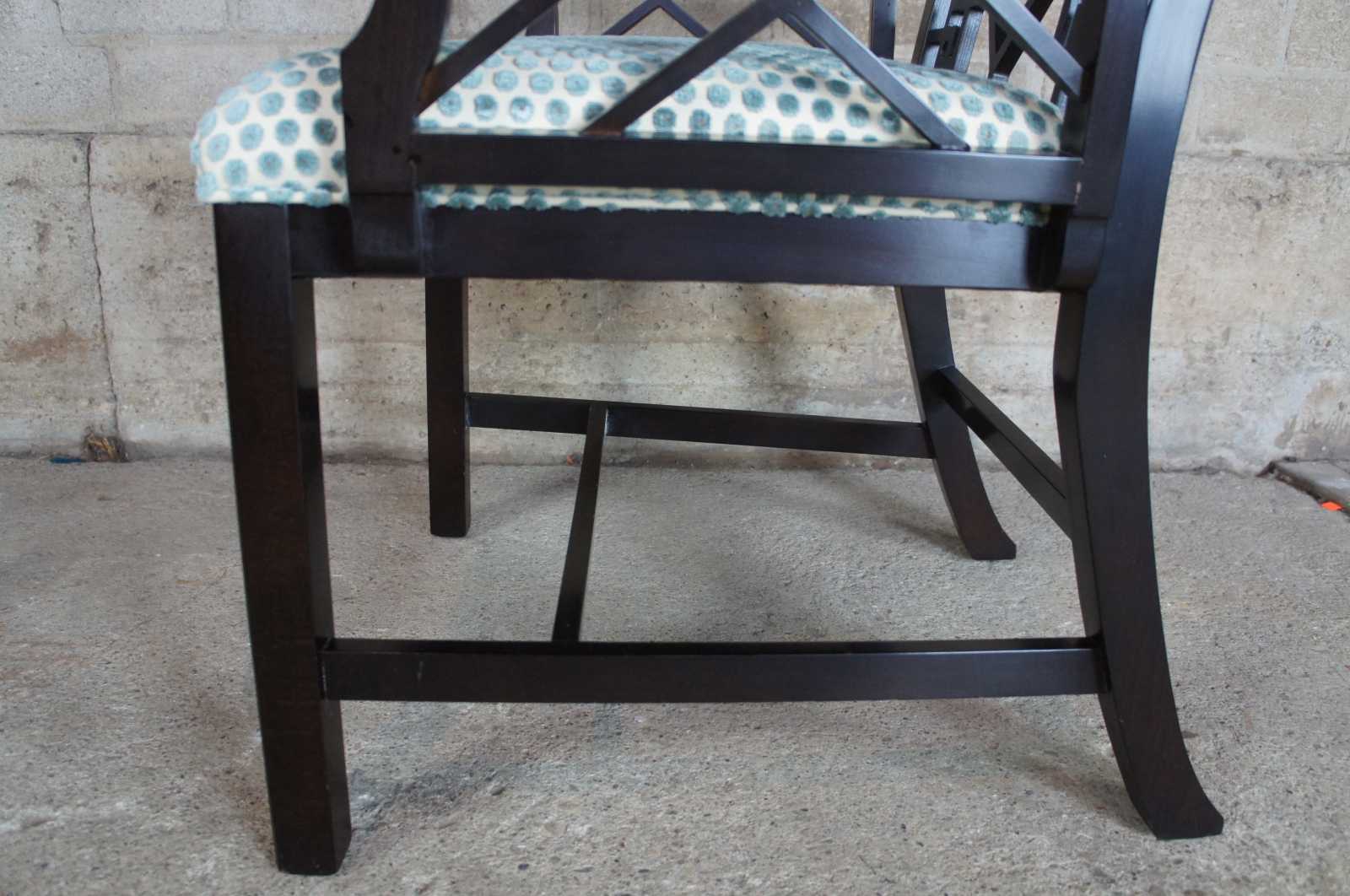6 Baker Furniture Stately Homes Chinese Chippendale Dining Arm Chairs. Features lacquered wood frames and openwork geometric lattice design. Supported by straight front legs and rear saber legs connected by an H stretcher. Upholstered in a white with teal velour polka dot pattern.