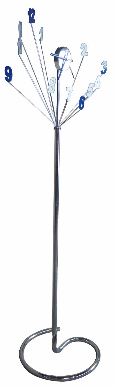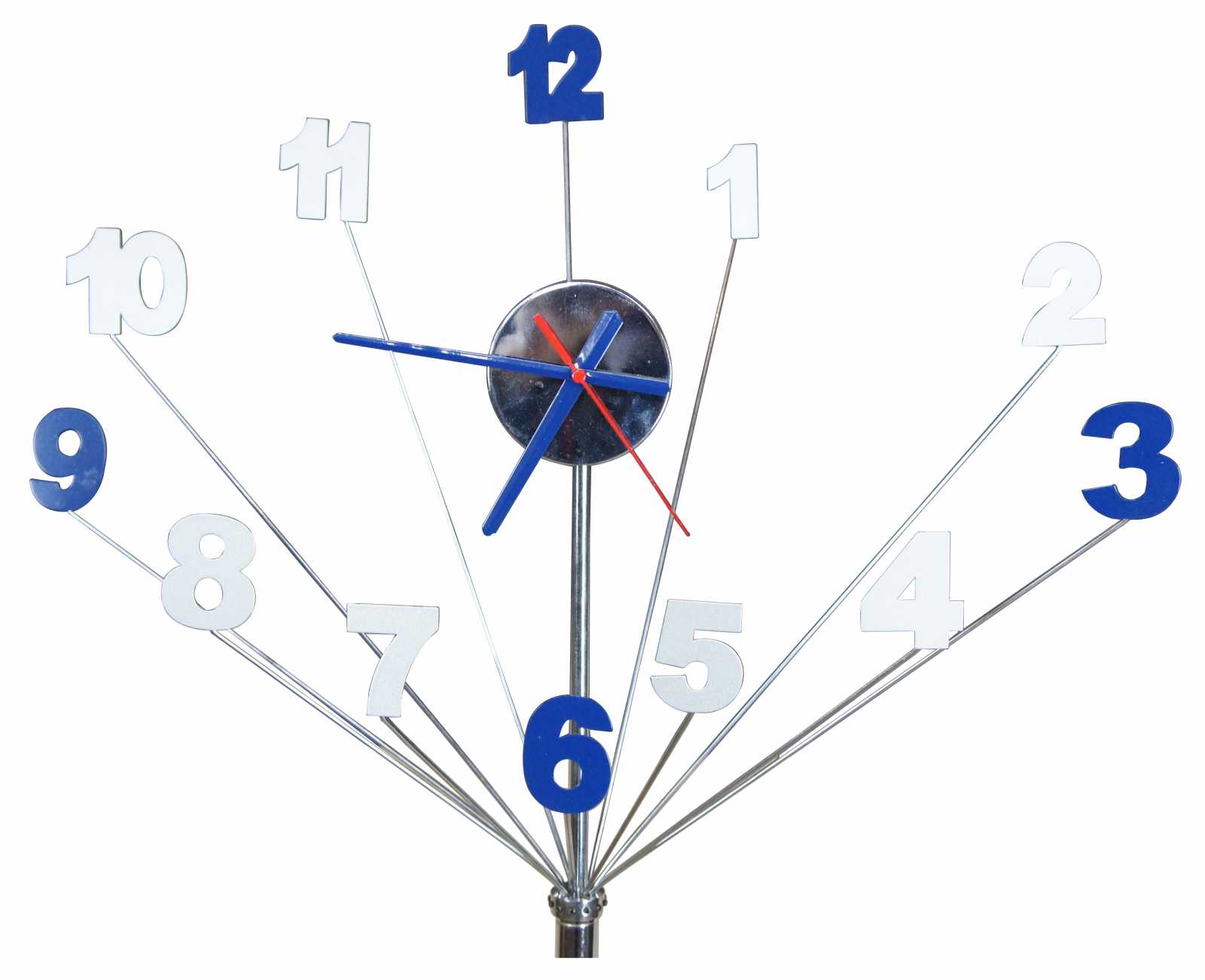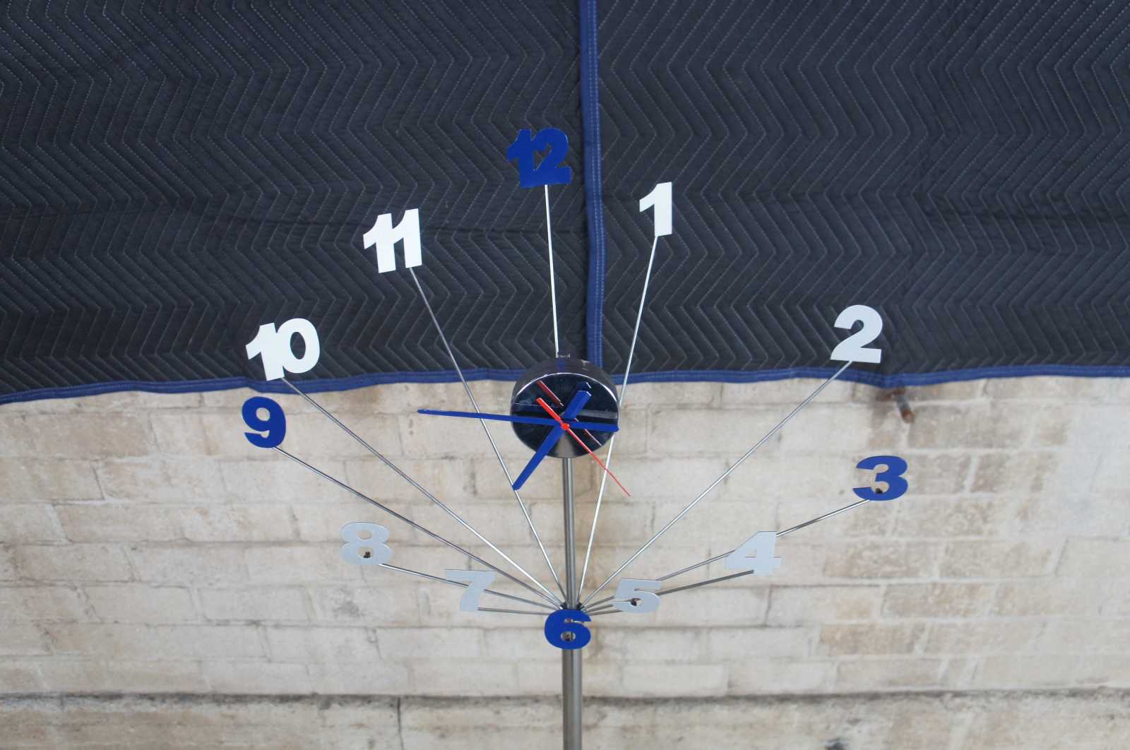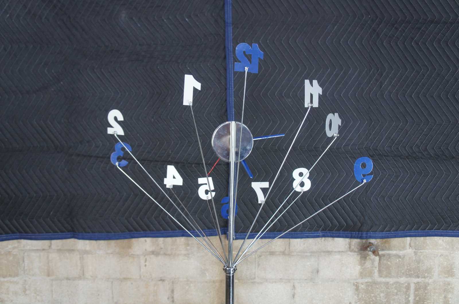 It features a dimensional starburst style with bright and bold graphic metal numbers in blue and white. It displays the time with easy to read sleek blue and white metal hands, and a sweeping red metal second hand. Displayed on a shiny chrome tubular steel base that stands almost 6 feet tall.