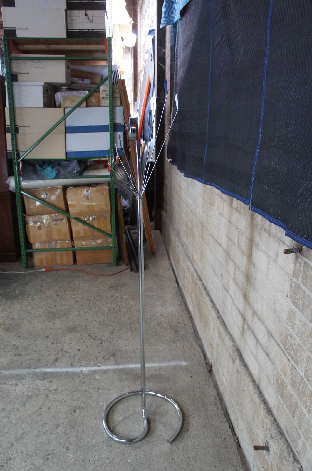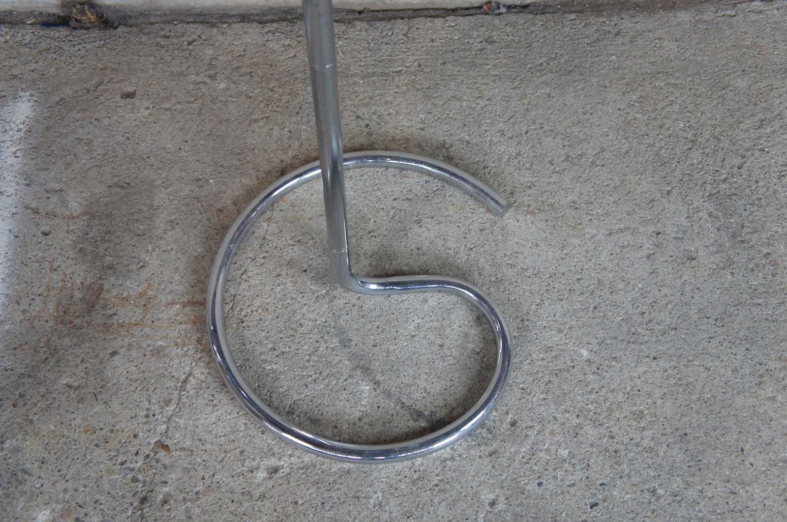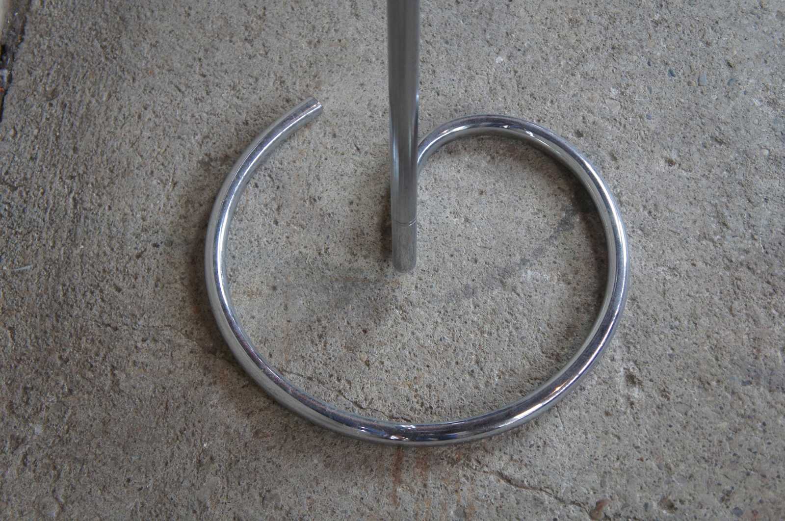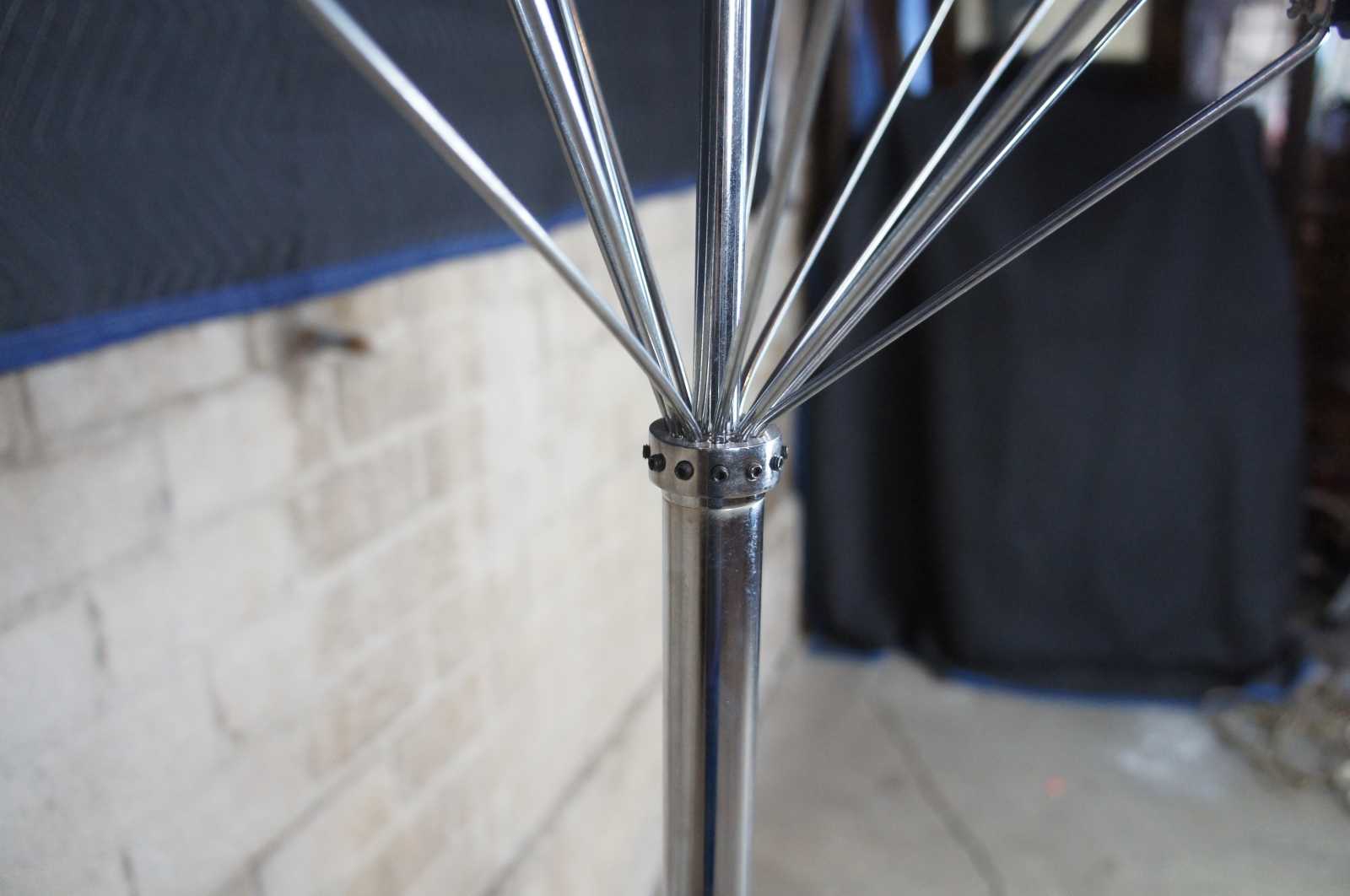 It features a dimensional starburst style with bright and bold graphic metal numbers in blue and white. It displays the time with easy to read sleek blue and white metal hands, and a sweeping red metal second hand. Displayed on a shiny chrome tubular steel base that stands almost 6 feet tall.