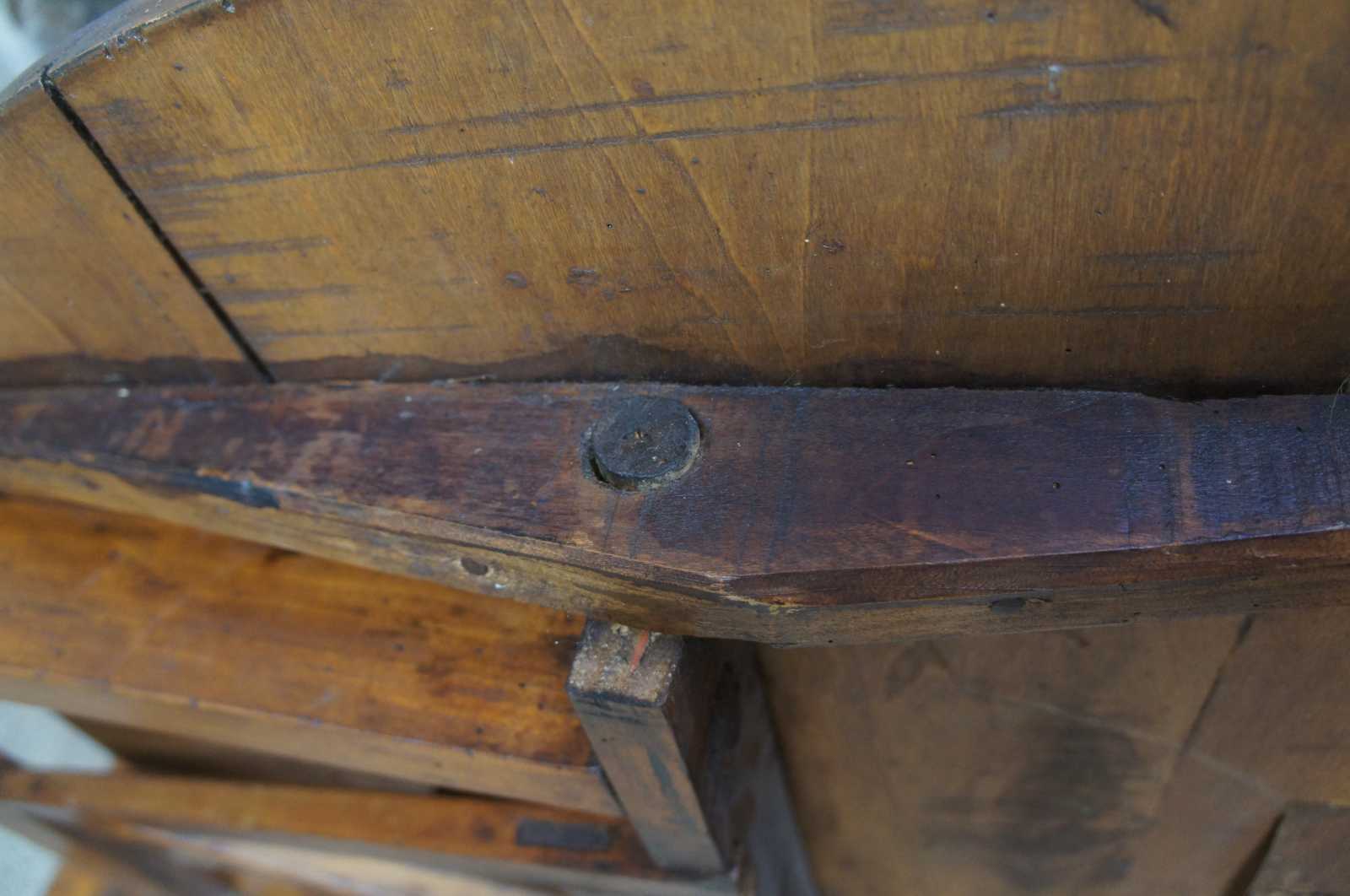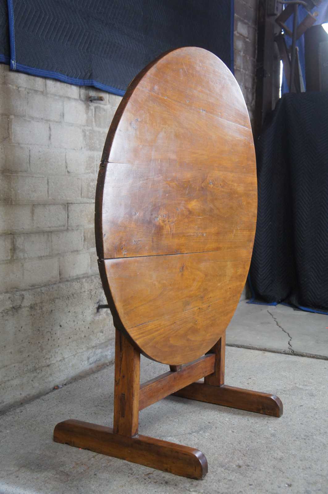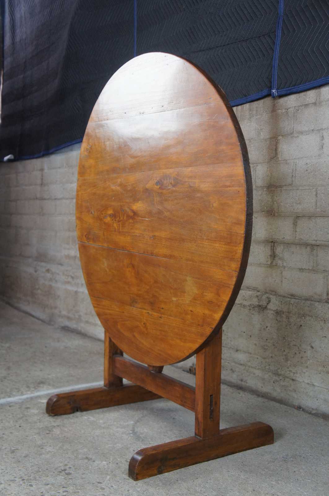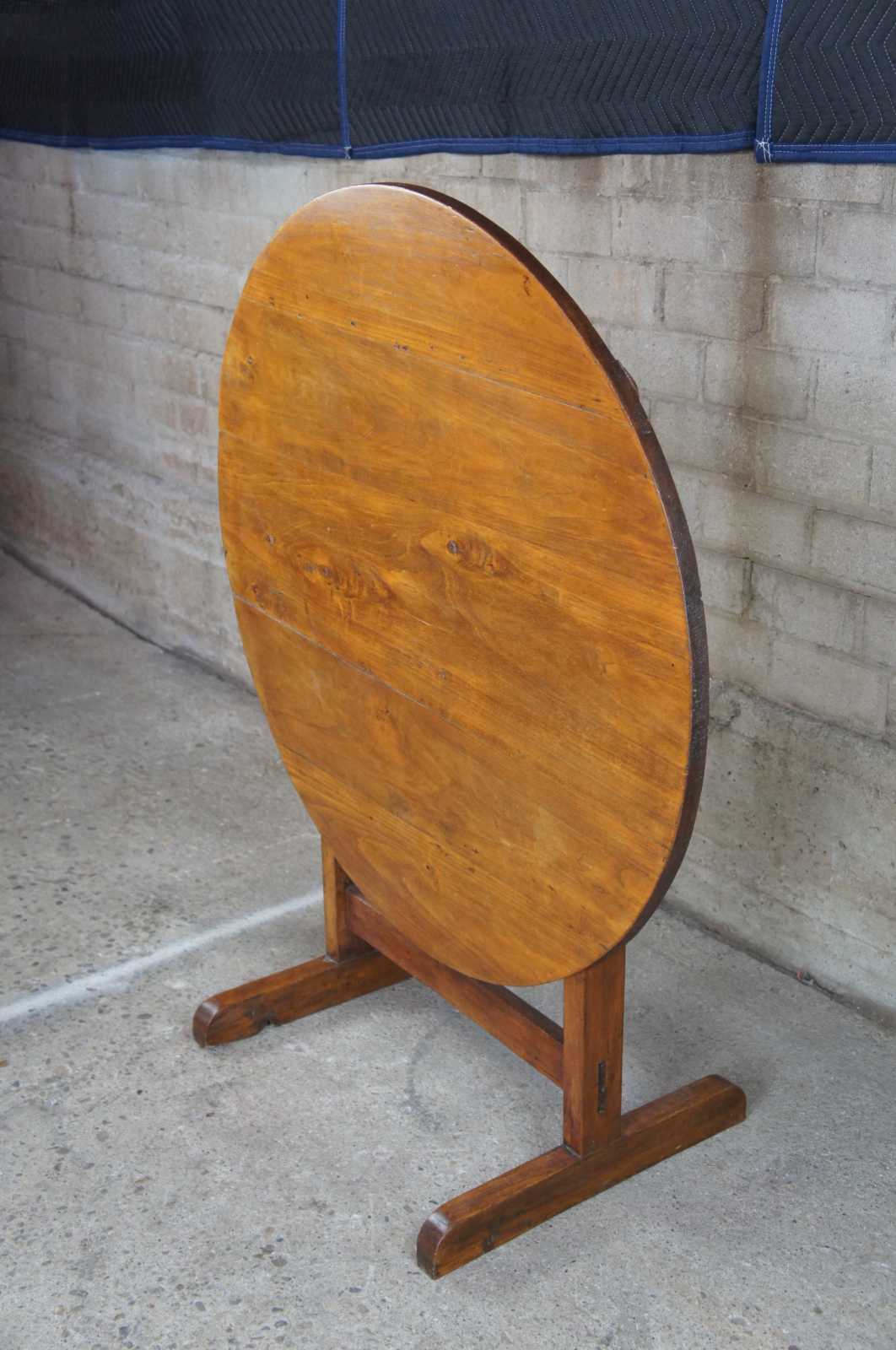 A classic french "Vendange" wine tasting table. The pine top tilts back for easy storage. Great for use with wine or in a dining or breakfast setting.