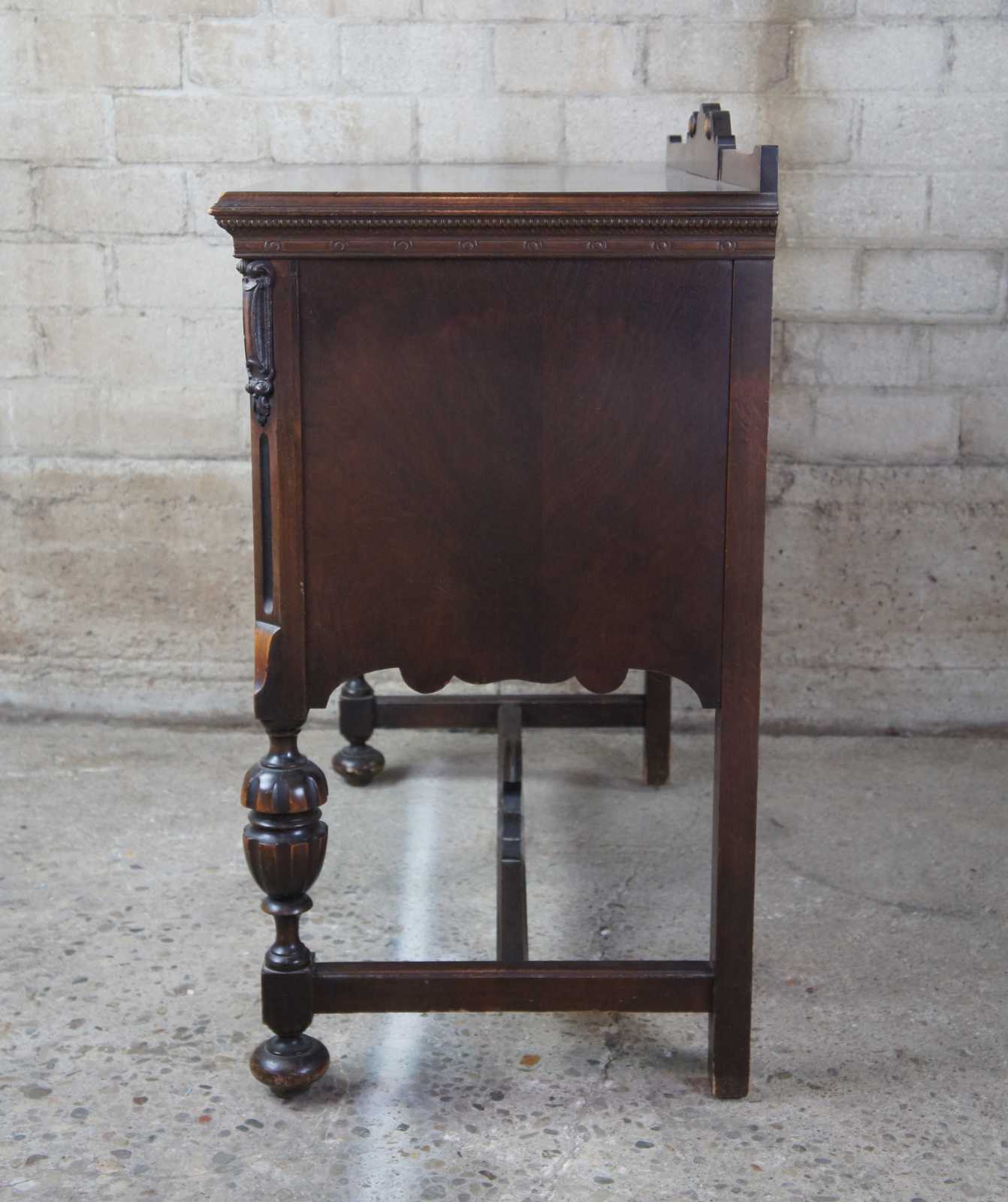 An early 20th century Jacobean Revival Server. Features a rectangular form with backsplash over baluster legs connected by an H stretcher and bun feet. Includes a large central storage area with scrolled door, beaded trim, medallions and gadrooning.