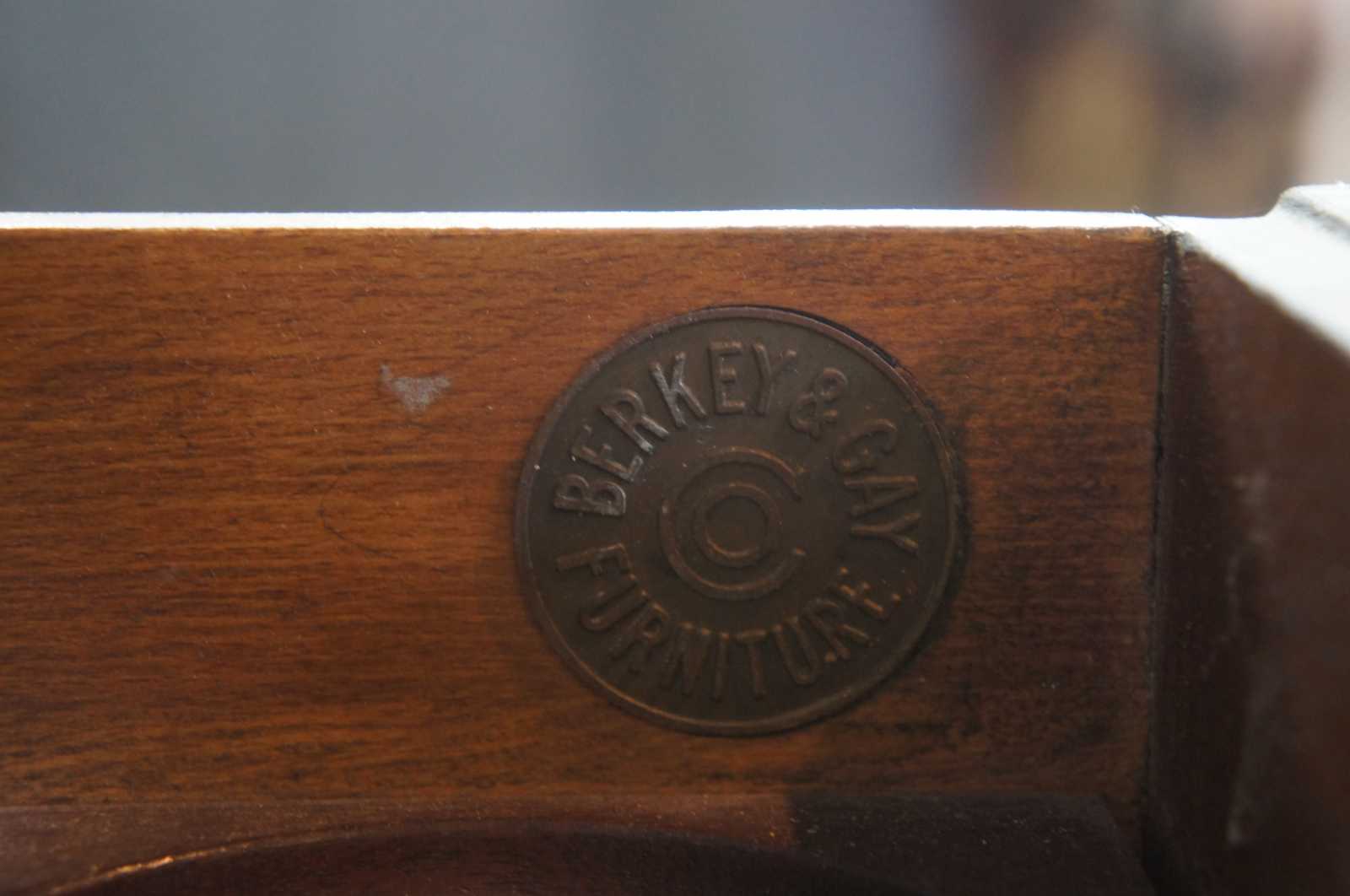 The Berkey & Gay Furniture Company used three different types of labels to mark the furniture that they manufactured. The first label was branded into the wood and can often be found inside the drawers of the Berkey & Gay case pieces. Around the year 1900 the branded type label was replaced by a paper label. The brass label was used starting around the 1920's until Berkey and Gay went out of business in the 1940's.