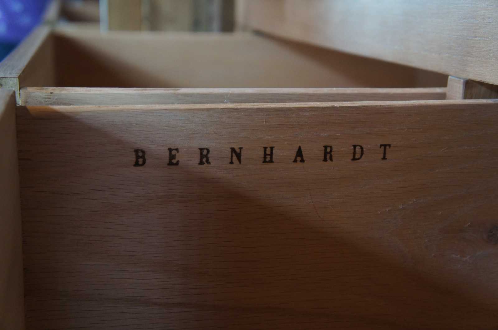 Vintage Bernhardt armoire. Made of oak featuring a reeded column design with acanthus relief. Includes a raised crown, inner drawers for storage and a double hinging door with mirrors along the insides.