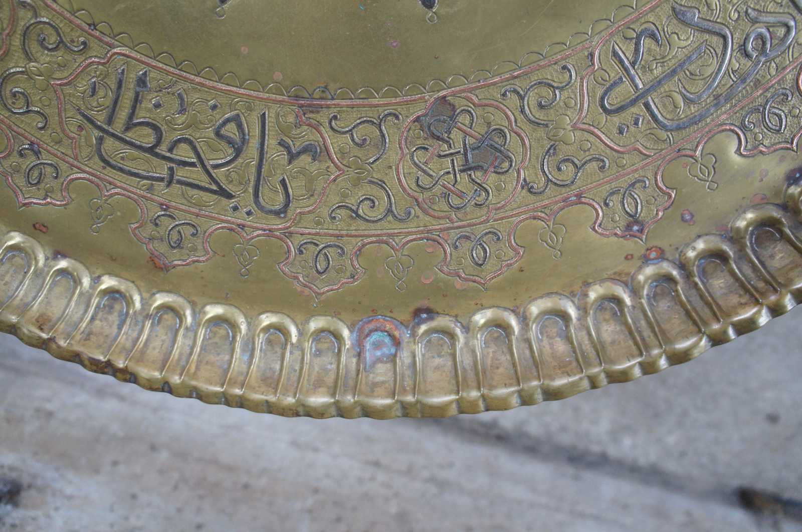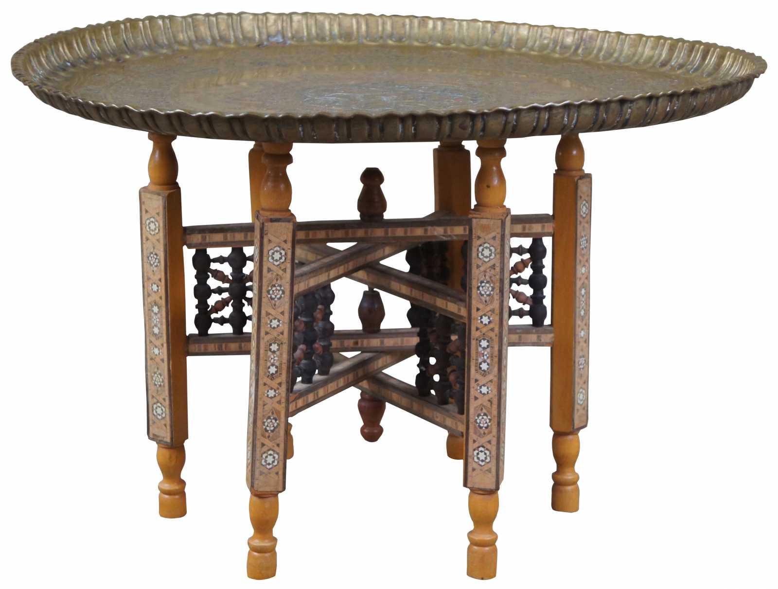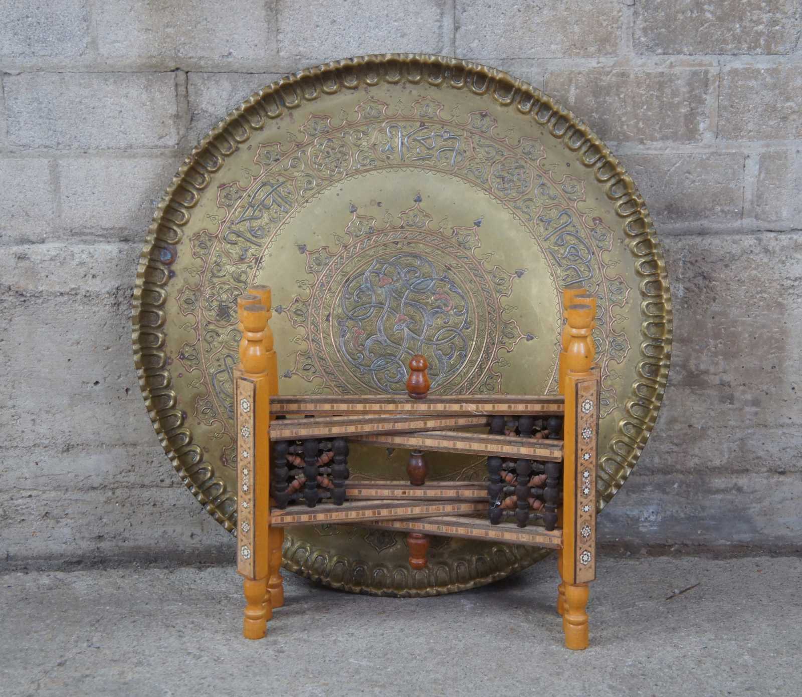 Antique Damascus tray table. Features an etched caligraphy tray with copper accents. The tray is supported by a micromosaic folding base with bone inlay and spool turnings.