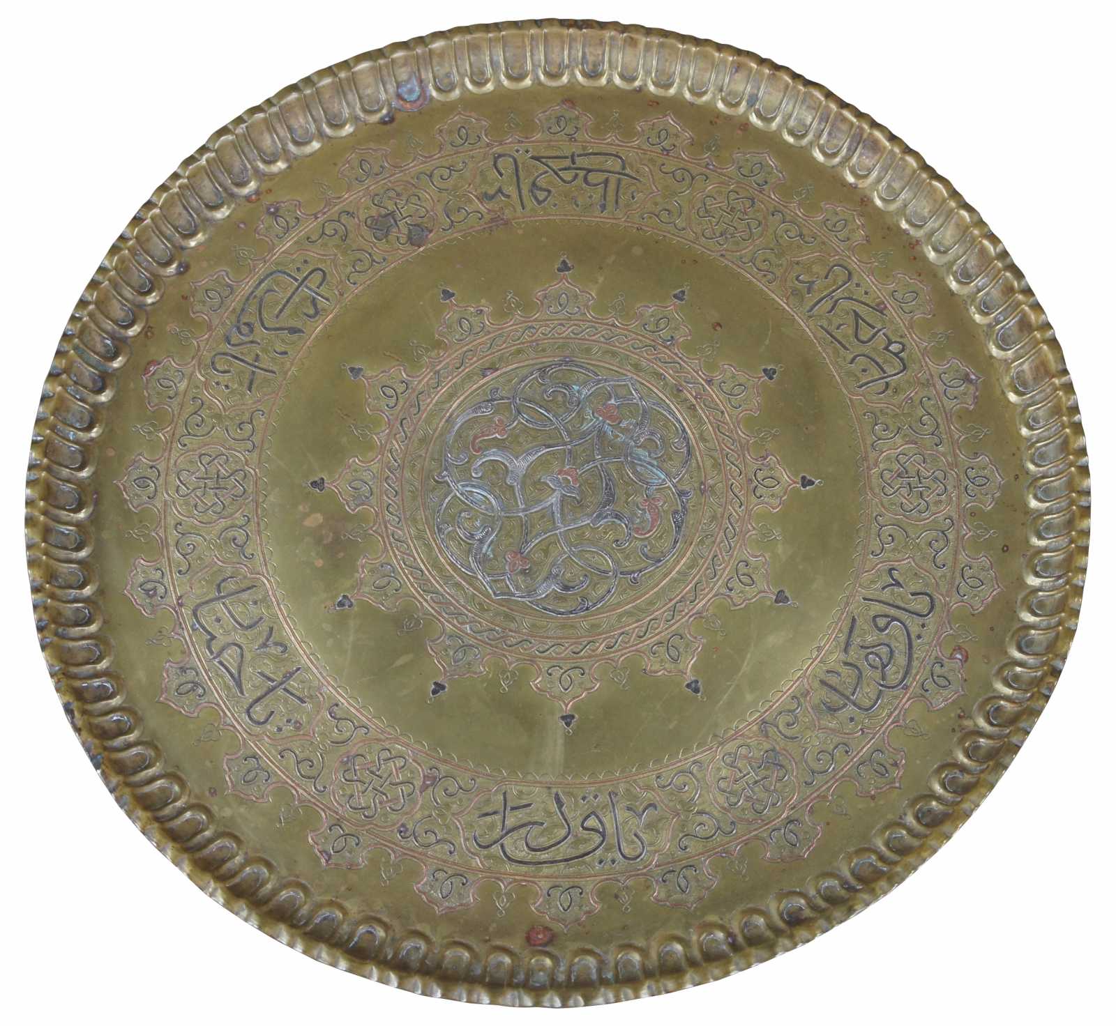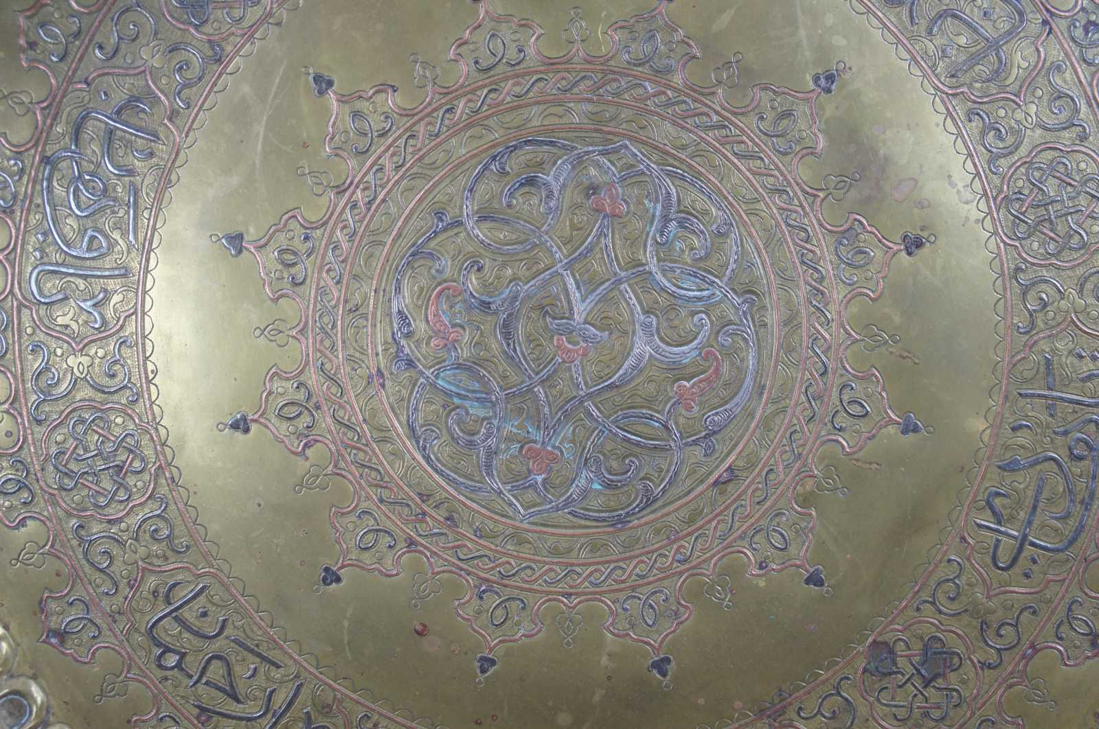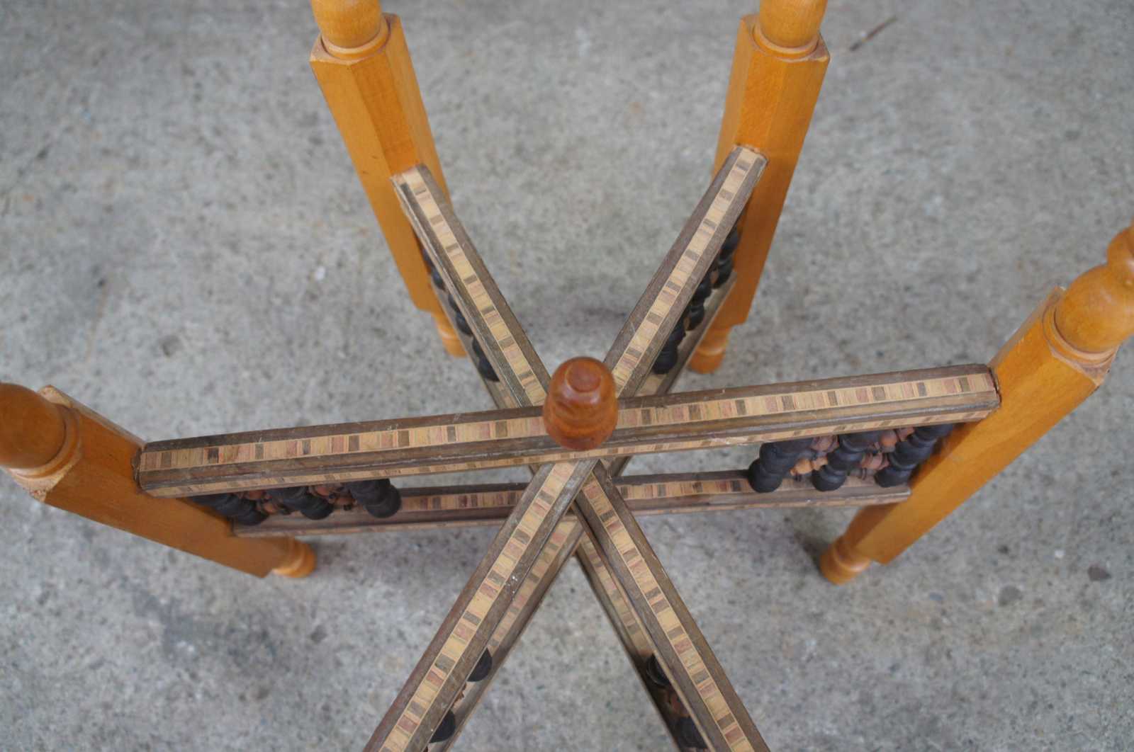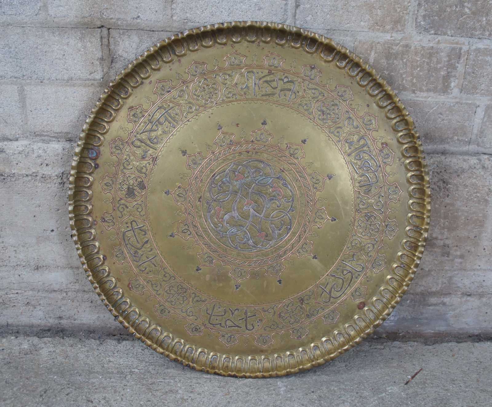 Antique Damascus tray table. Features an etched caligraphy tray with copper accents. The tray is supported by a micromosaic folding base with bone inlay and spool turnings.