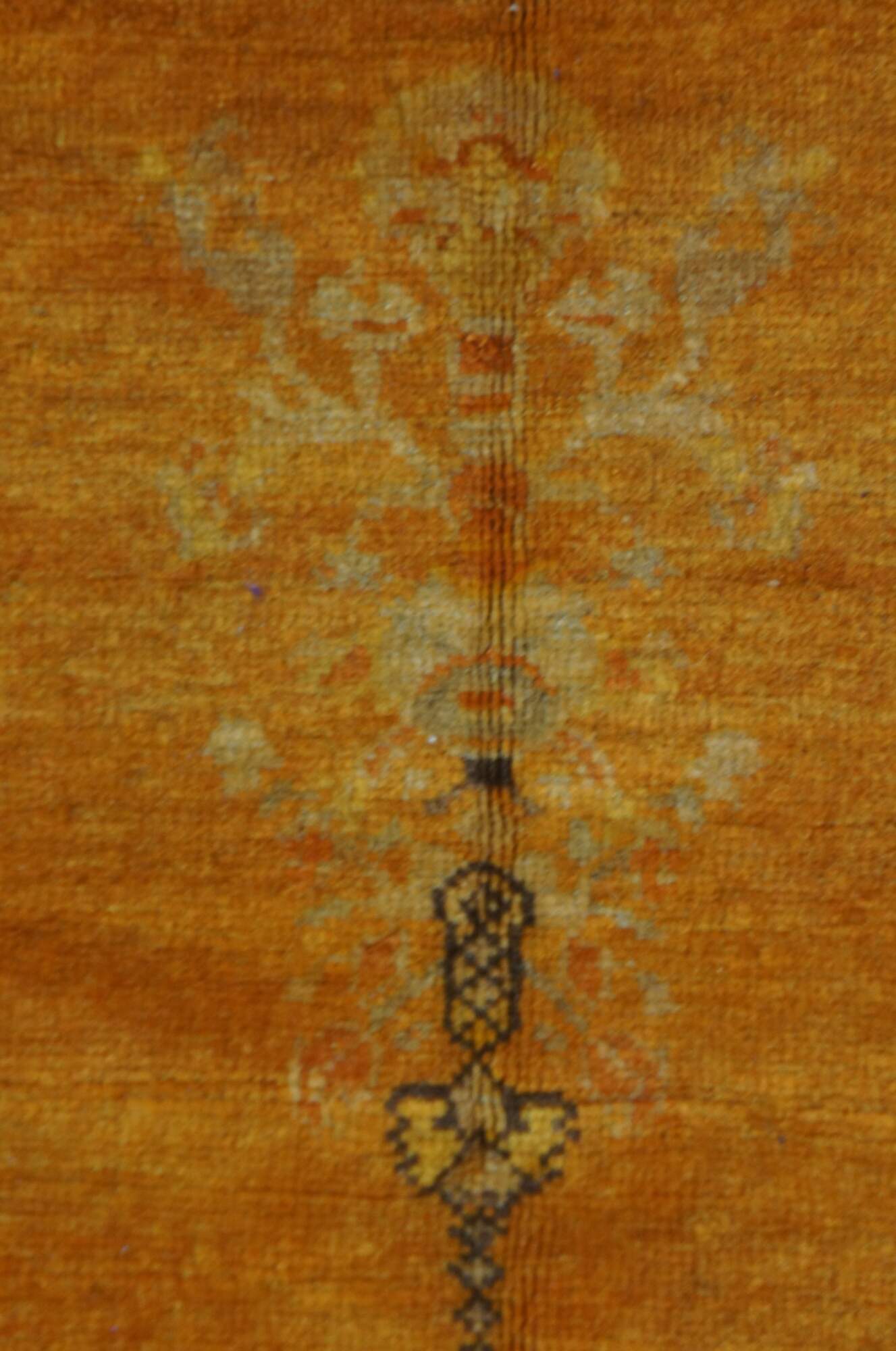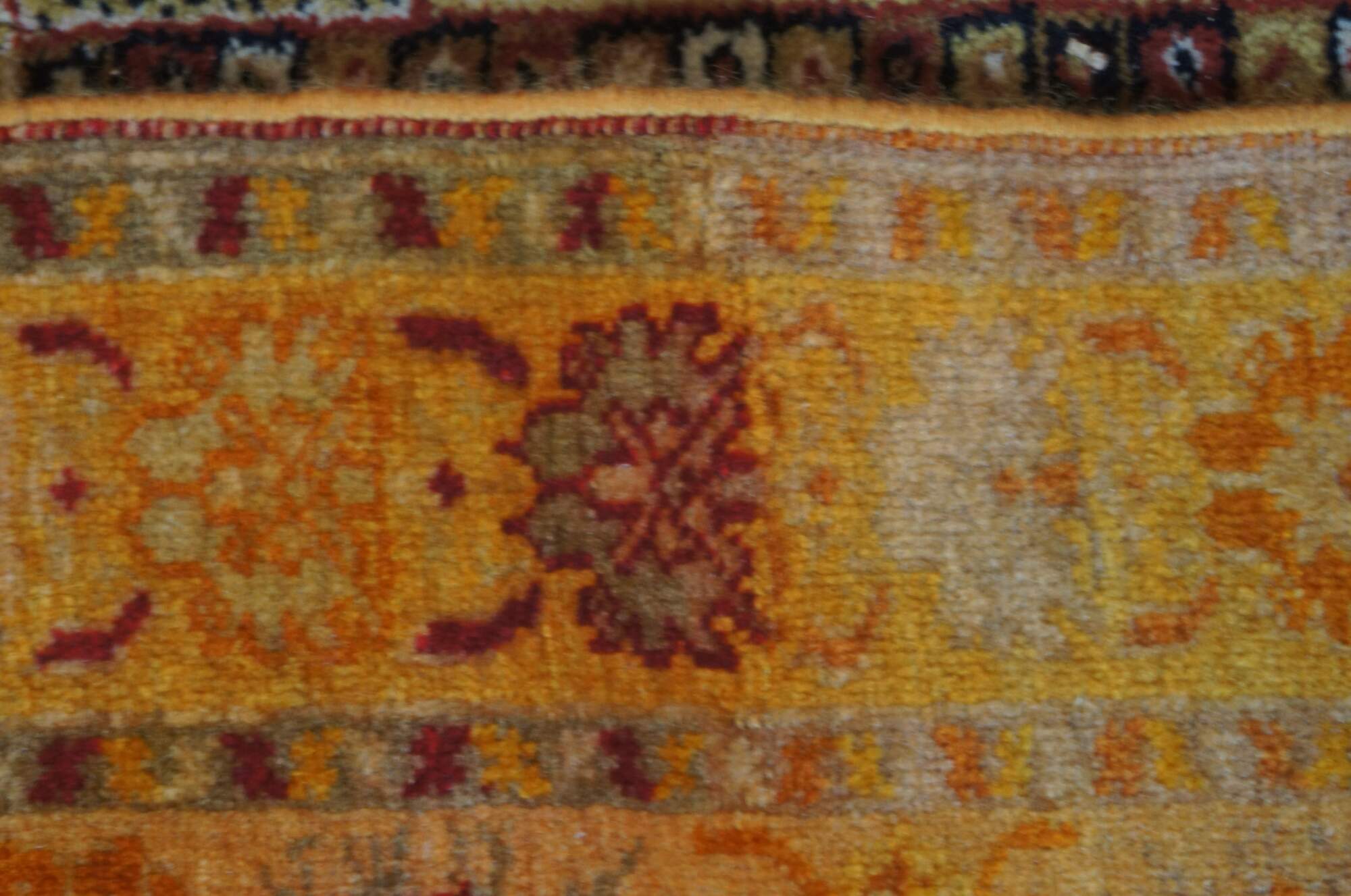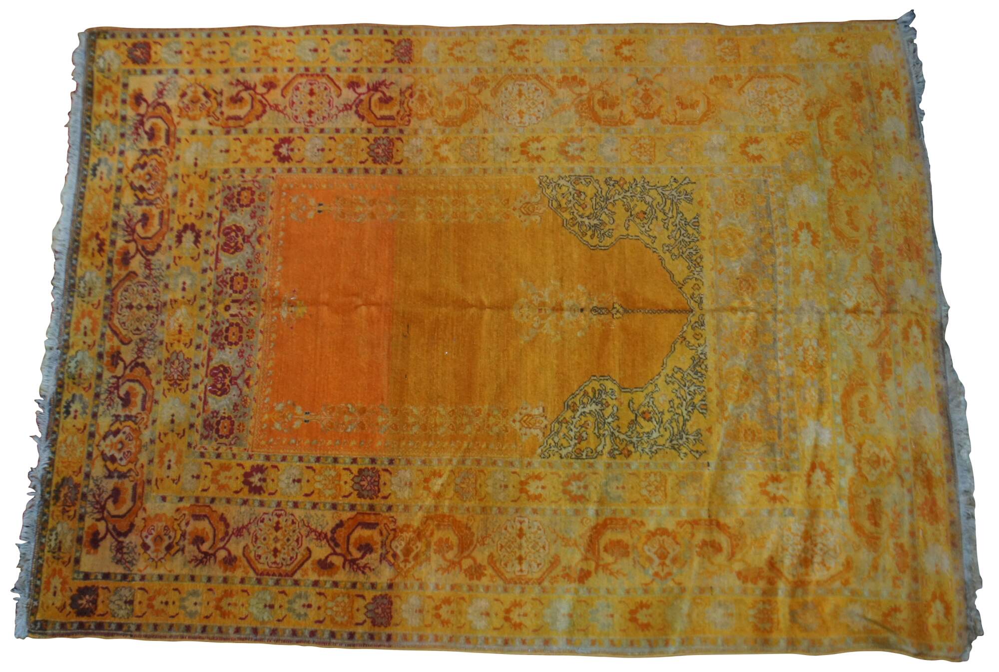 Antique Turkish wool prayer rug in shades of orange, yellow, and red.