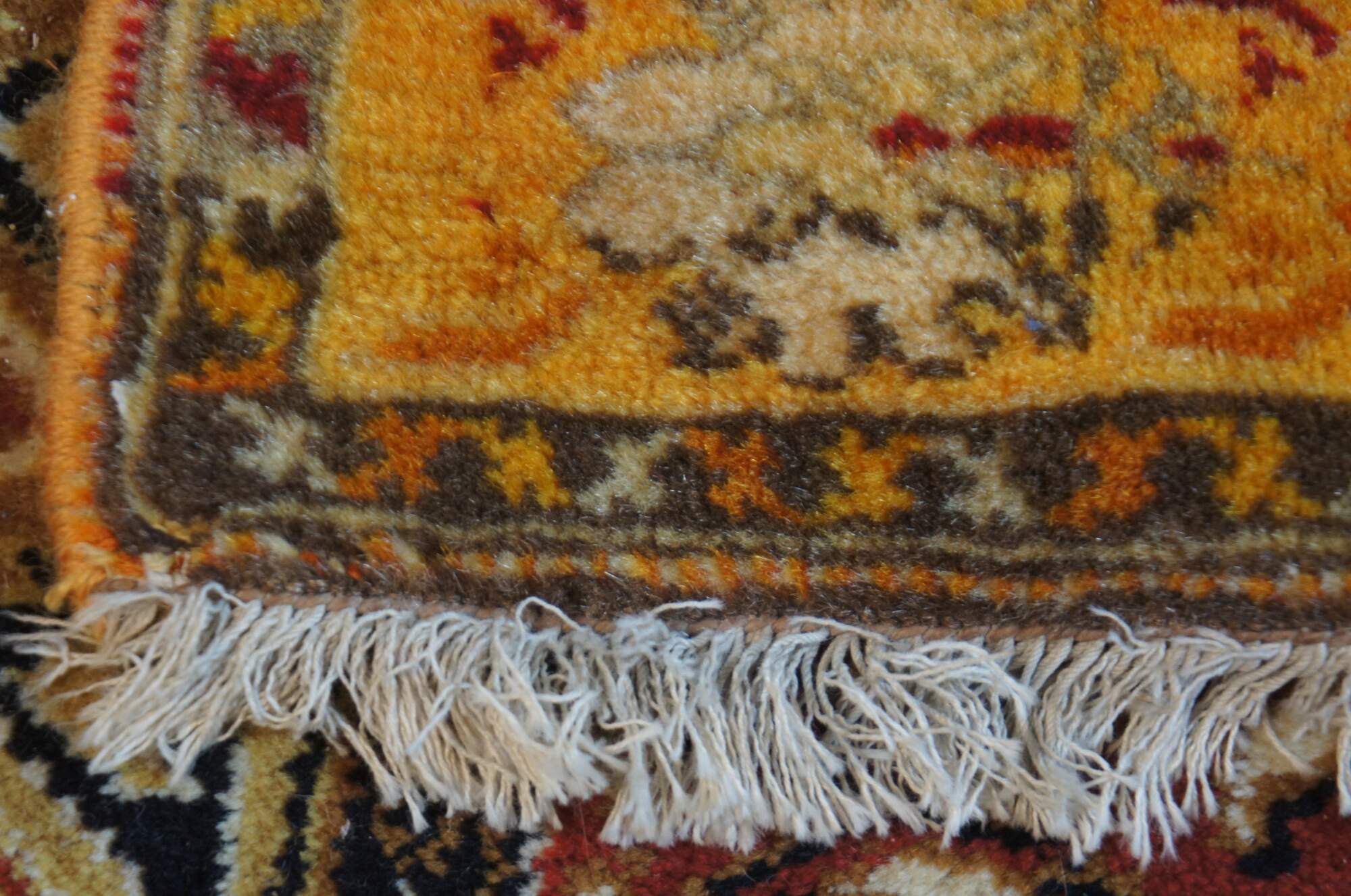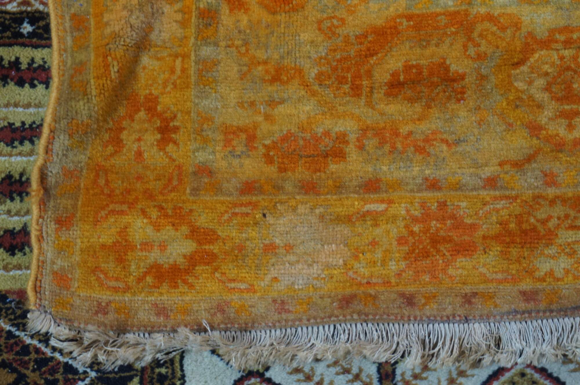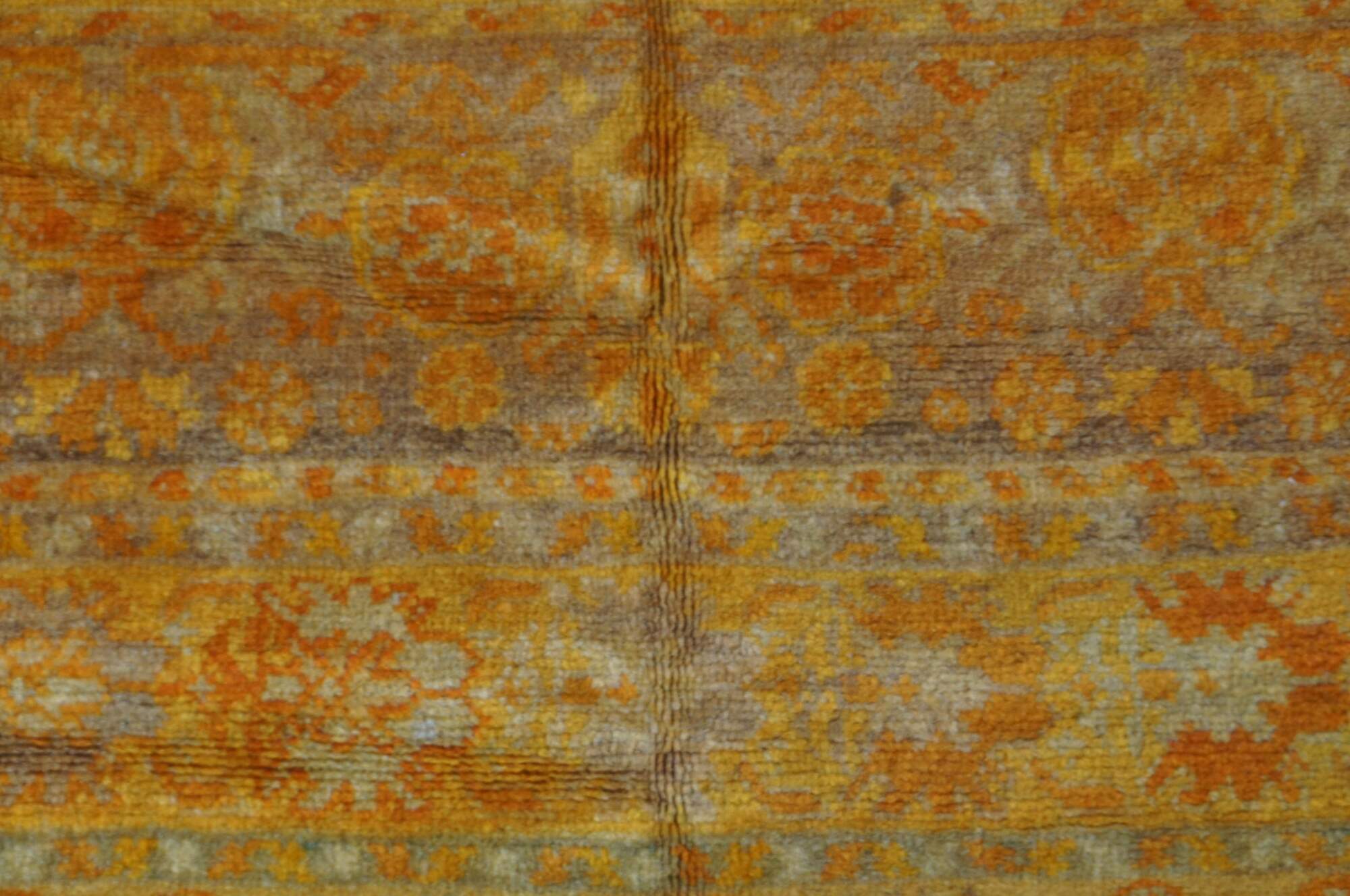 Antique Turkish wool prayer rug in shades of orange, yellow, and red.