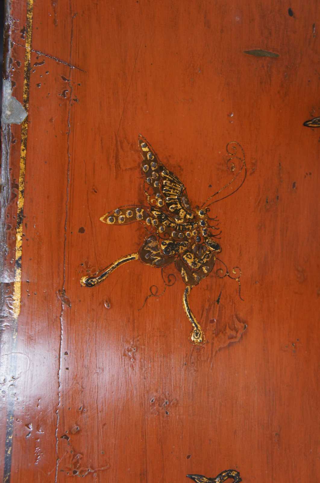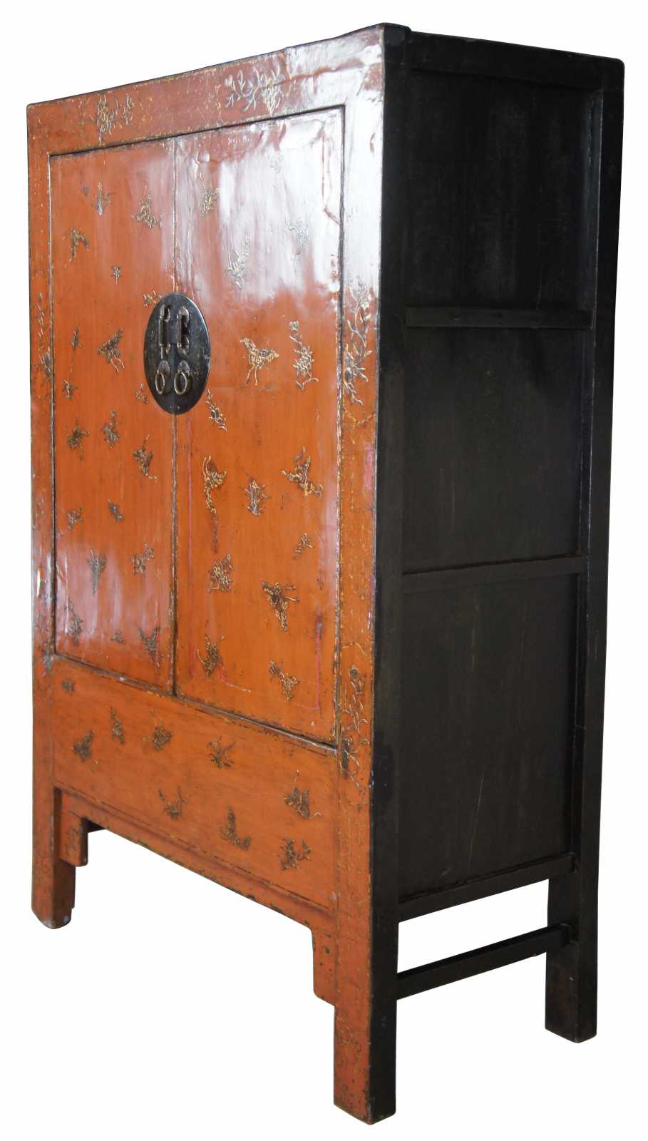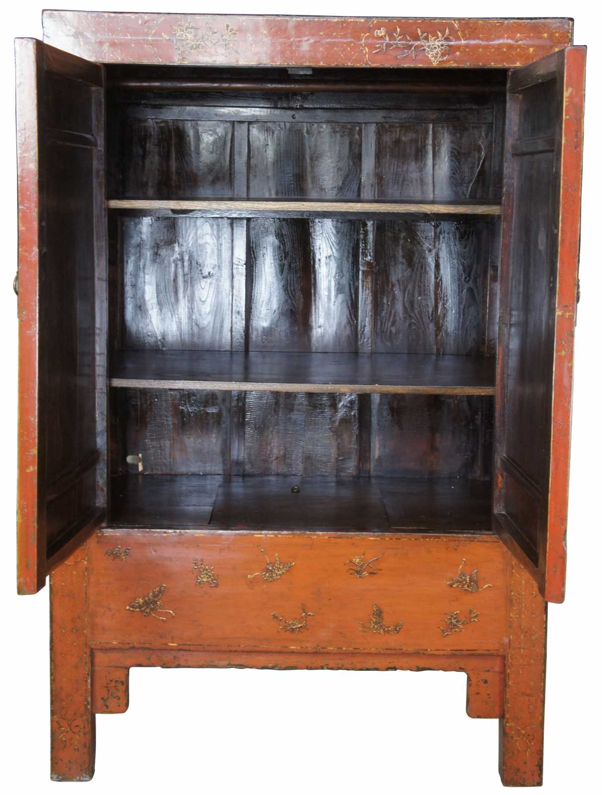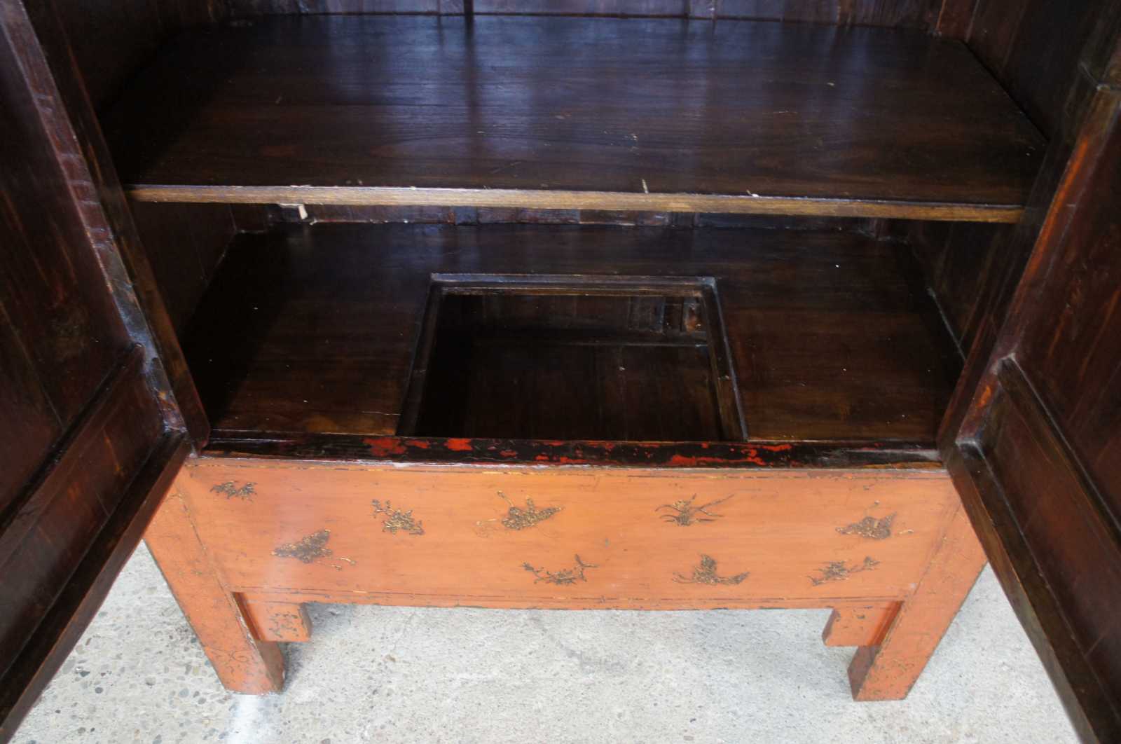 Antique 19th century Qing Dynasty wedding cabinet. Made from elm with red lacquer finish over dragonfly / butterfly motif. Features two shelves and hidden interior compartment.