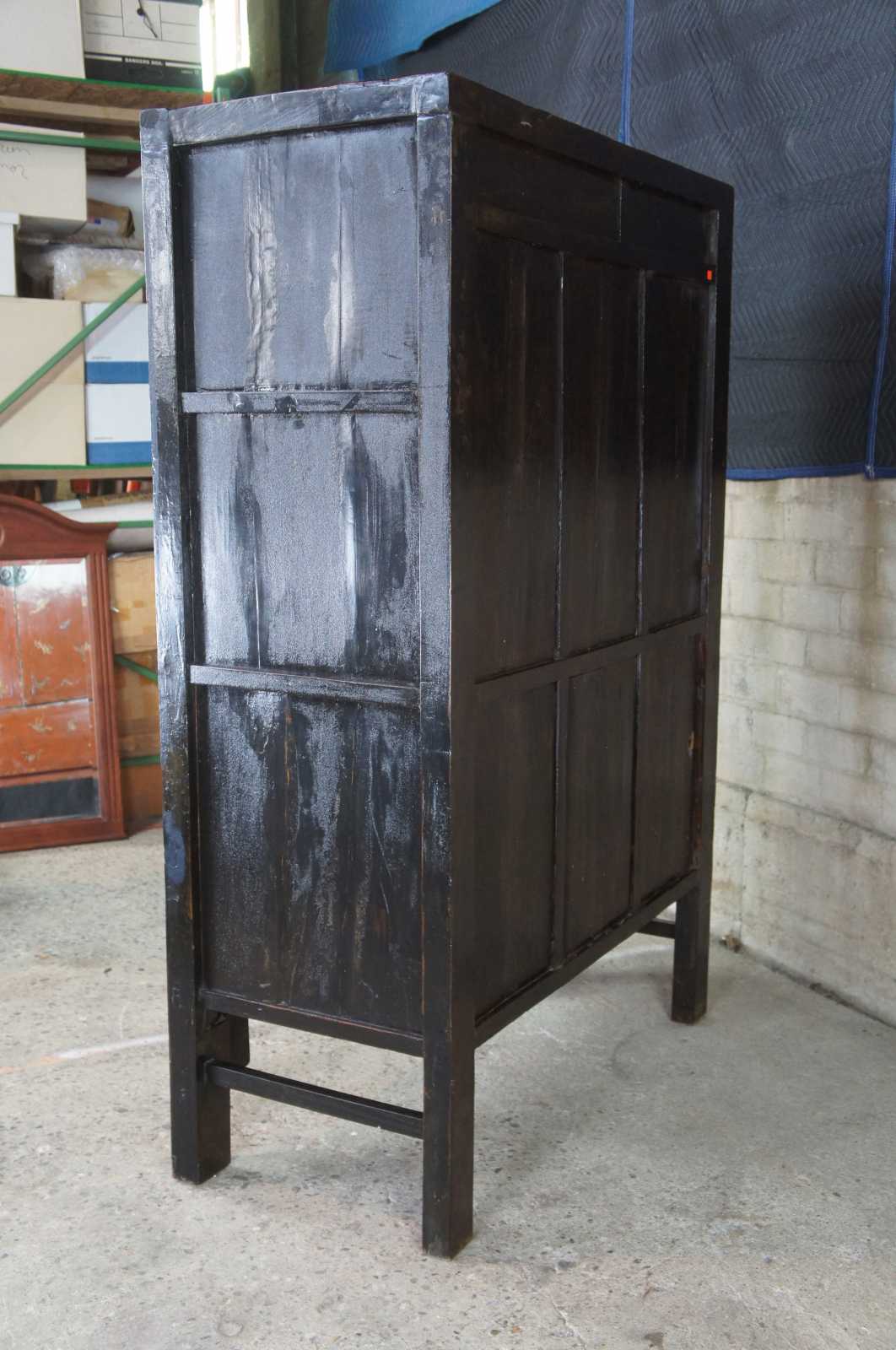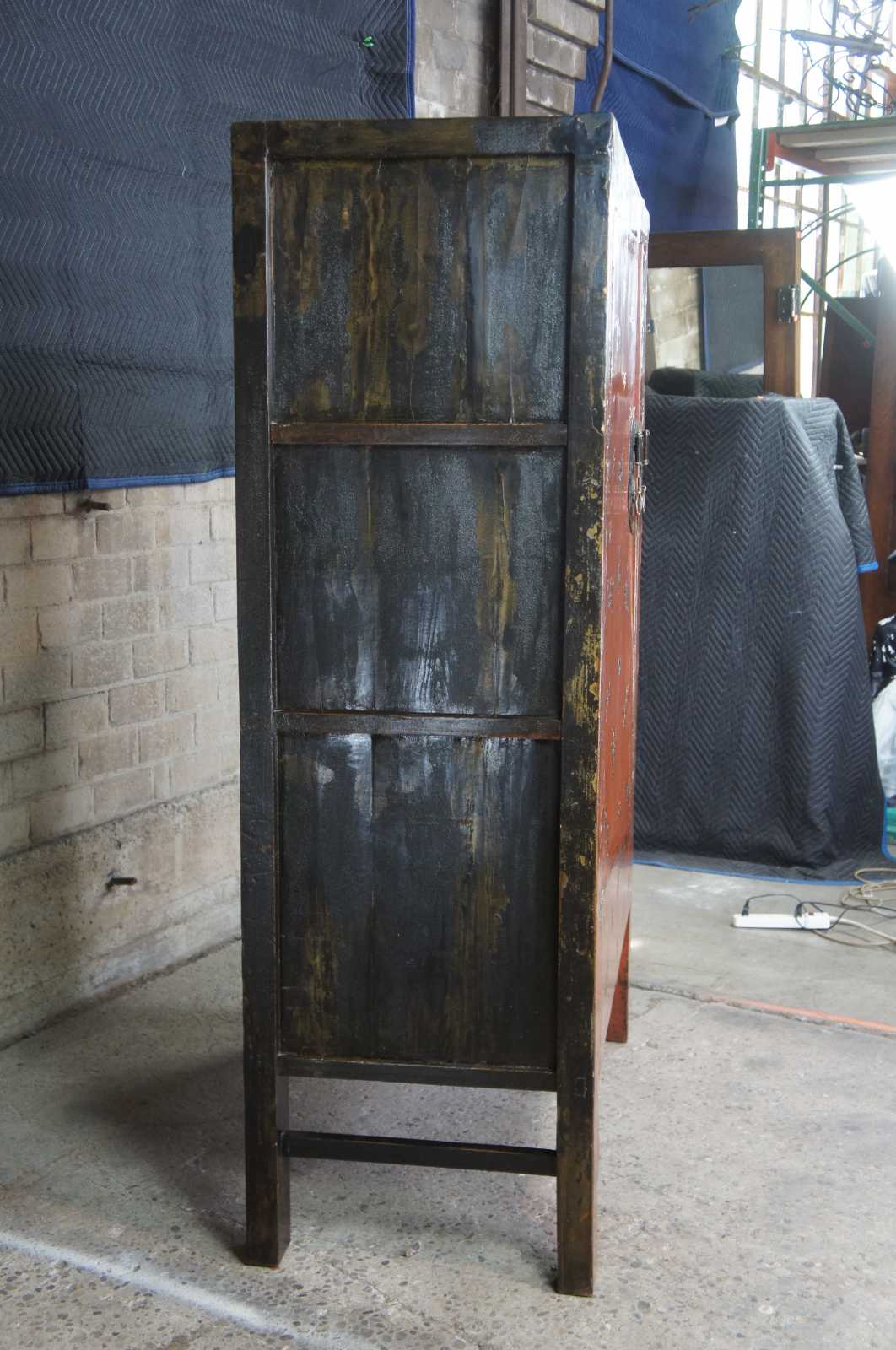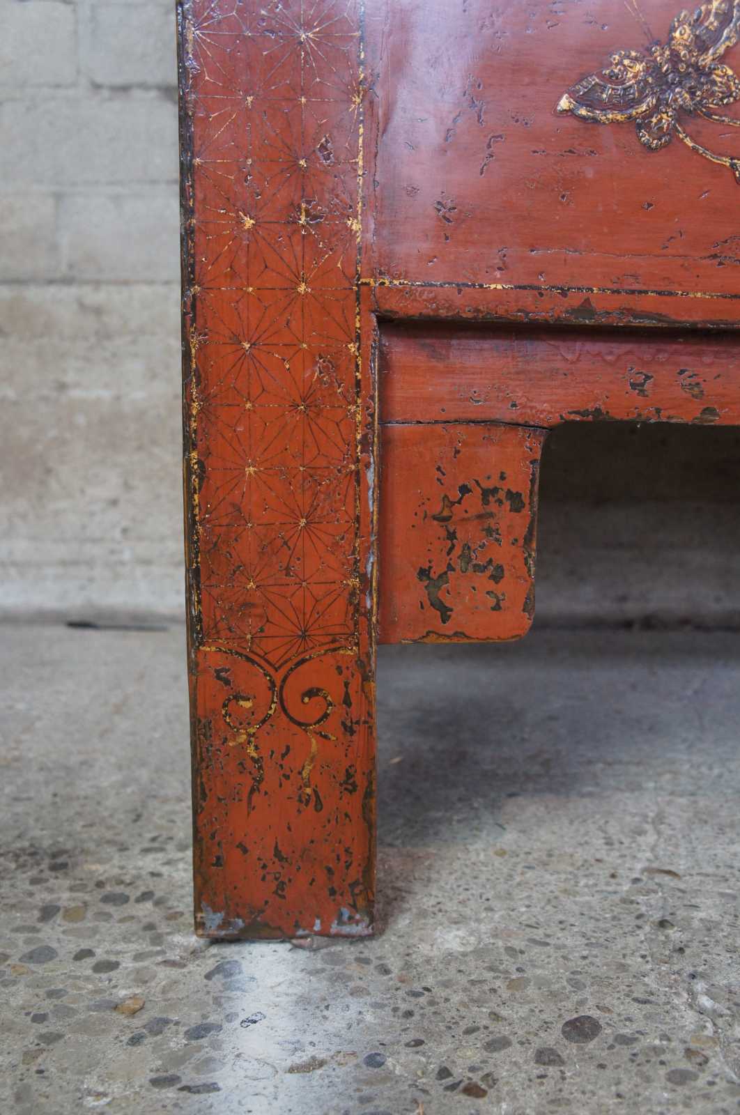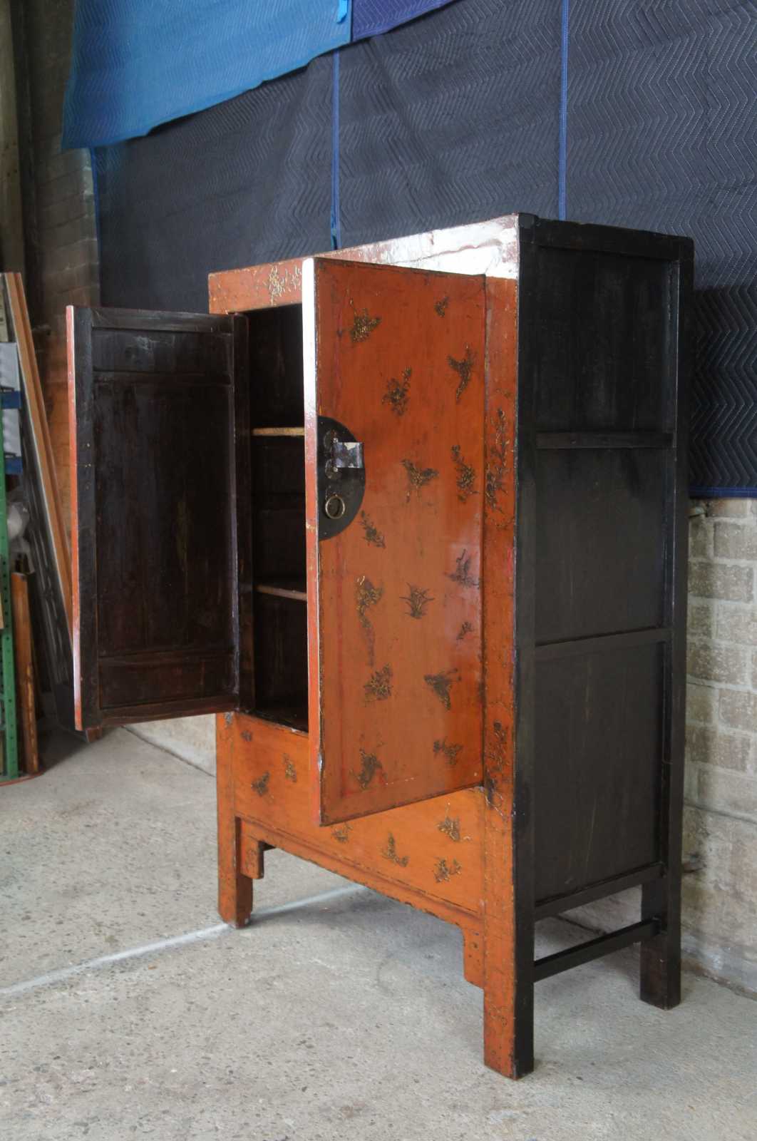 Antique 19th century Qing Dynasty wedding cabinet. Made from elm with red lacquer finish over dragonfly / butterfly motif. Features two shelves and hidden interior compartment.