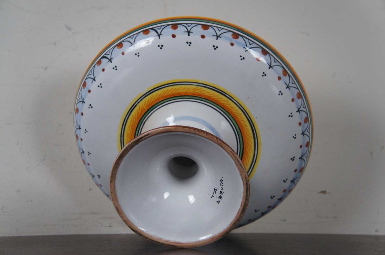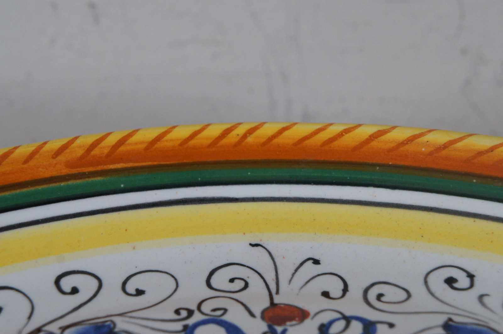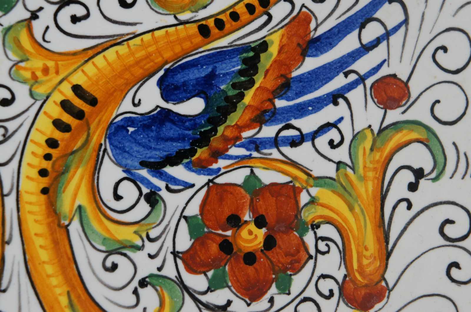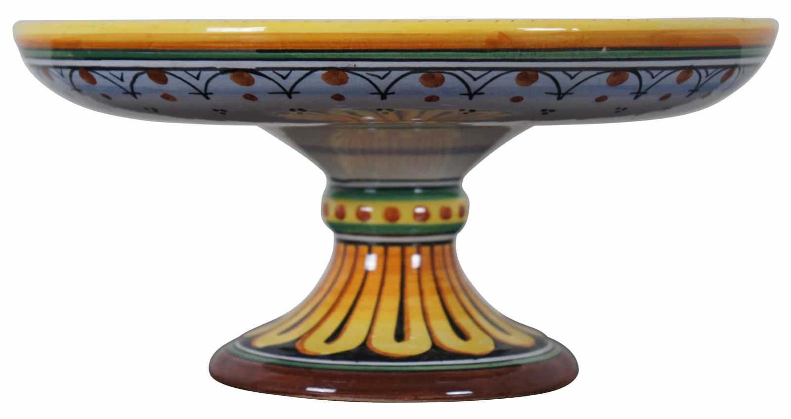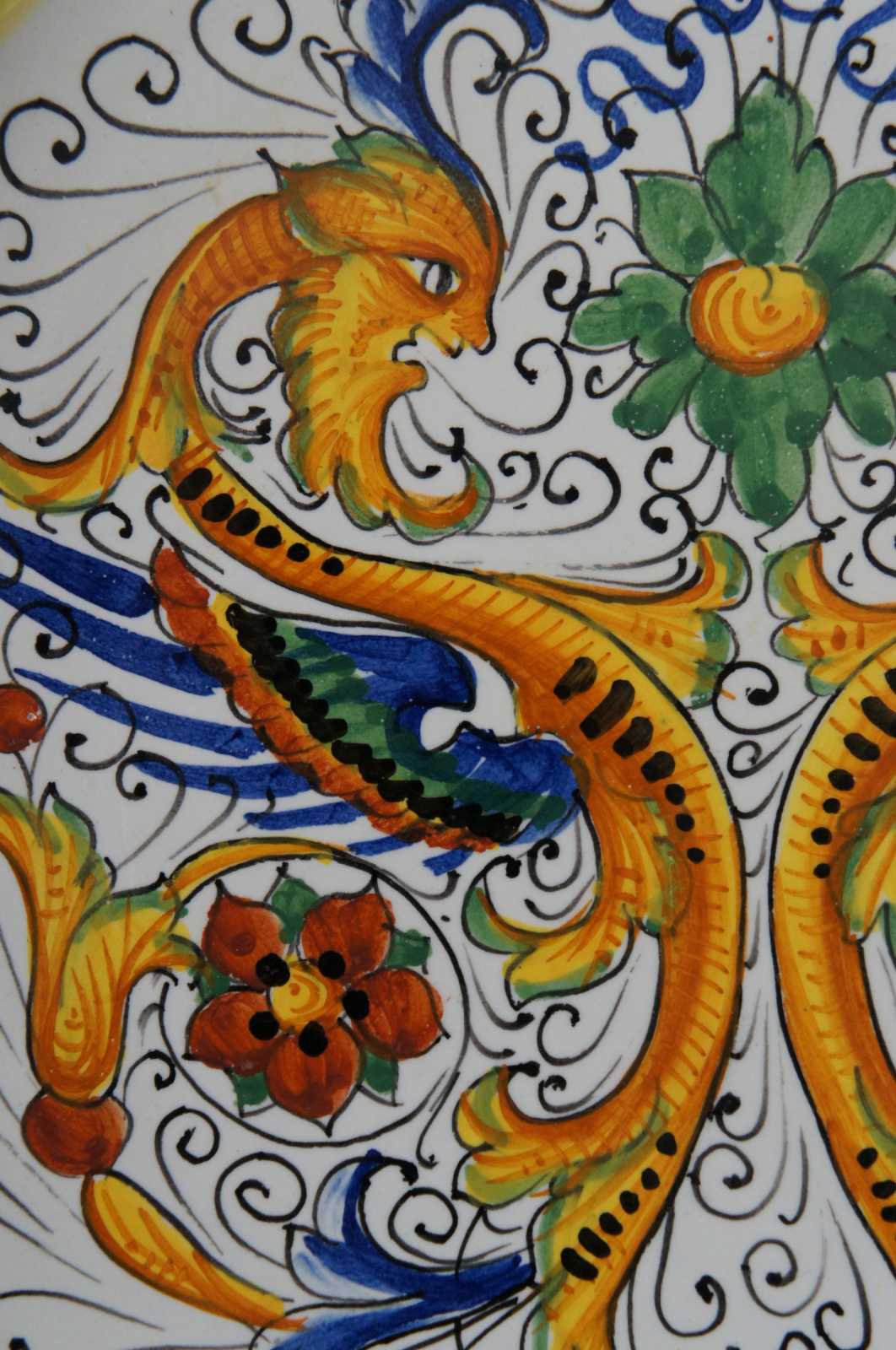 Hand made Deruta Italian pottery cake stand with Raffaellesco dragons.“Among the most popular and enduring Italian majolica patterns, the classic “Raffaellesco” traces its origin to 16th century, and the graceful arabesques of Raphael's famous frescoes.