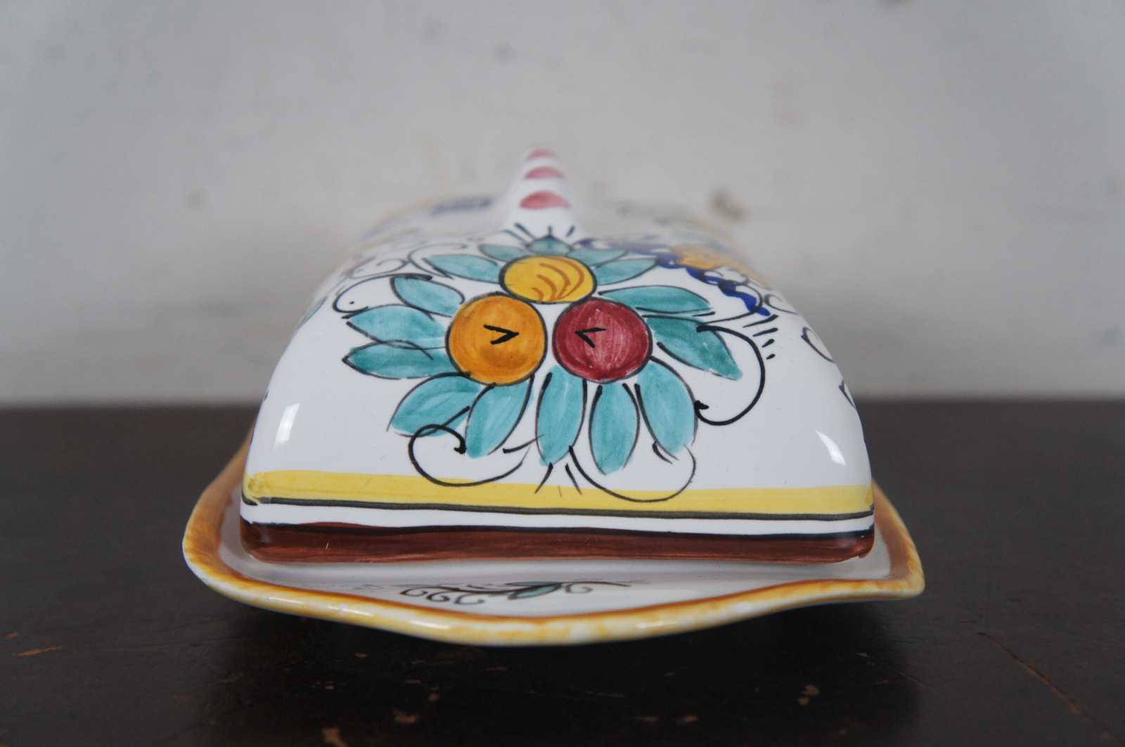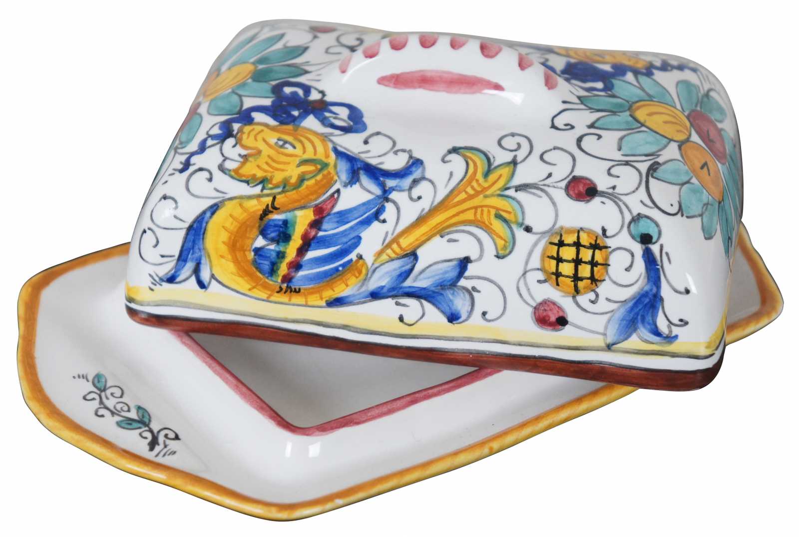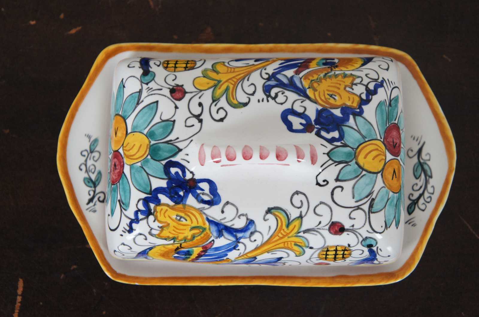 Hand made Deruta Italian pottery covered butter dish with Raffaellesco dragons.“Among the most popular and enduring Italian majolica patterns, the classic “Raffaellesco” traces its origin to 16th century, and the graceful arabesques of Raphael's famous frescoes.