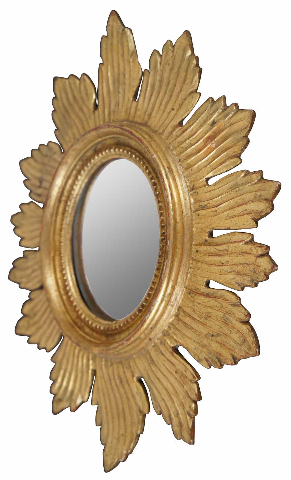 Small Palladio Italian giltwood wall mirror with Hollywood regency frame shaped like a sun.