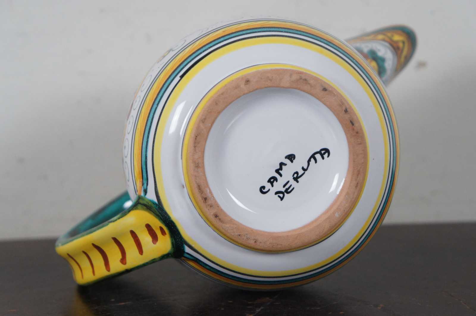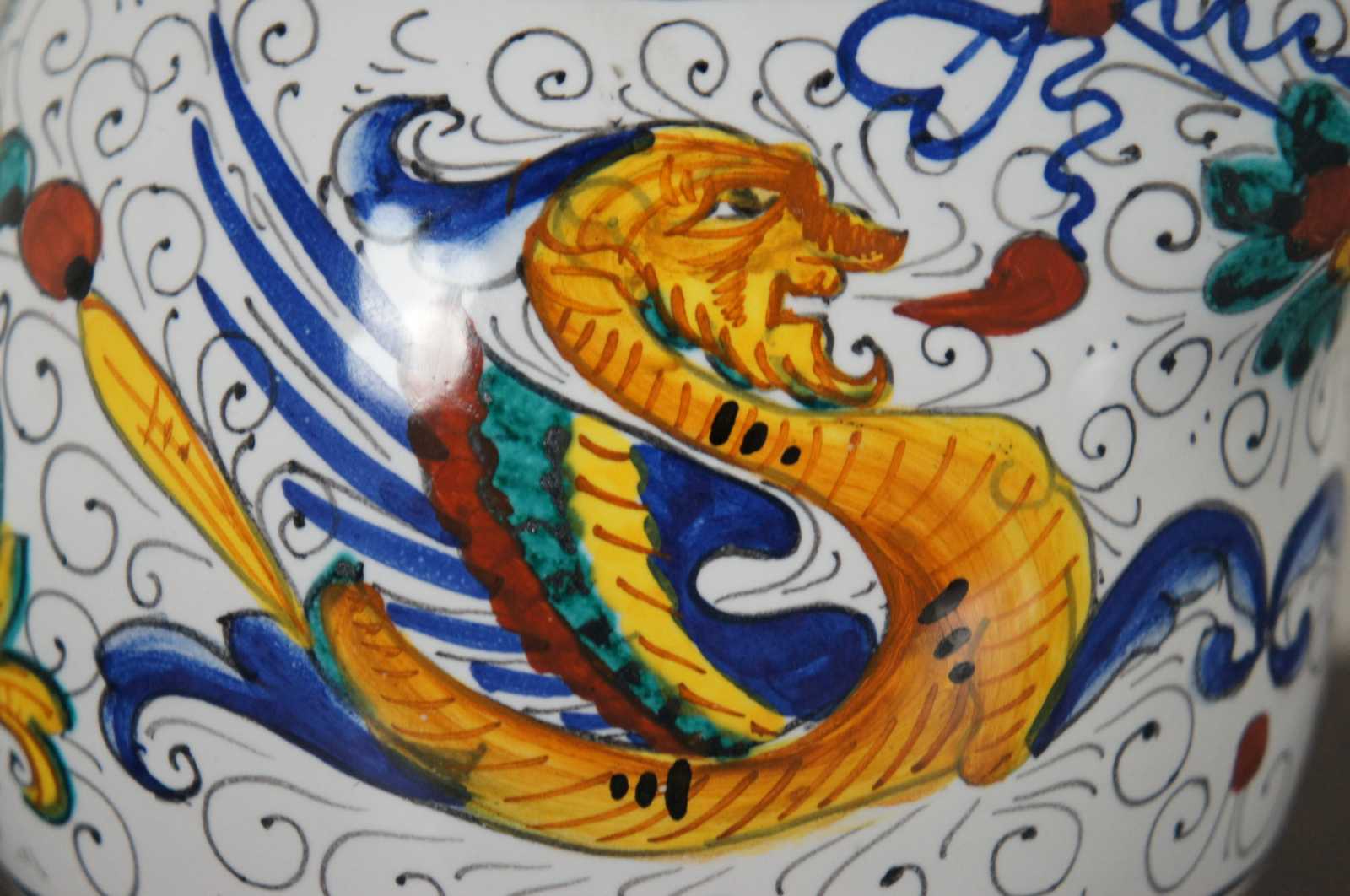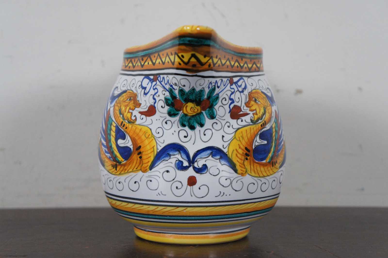 Vintage hand made Deruta, Italy majolica ceramic pitcher with long spout, painted with the Raffaellesco dragon. Hand made in Deruta Italy.