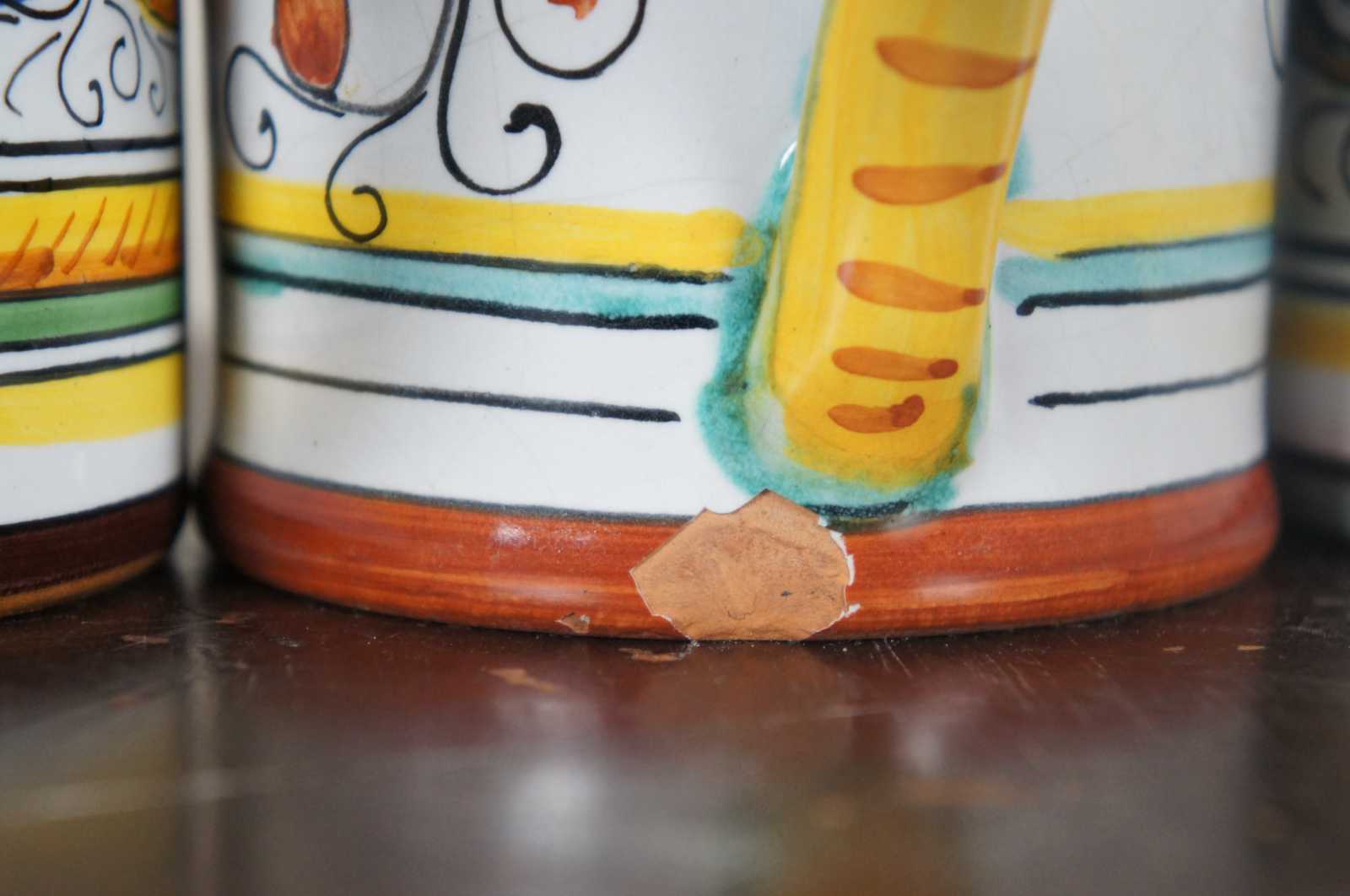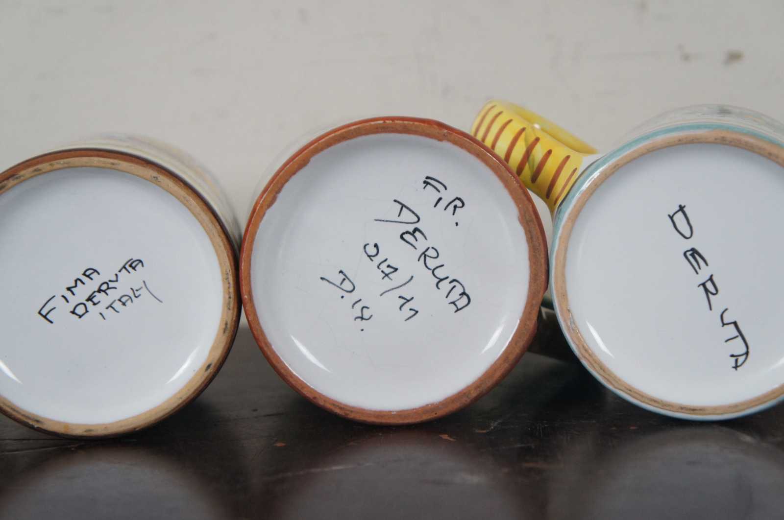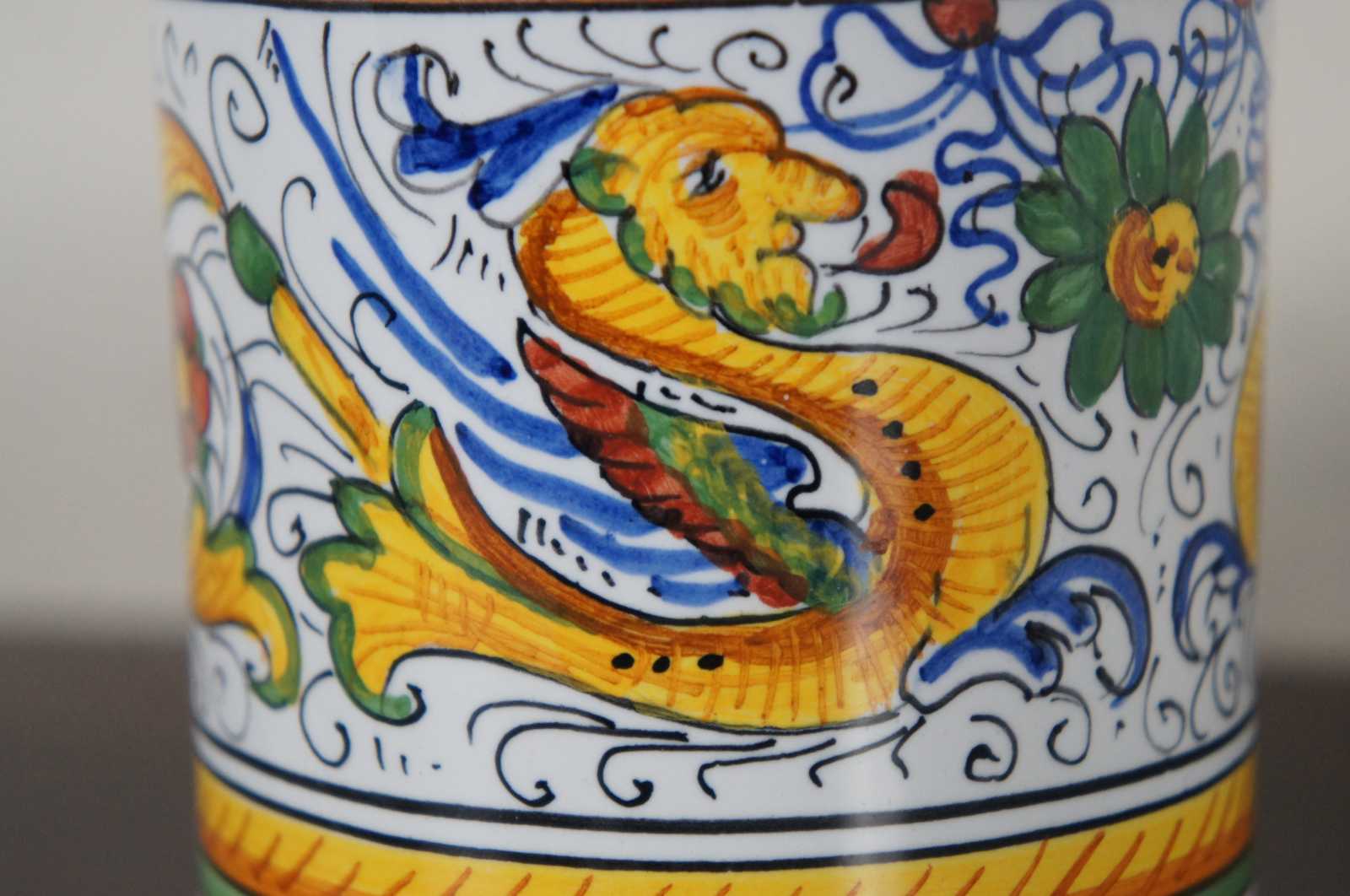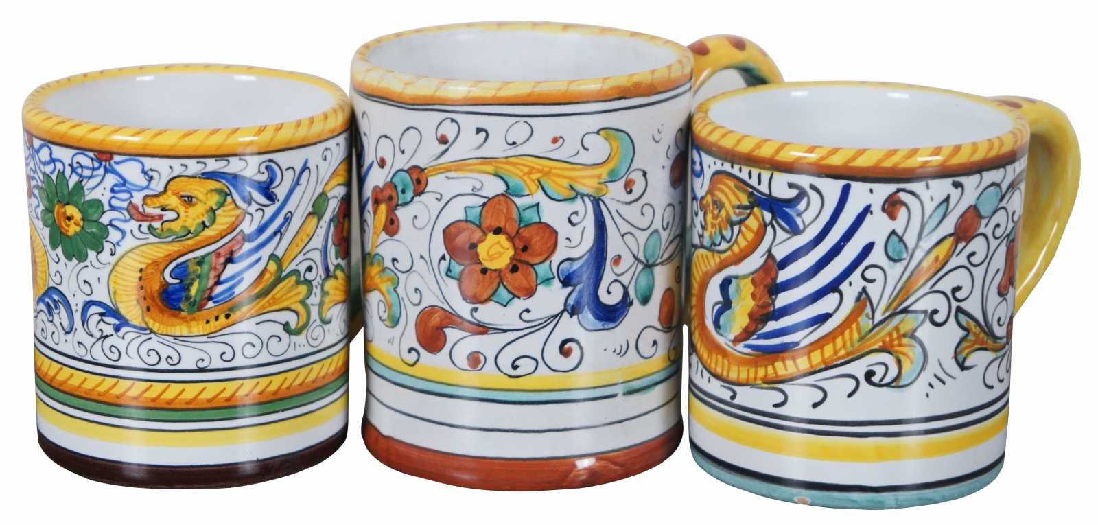 Vintage hand made Deruta, Italy, set of three majolica ceramic mugs, painted with the Raffaellesco dragon. Hand made in Deruta-Italy.
