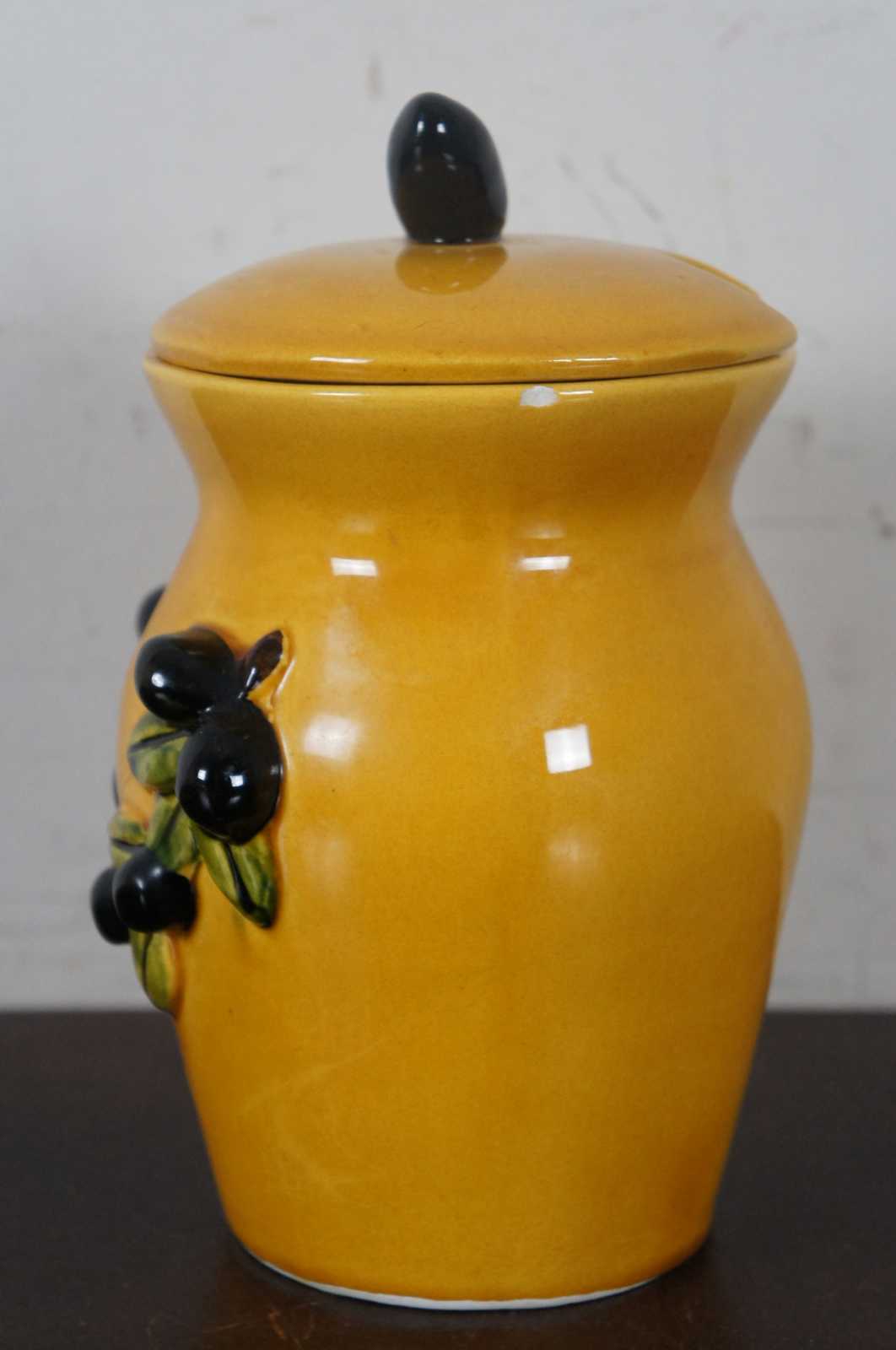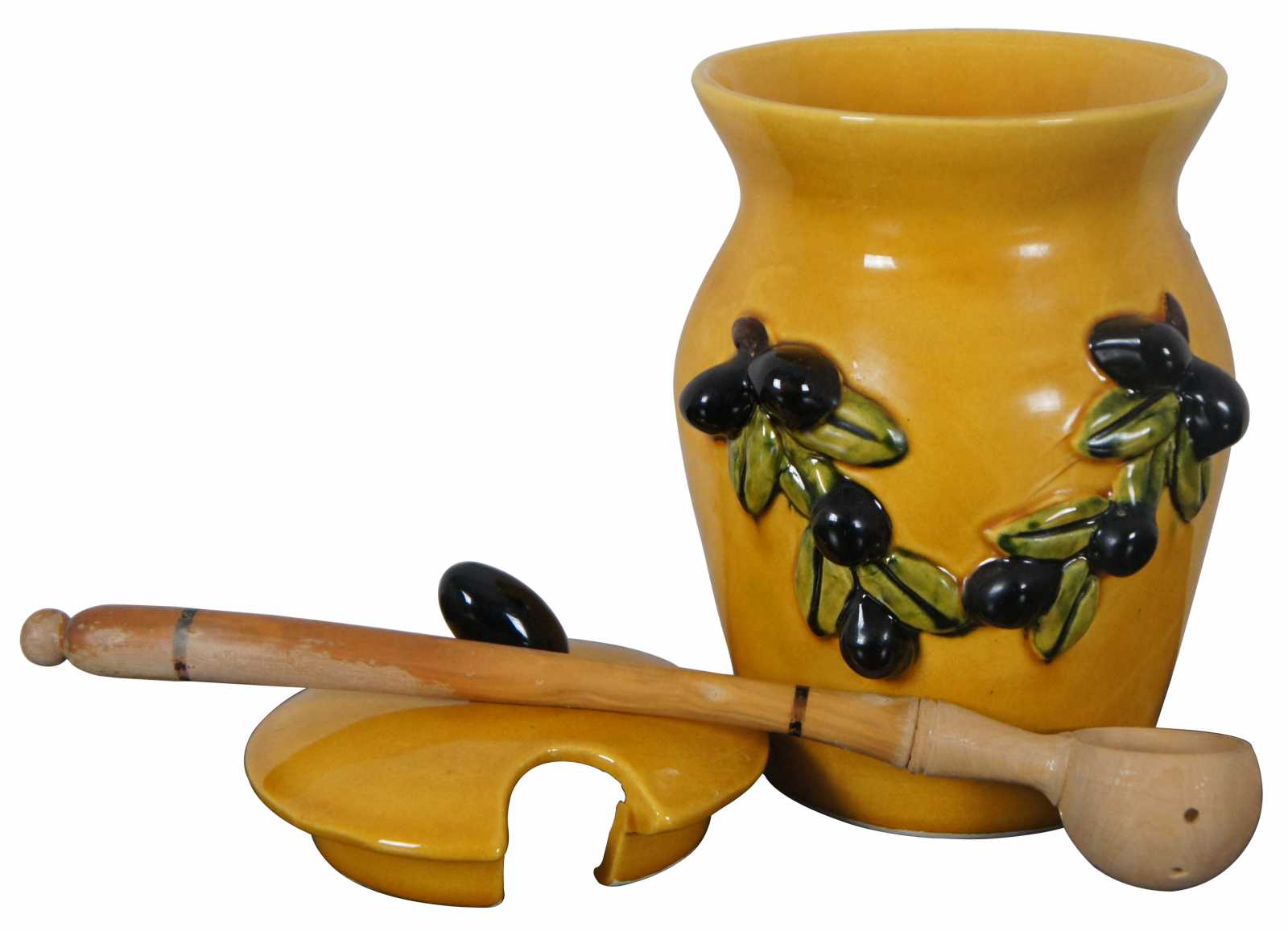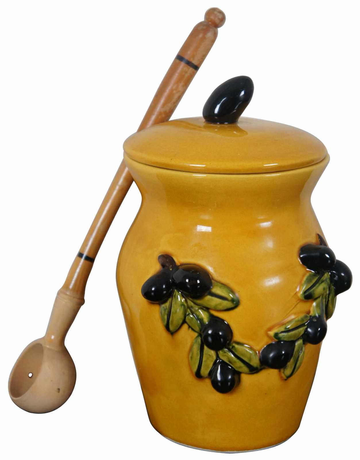 Vintage yellow ceramic olive jar with lid and wooden scoop, made in Vallauris, France.