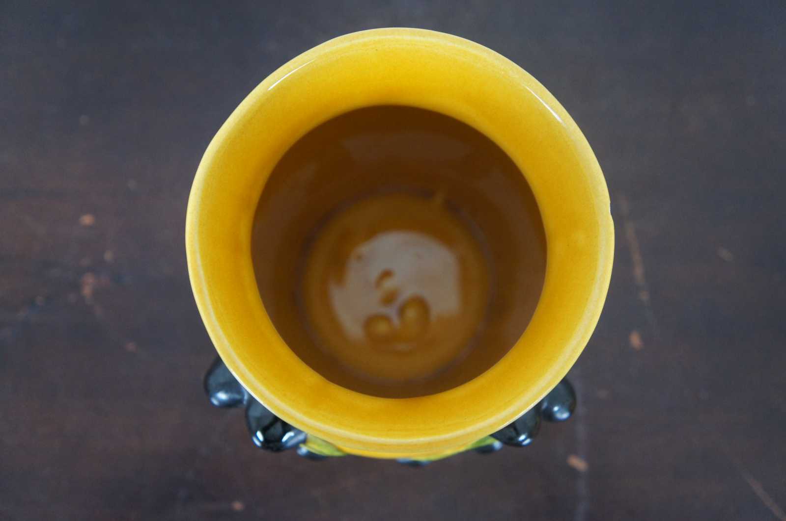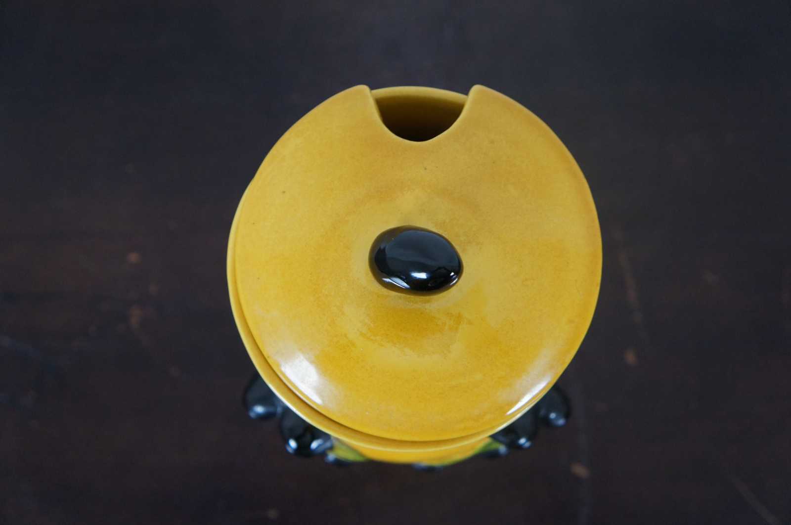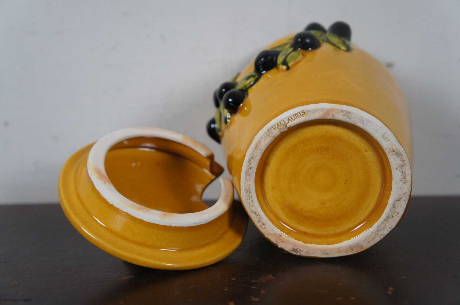 Vintage yellow ceramic olive jar with lid and wooden scoop, made in Vallauris, France.