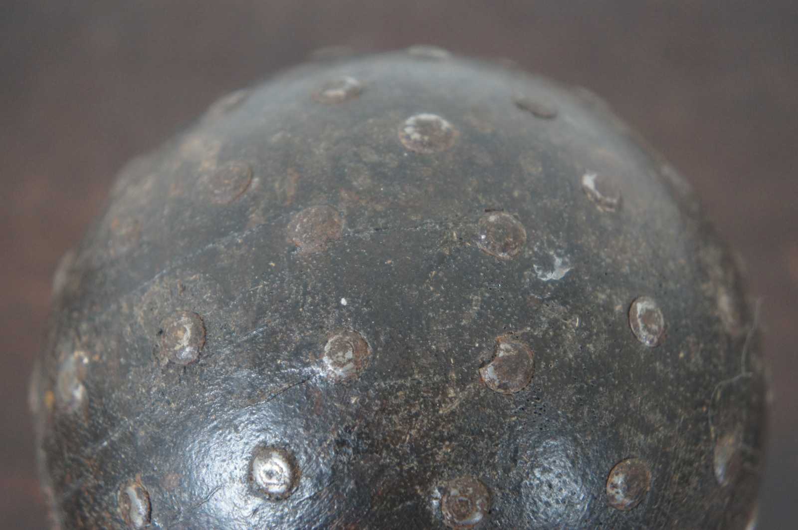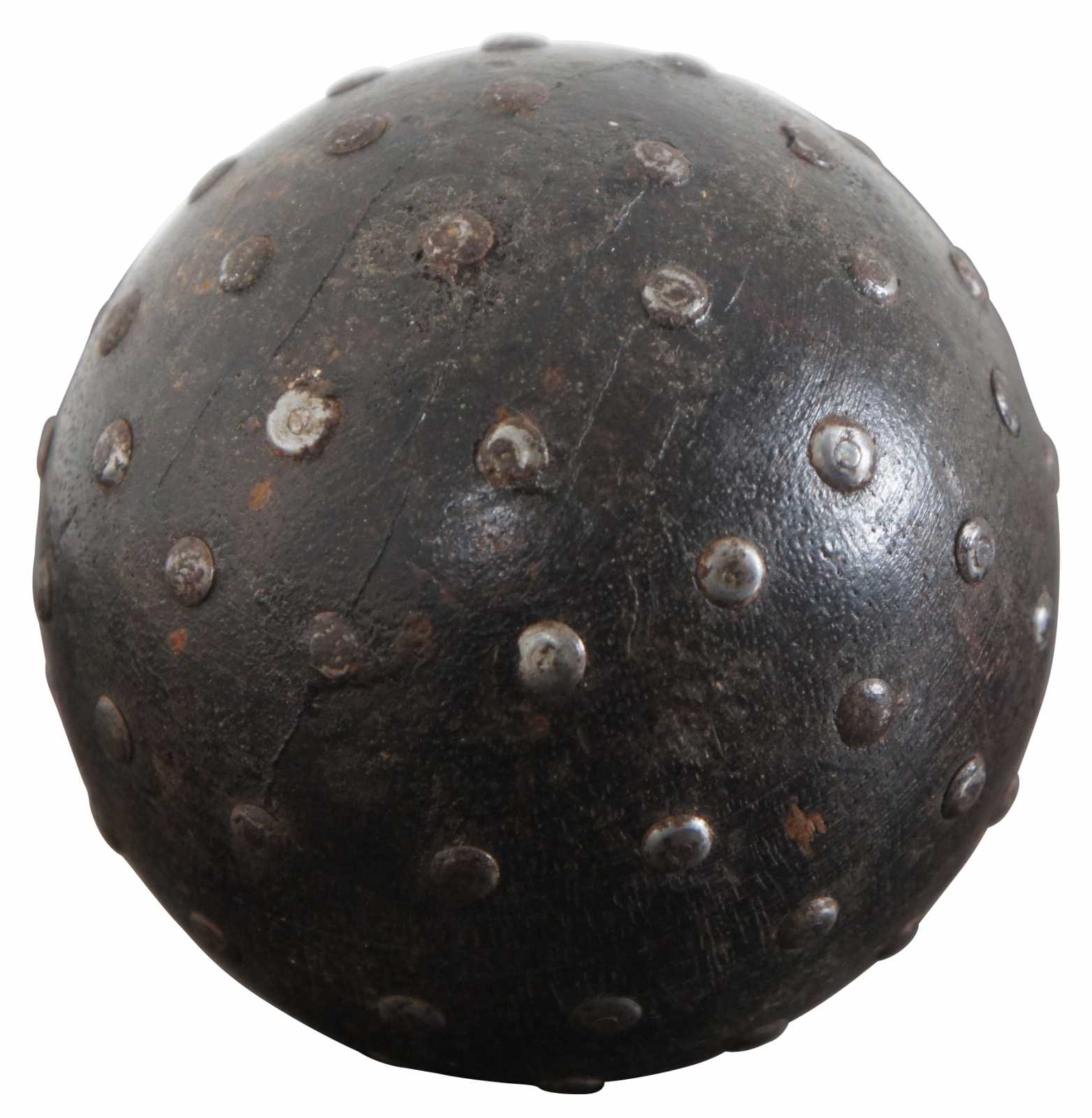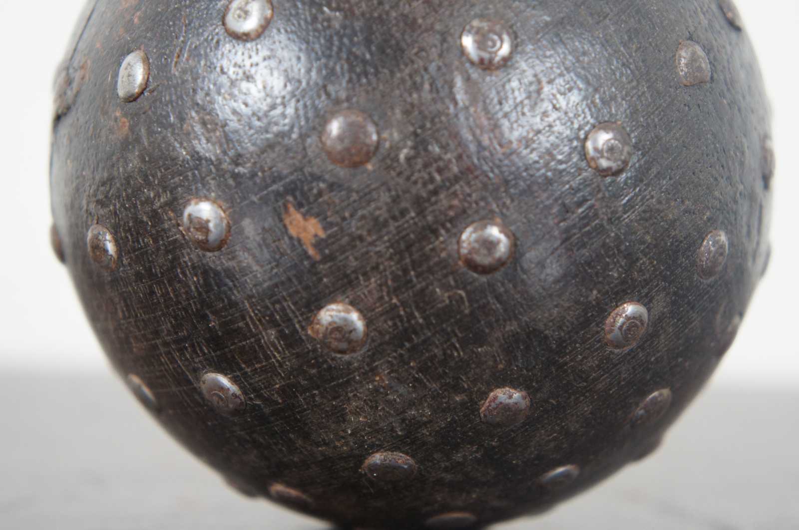 Vintage wooden ball partially studded with nails and painted brown.