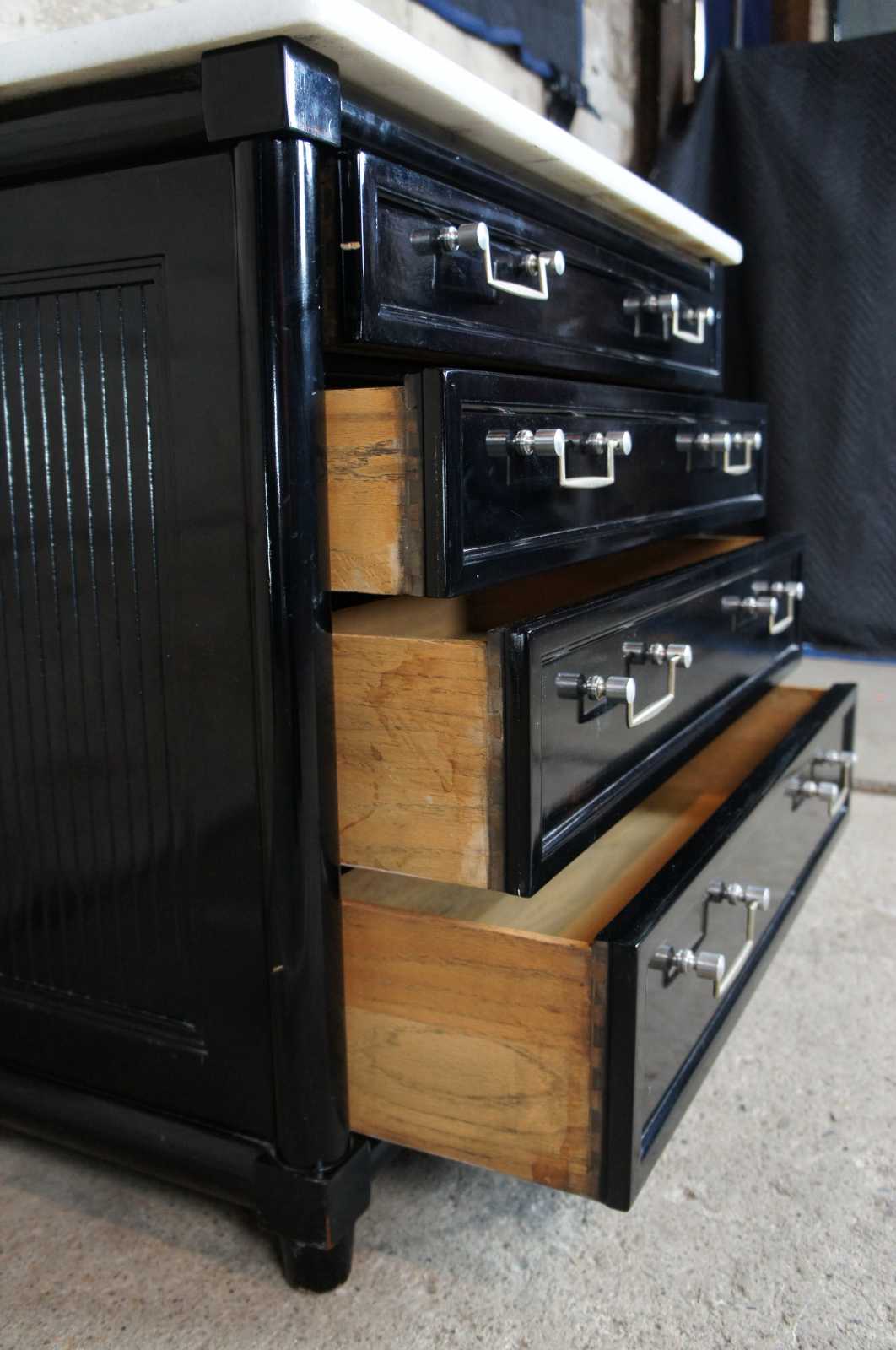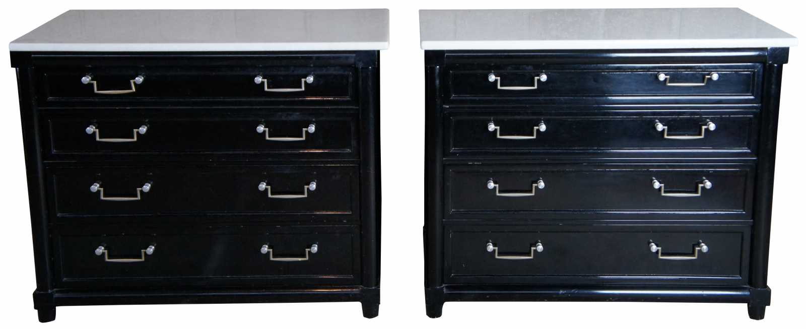 A neat pair of contemporary chests. Finished in black with 4 oak dovetailed drawers and a white marble top. Features fluted sides and silvertone bail style drawer pulls.