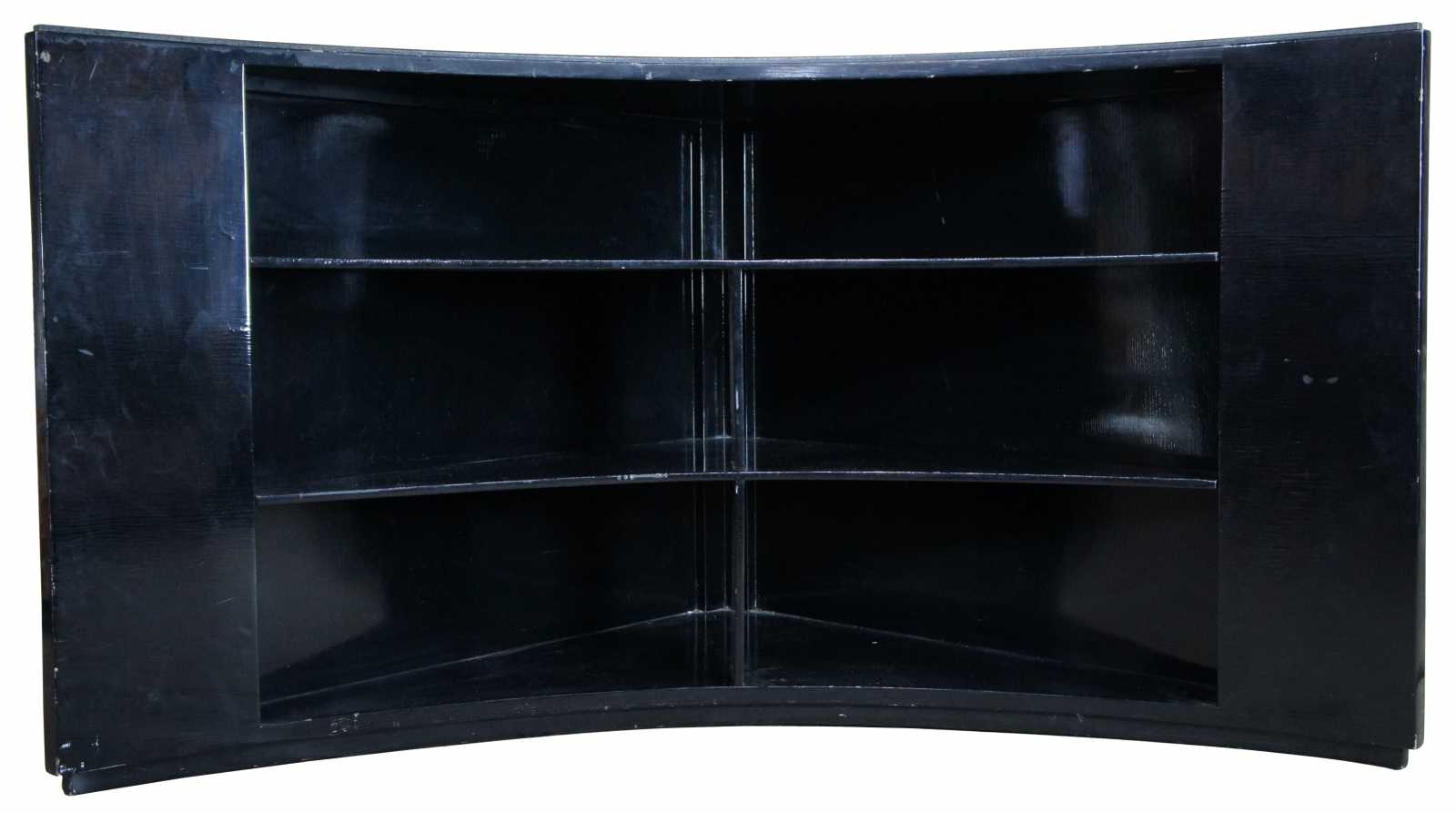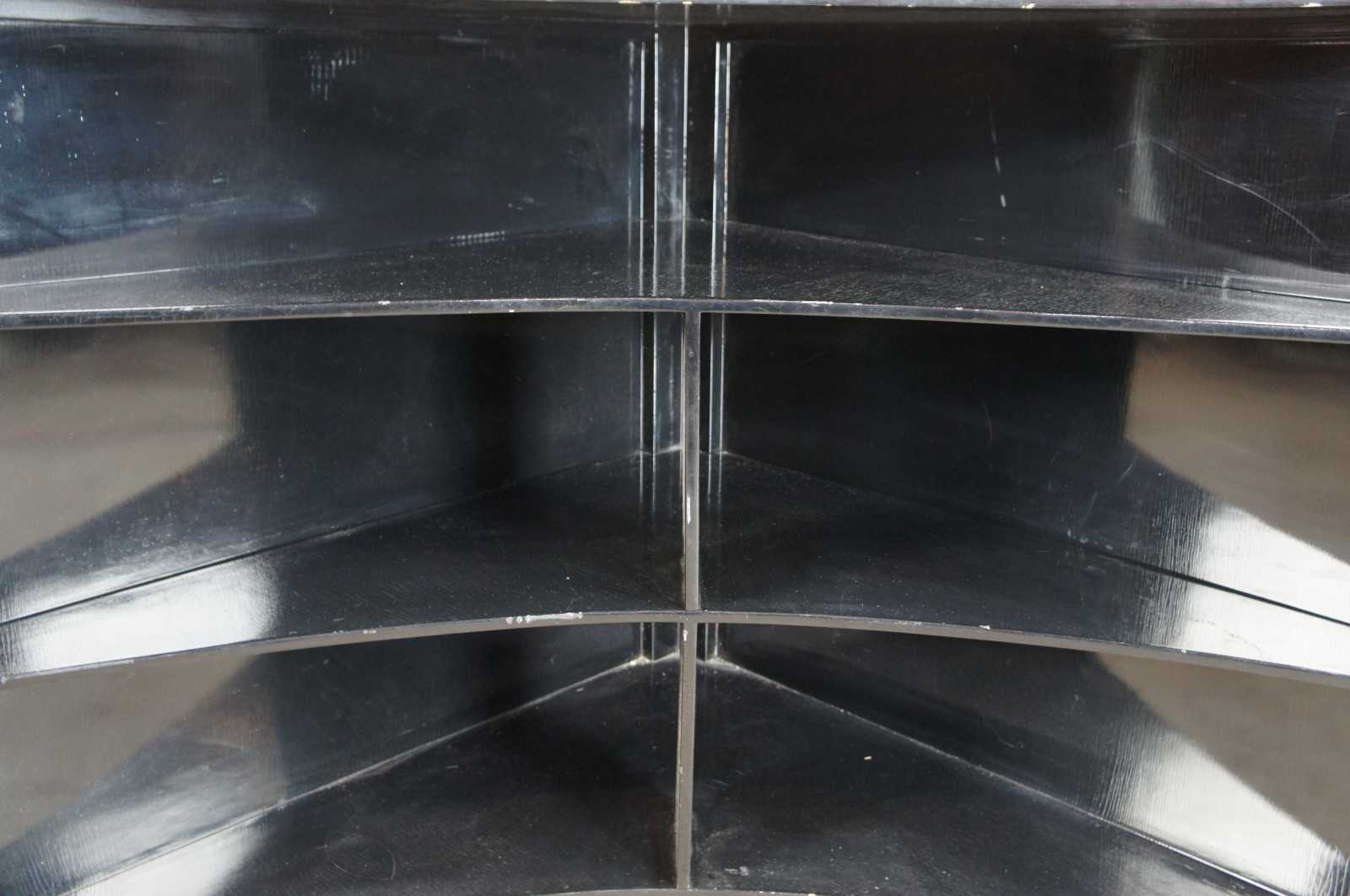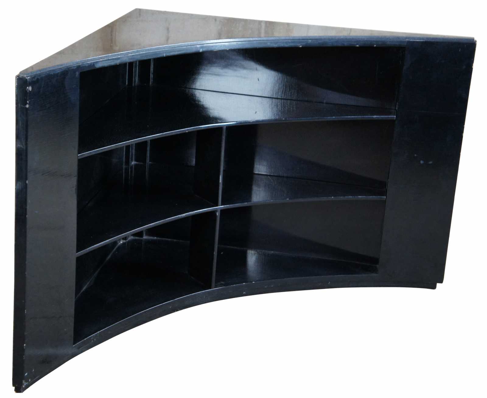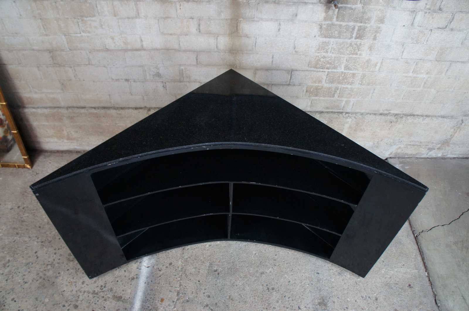 Vintage marble top corner console. Features black marble top and concave curved front with five shelves.