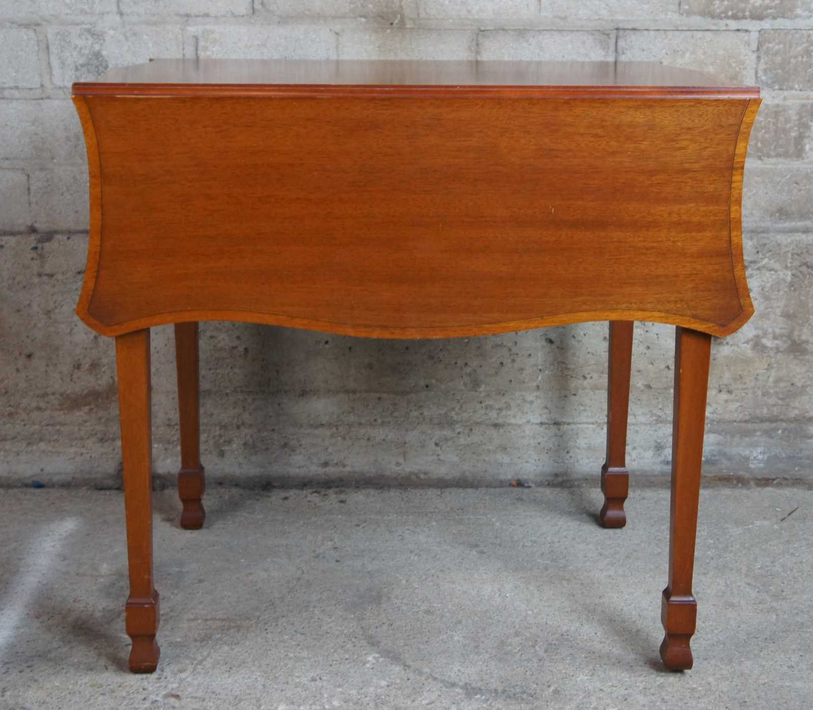 Pair of two vintage Nathan Margolis drop leaf tables. Made of mahogany, inspired by Federal and Hepplewhite styling with serpentine shape and square tapered legs. Features fluted accents,inlaid flowers and a hidden central drawer that can be opened using a groove underneath the drawer. Made by Harold Margolis.