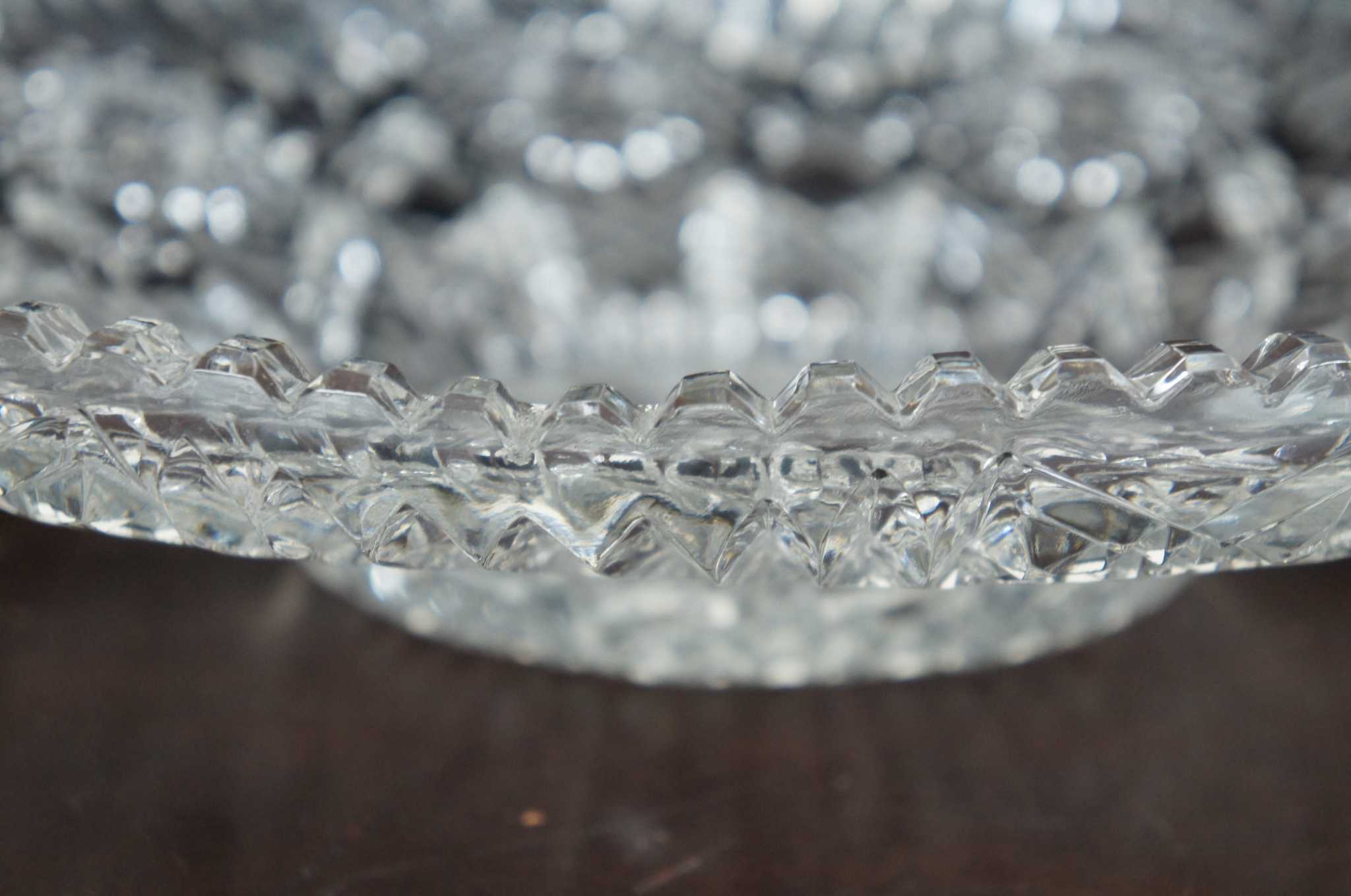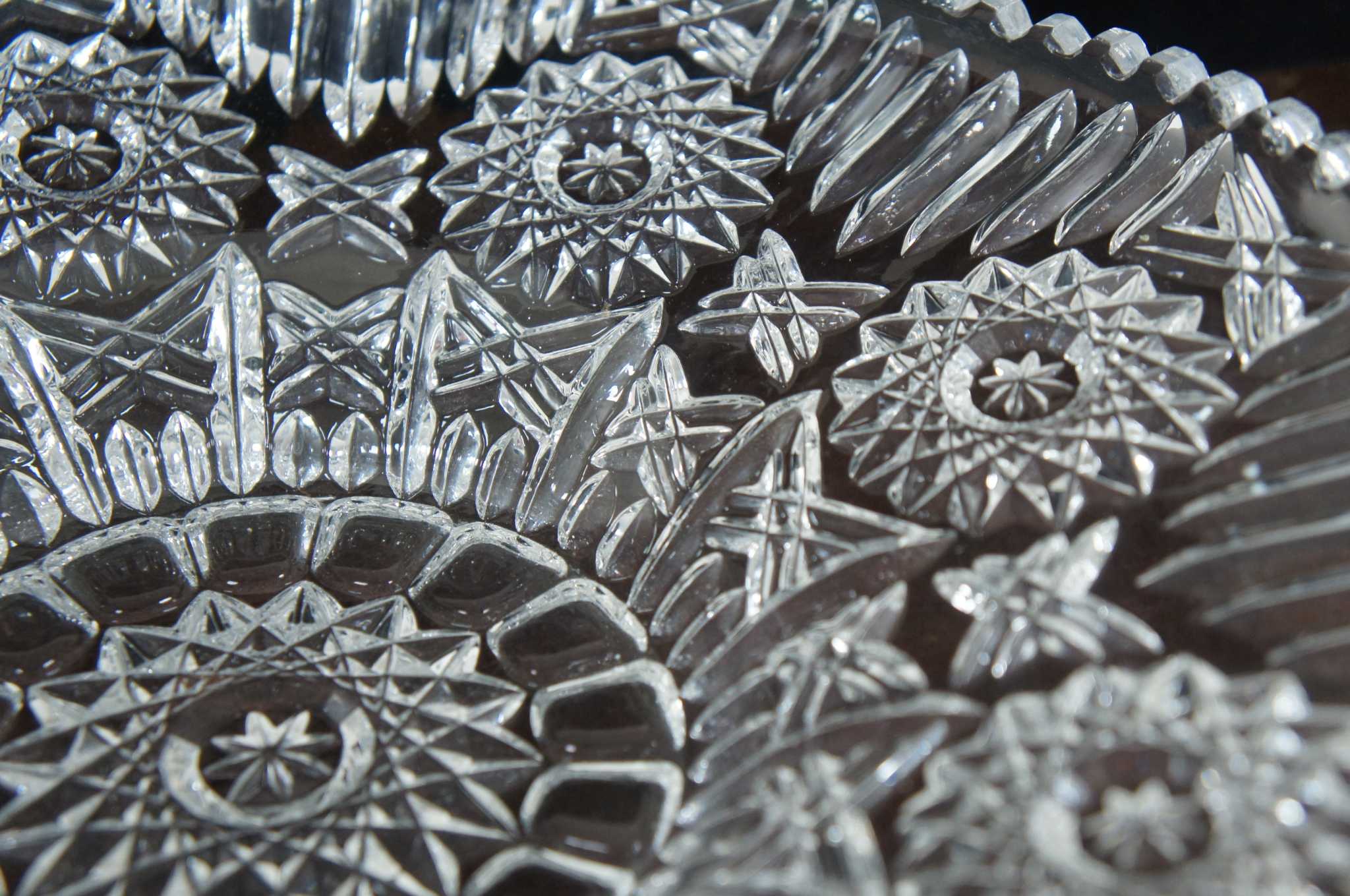 Vintage French cut crystal centerpiece. Features a heavy footed and shallow base with ornate pinwheel and star cuts and scalloped sawtooth rim.