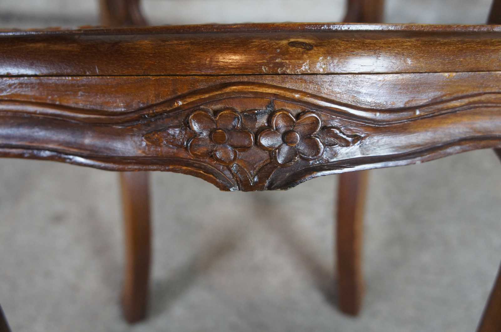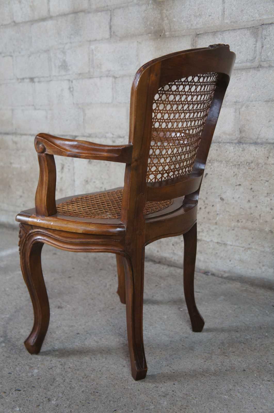 Exquisite antique child or doll size French Arm Chair. Made from walnut with meticulous detail. Features carved floral embelishments, cabriole legs, hand cane seat and back.