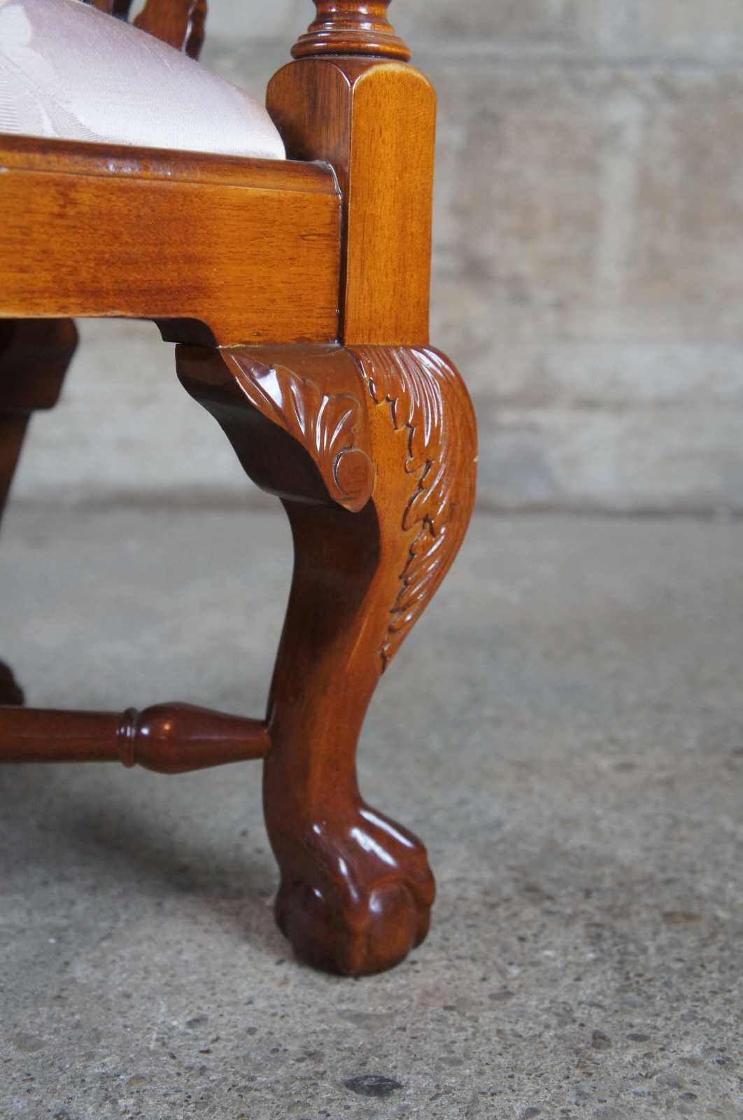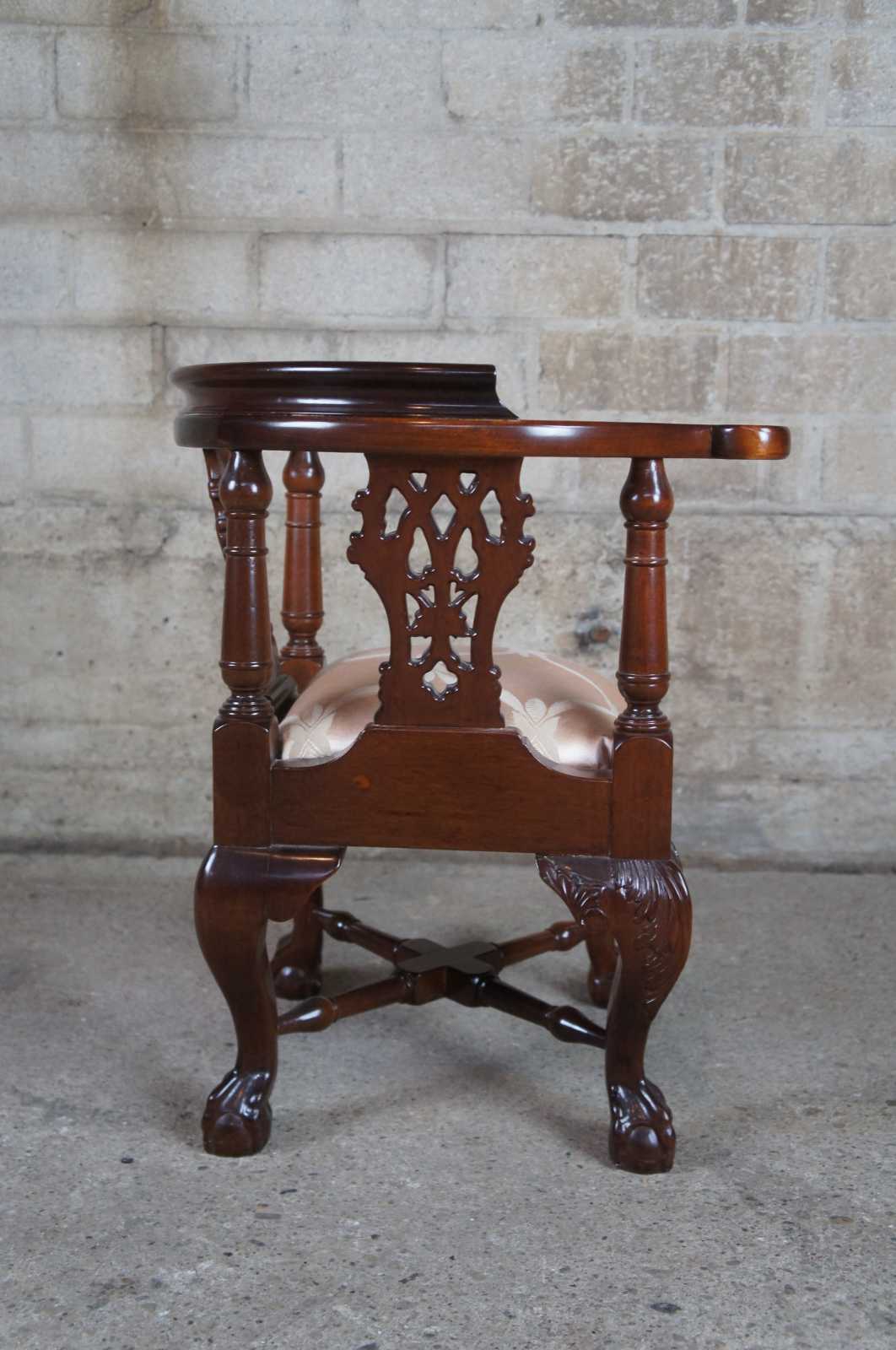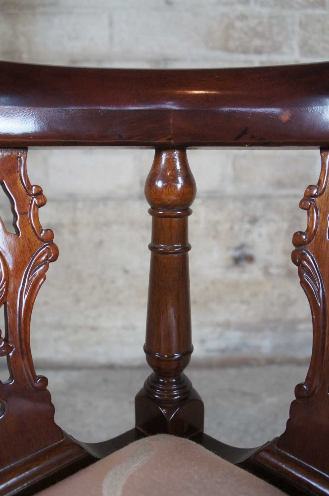 Late 20th century chippendale child or dolls chair. Made exclusively for Georgian Furnishing Co., LTD. in New Orleans, LA. Made from Mahogany with a curved rail over pierced splats and turned supports. Upholstered with a pink seat in classic french design. The chair is supported by acanthus carved legs connected via and X stretcher and ball and claw feet.