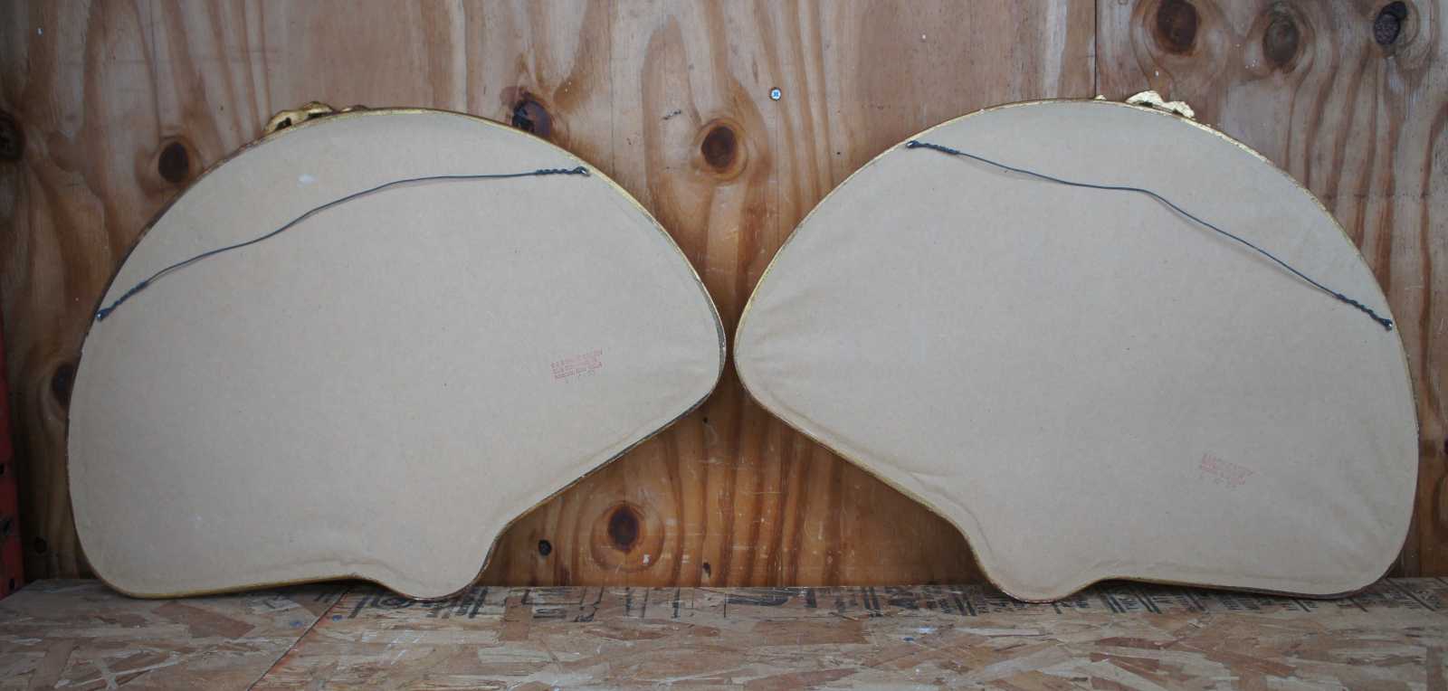 Two 20th century vintage hand painted French Eventail fan shadowboxes. Made of silk lace and celluloid featuring hand painted detail with scalloped form, reticulated / pierced ribbon design, and neoclassical pastoral music scene and floral (flowers) scene. Framed in ornate gold gilded frames with fan shape and ribbon finial. Framed in 1983.