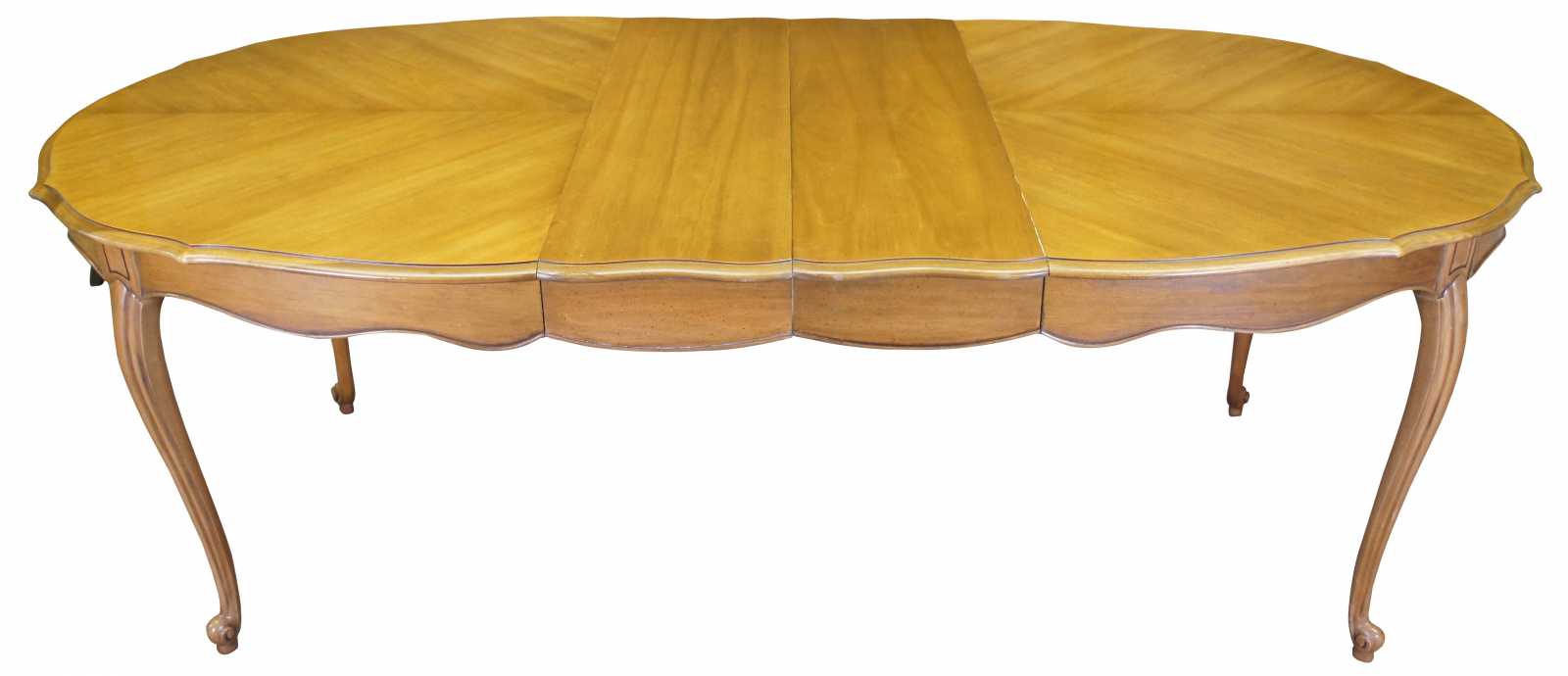 Mid 20th century French Provincial dining table. Made from walnut with an oval form featuring a scalloped top with matchbook veneer ang long scrolled french legs. Extends to 101