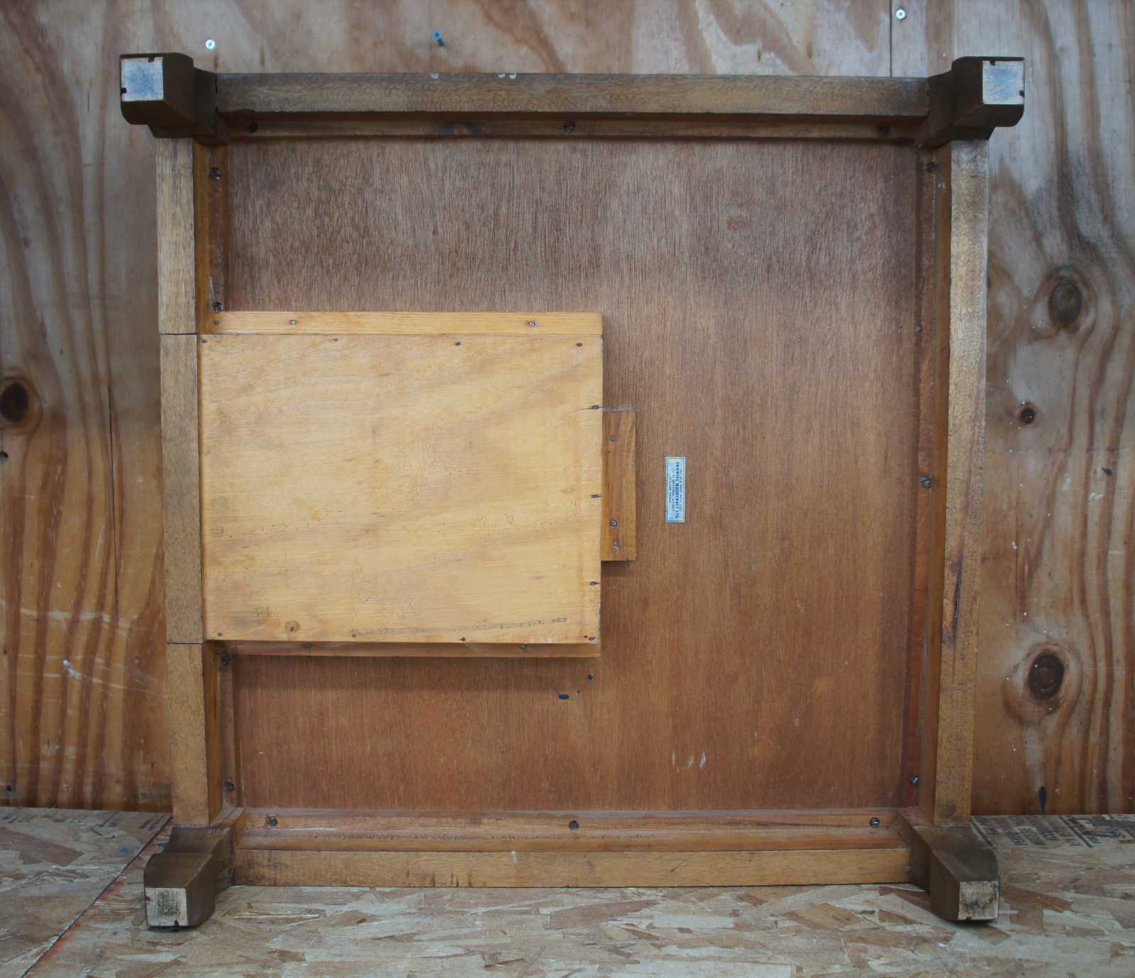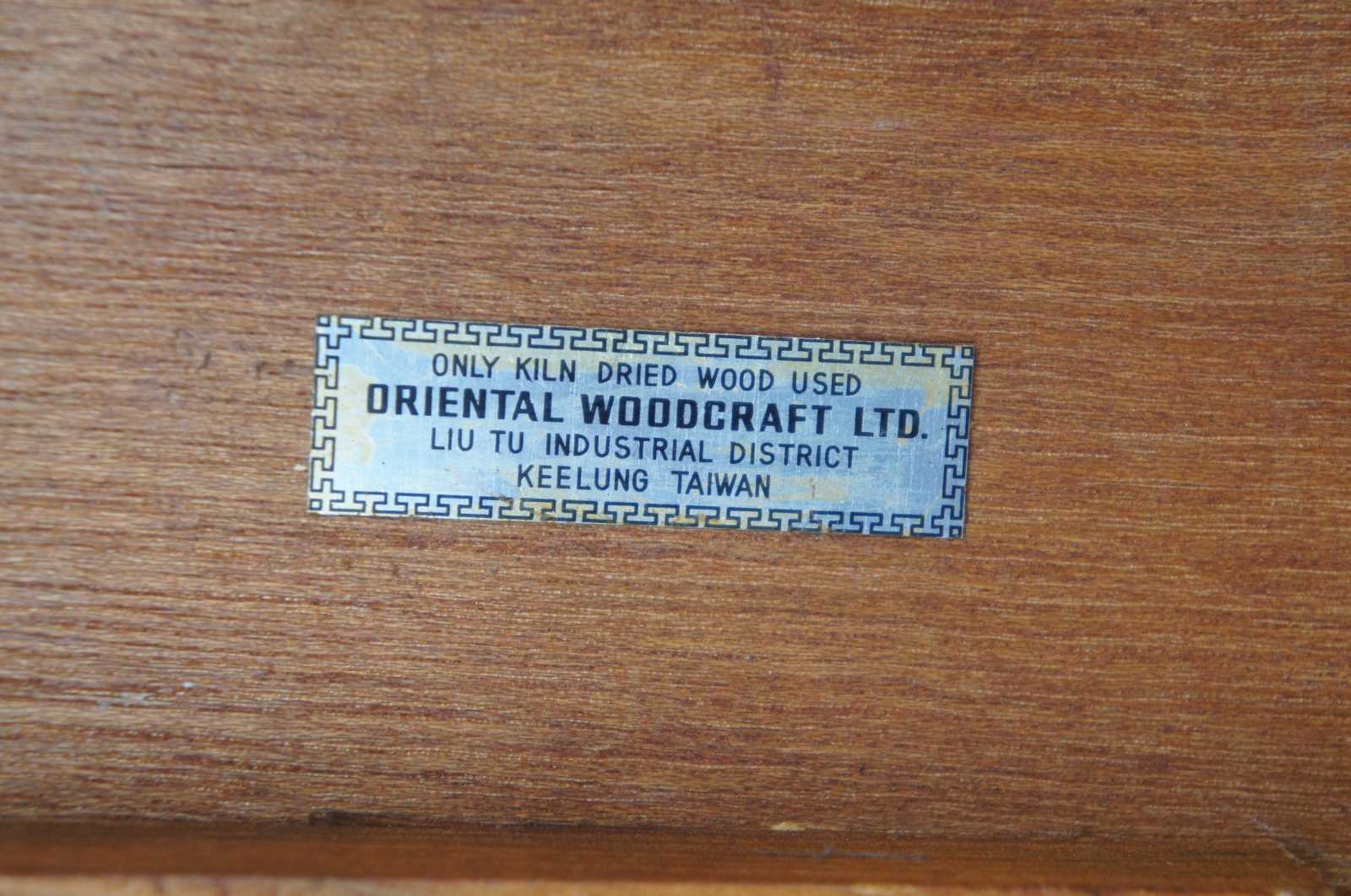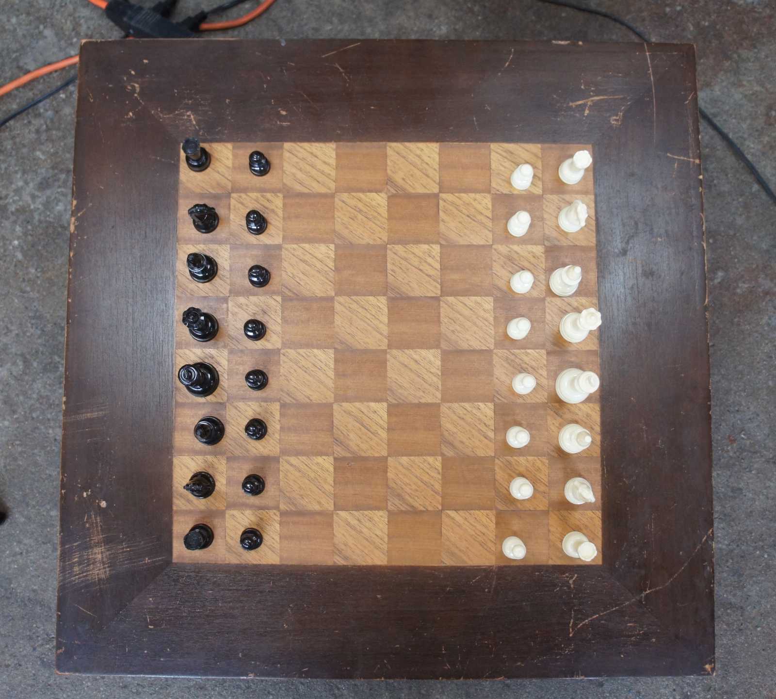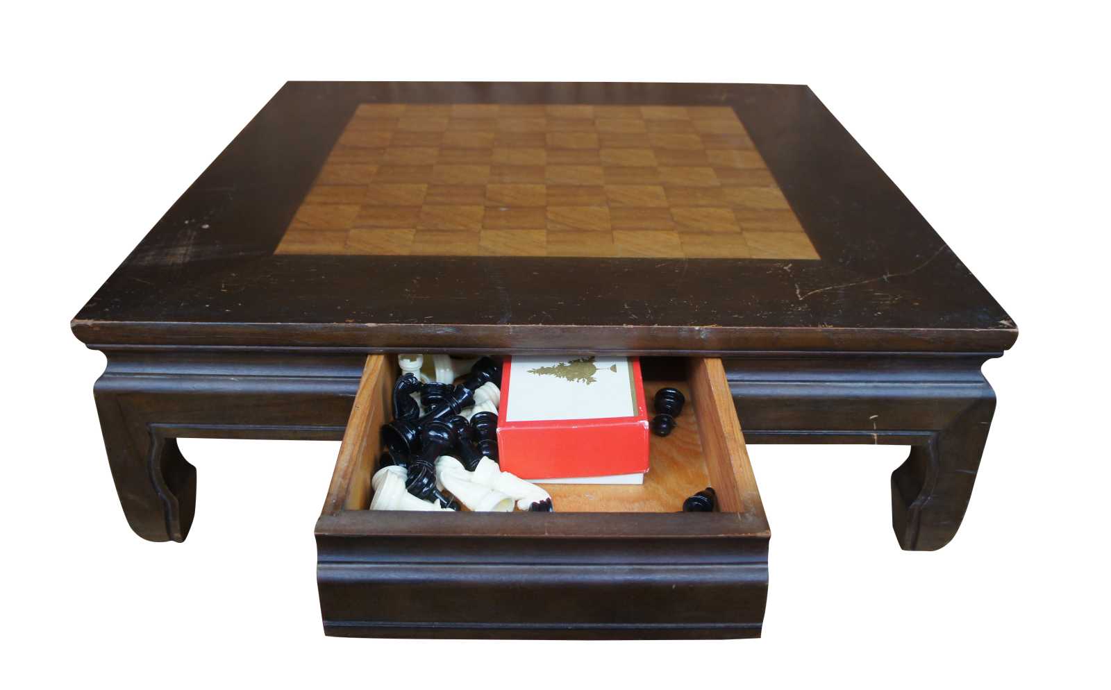 A handmade kiln dried hardwood tabletop chess board with ming styling featuring a sliding drawer that holds plastic chess and checkers pieces. Made in Keelung Taiwan by Oriental Woodcraft LTD.