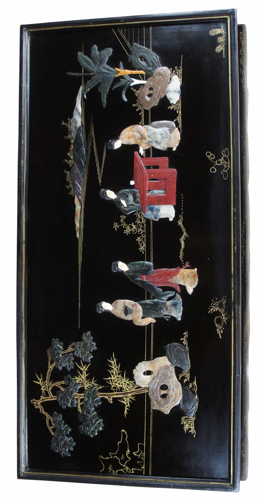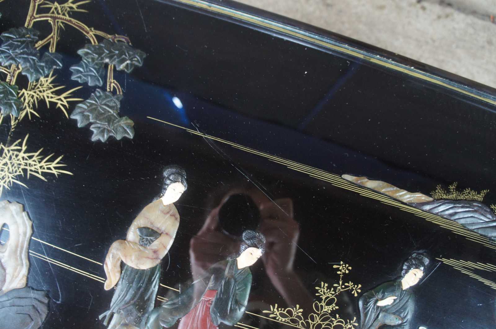 Vintage Chinese chinoiserie tea / coffee table. Carved and finished in black with soapstone geisha scenes and gold accents with greek key and florals with serpentine base and cabriole legs.